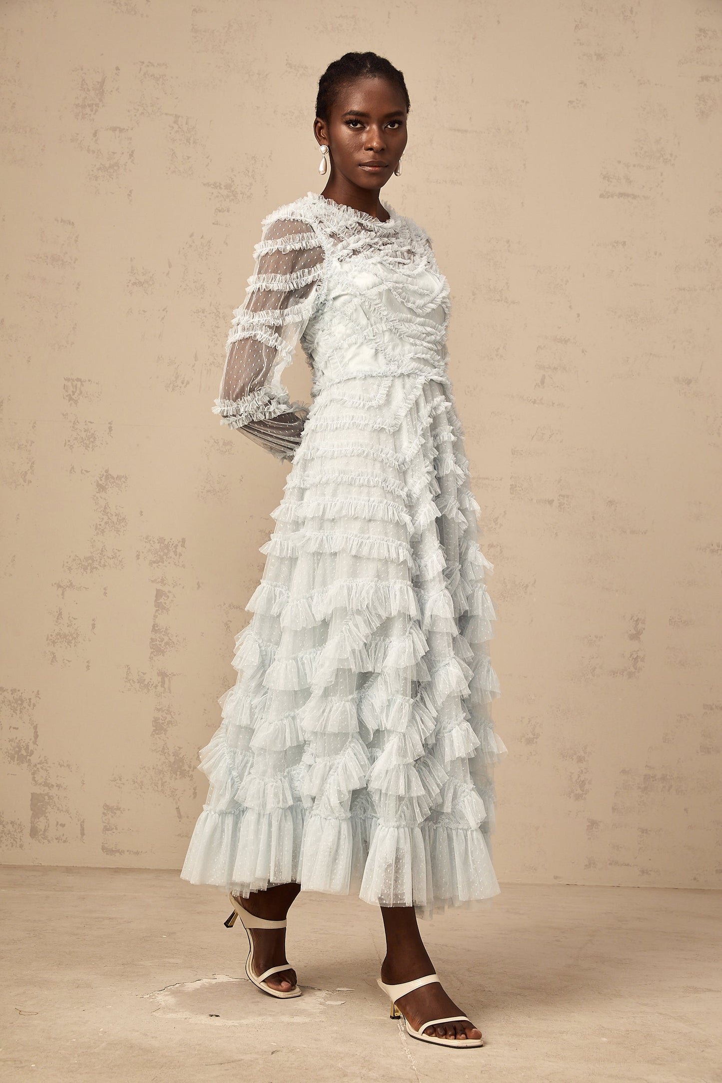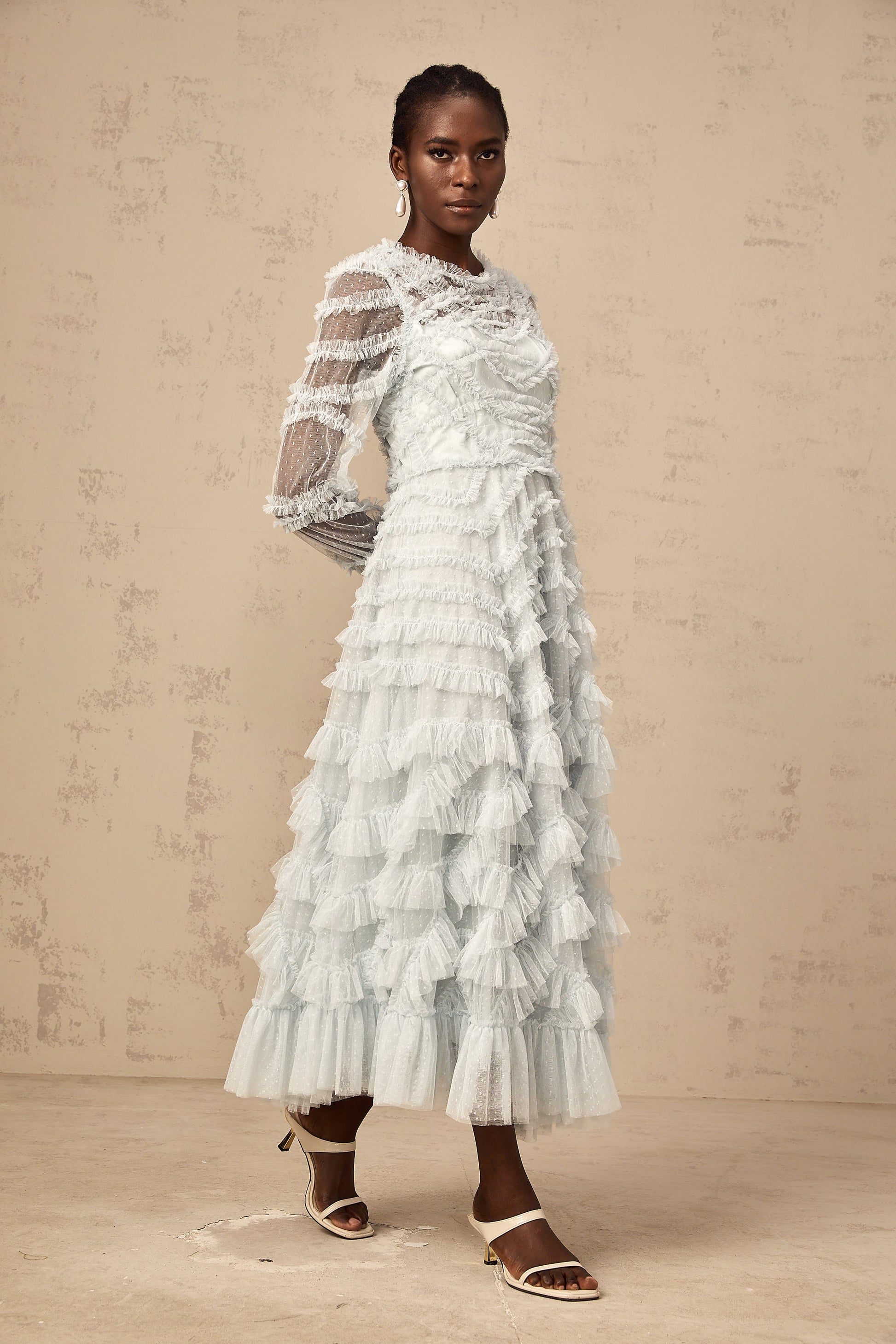 • Long semi-sheer sleeves