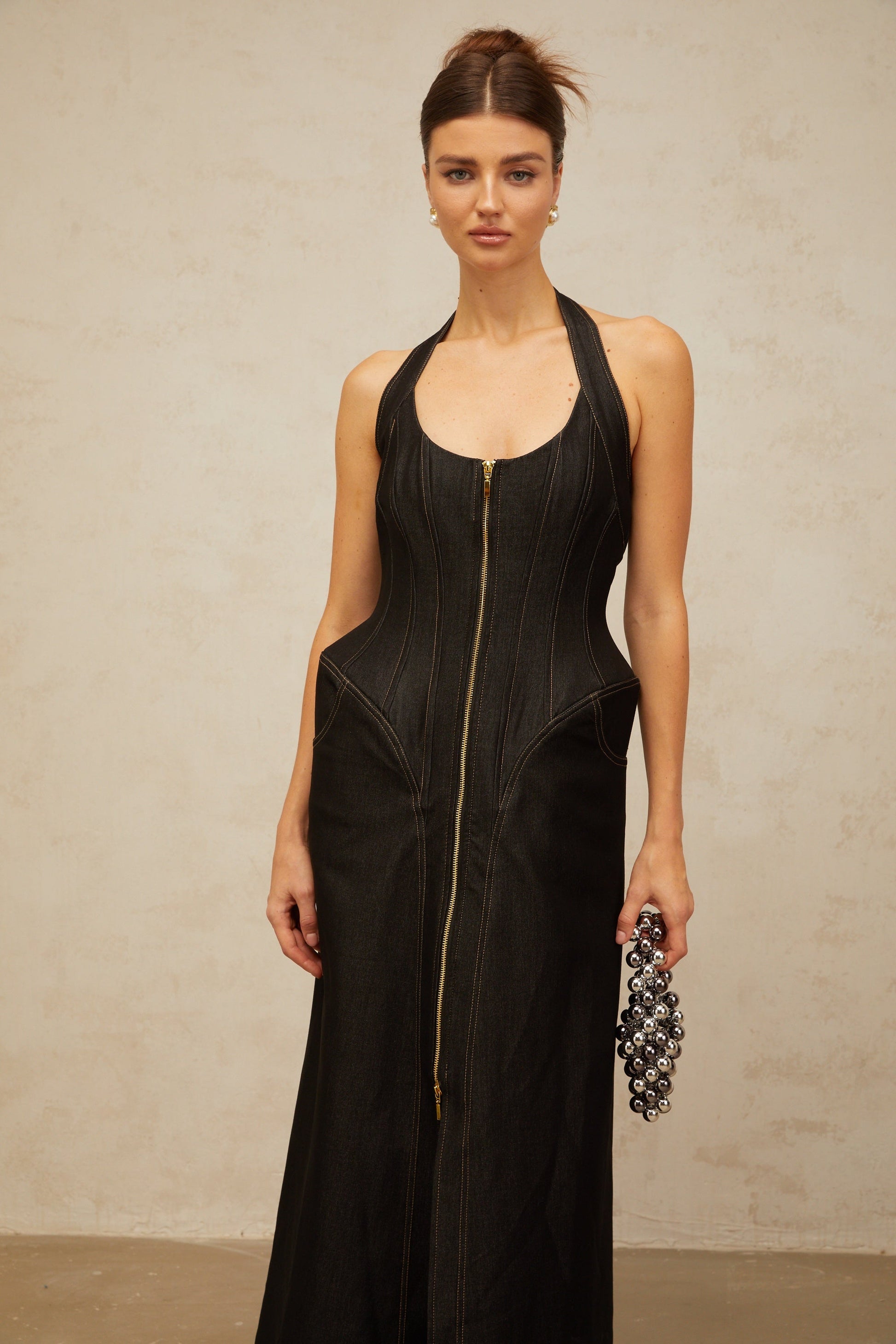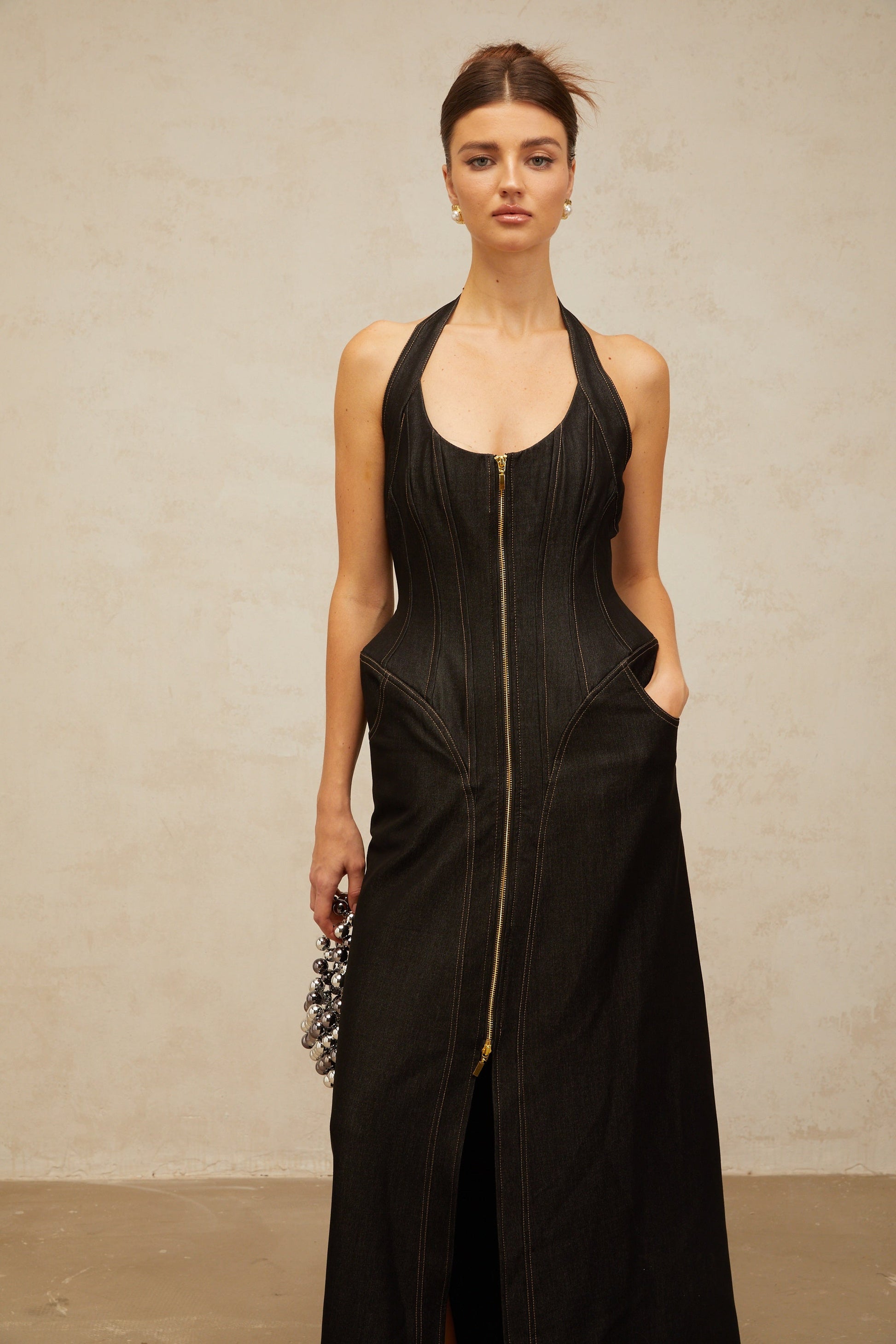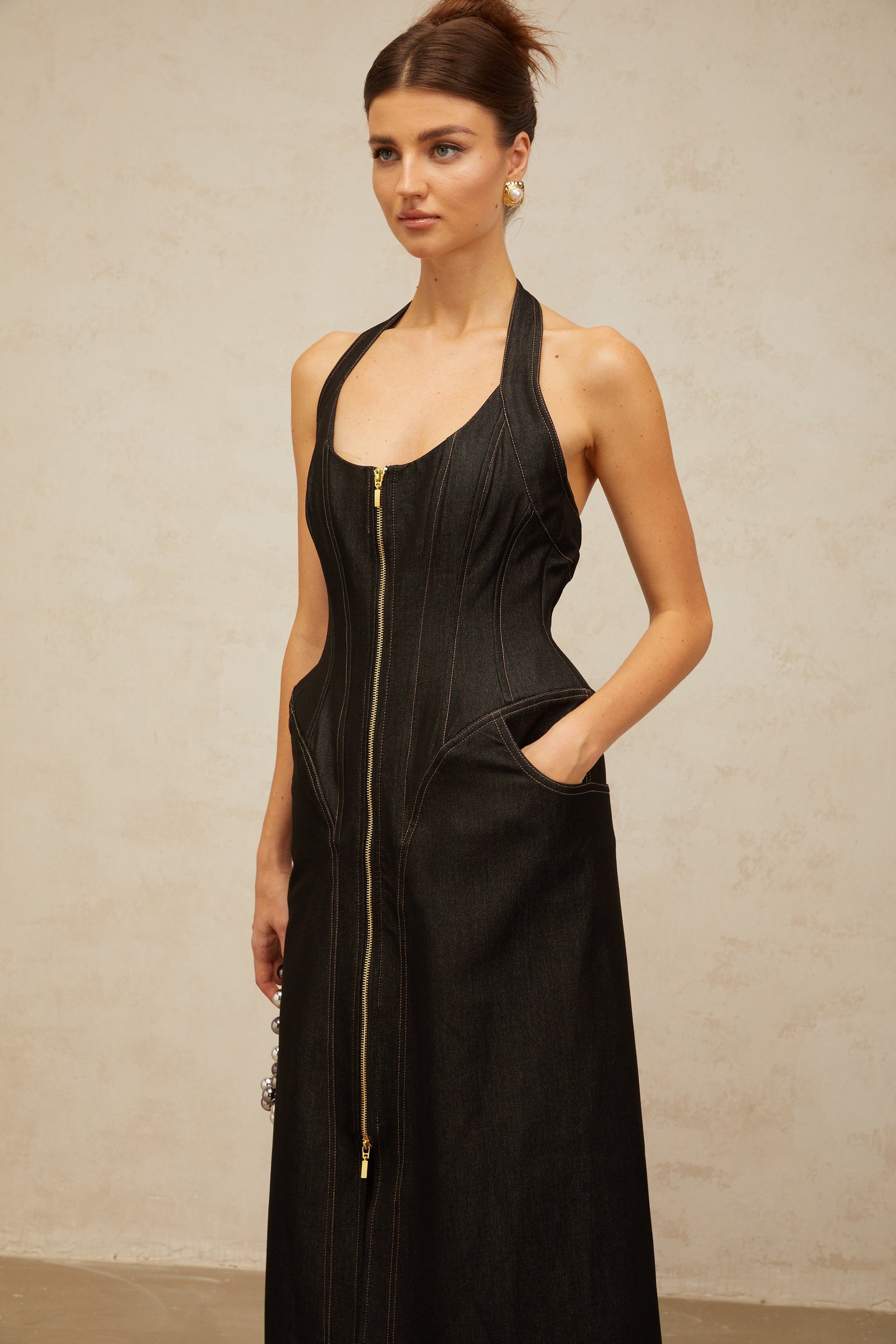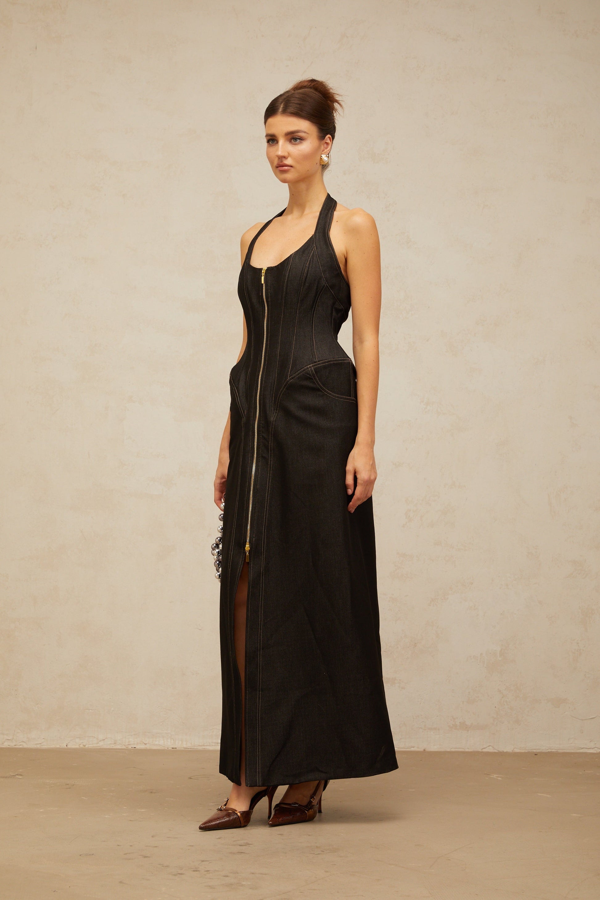 Adrienne black denim front-slit contrast-stitching maxi dress
