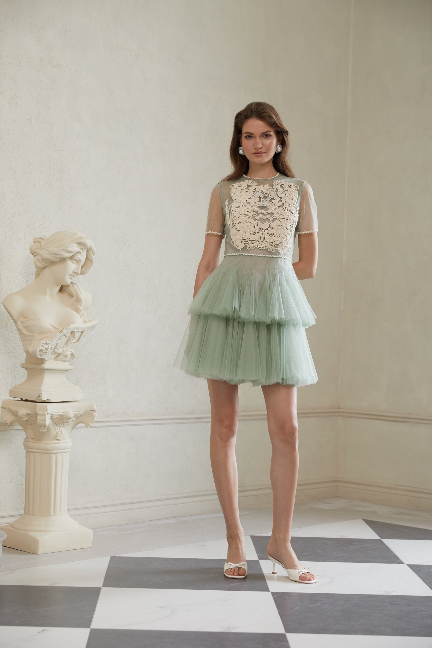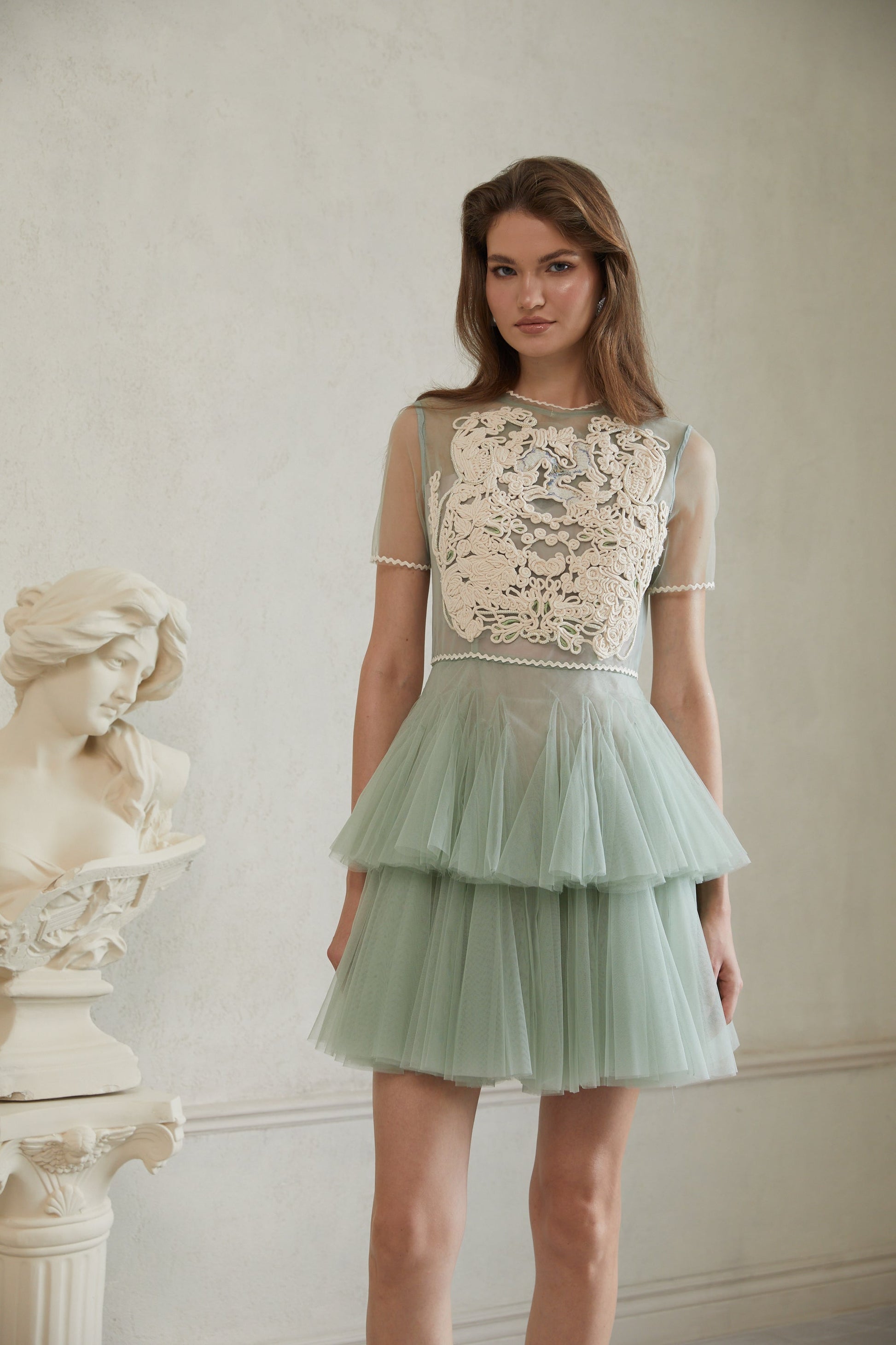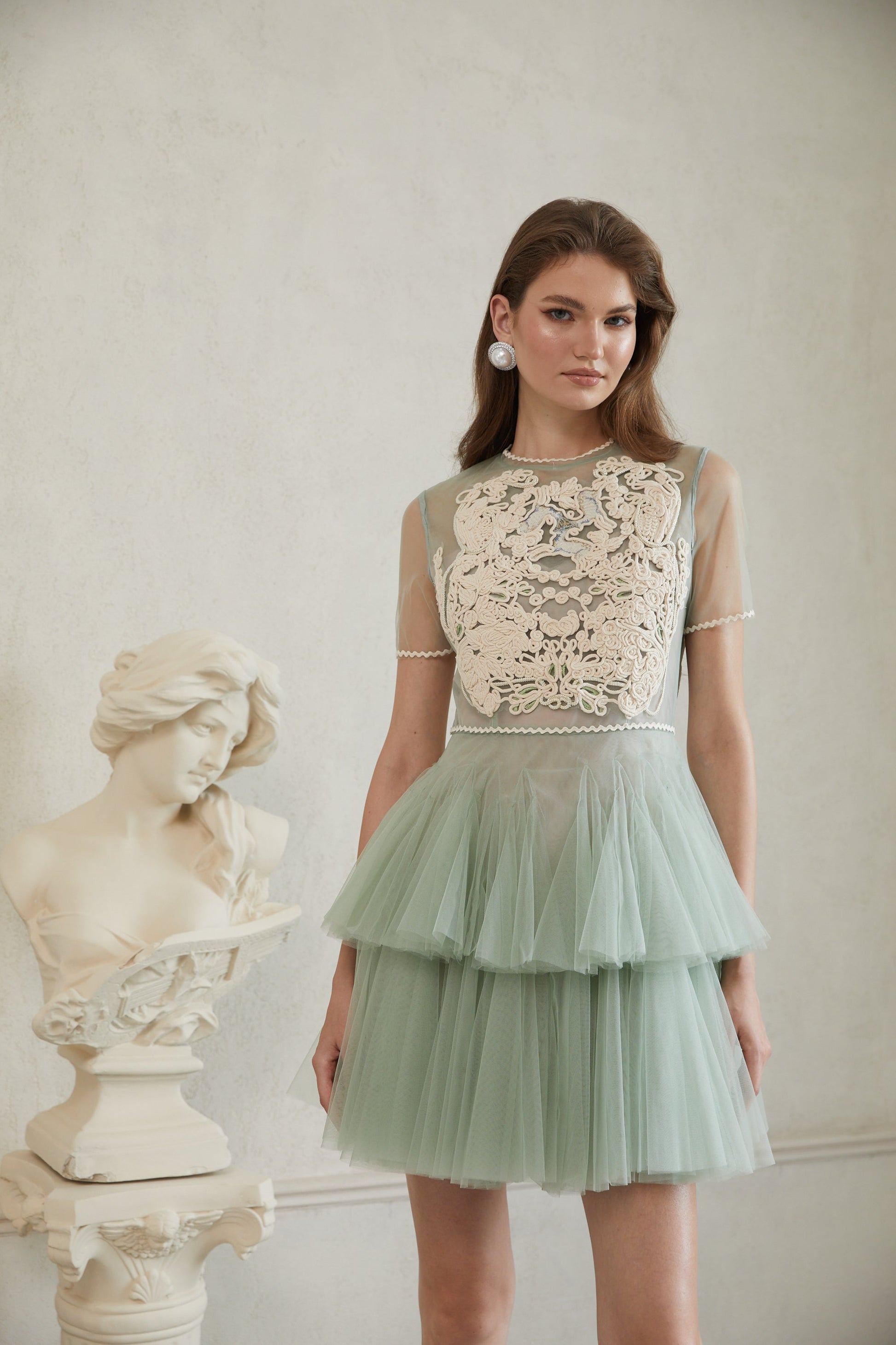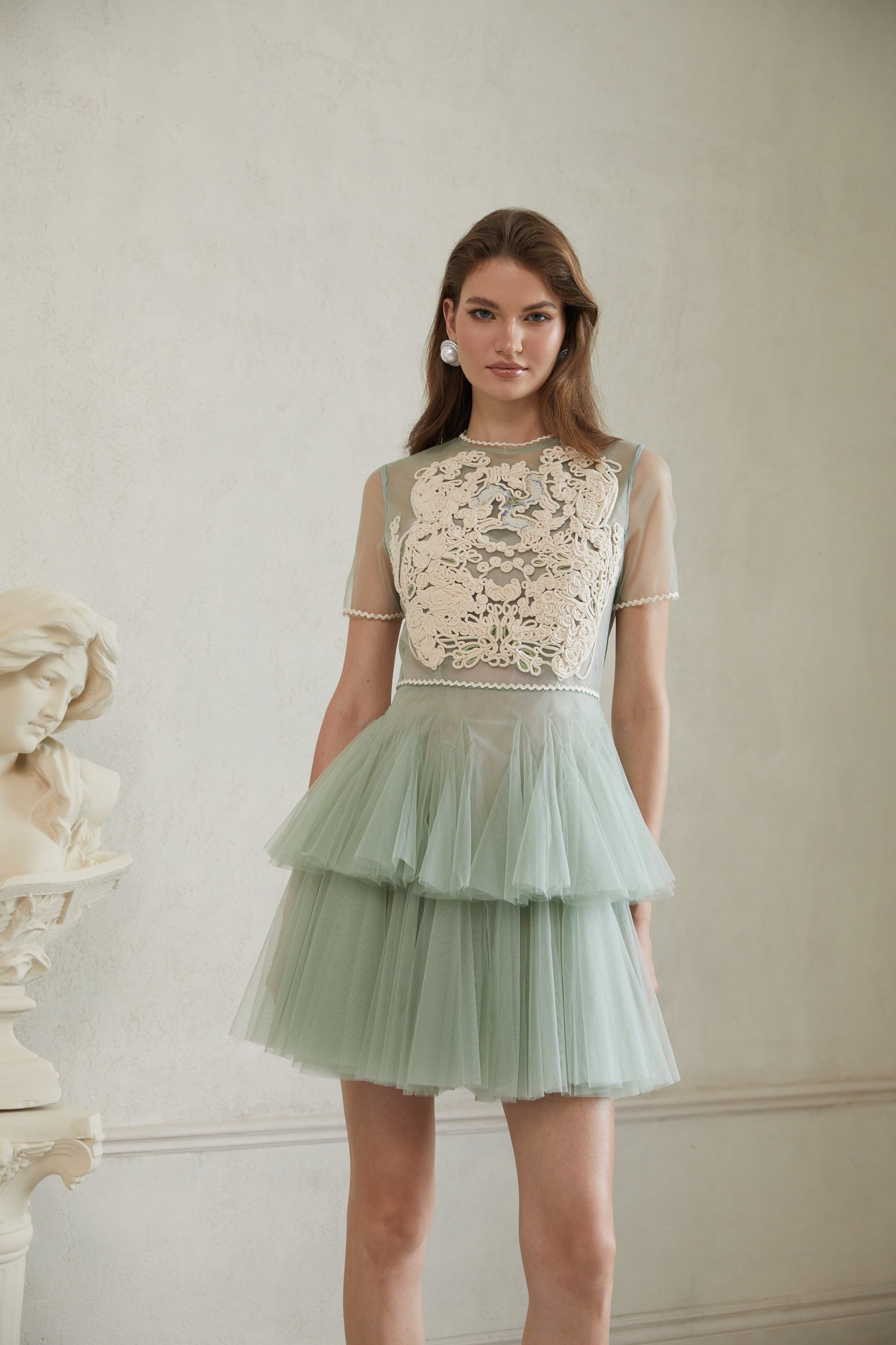 Aikaterini Green Floral Braided Tulle Mini Dress