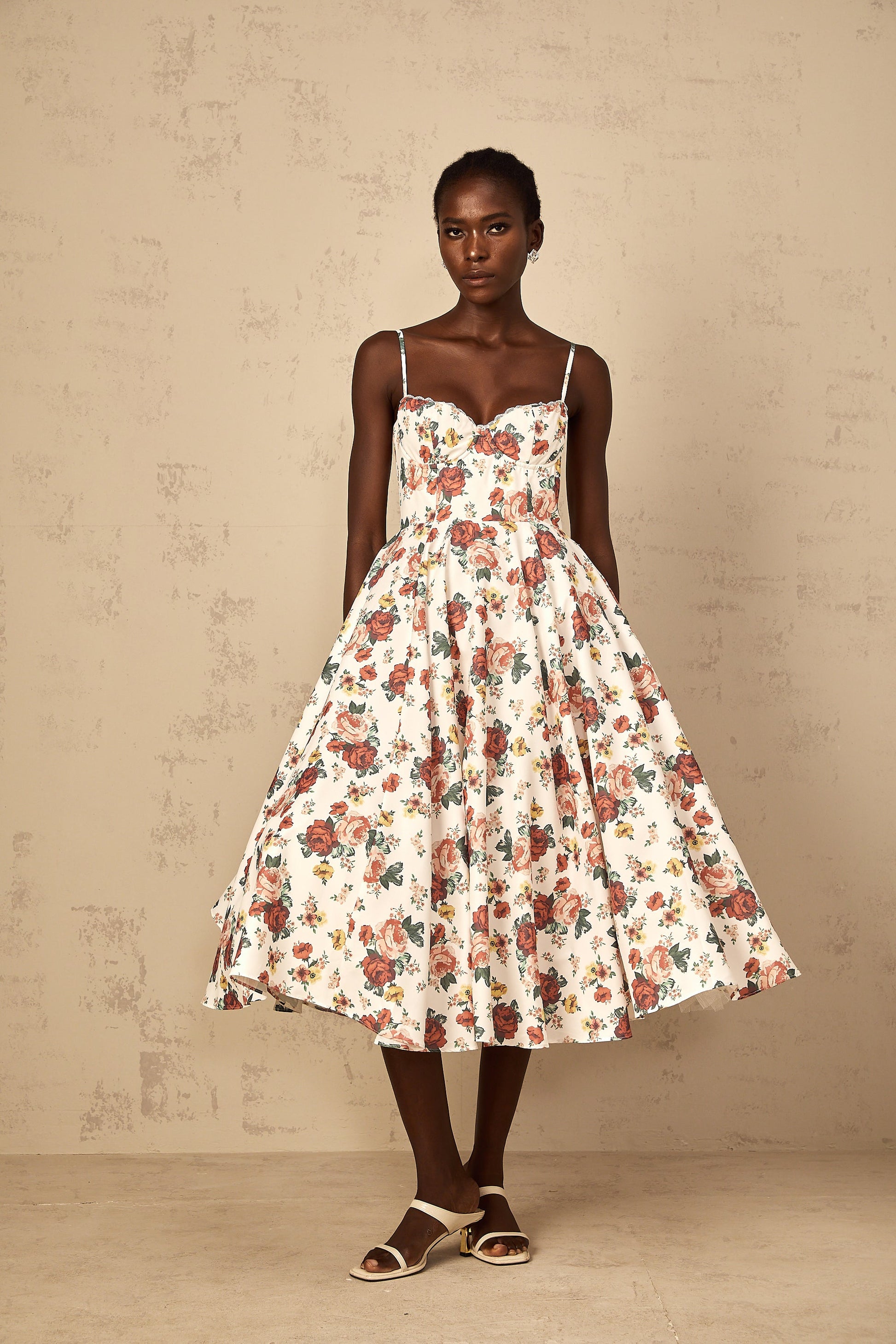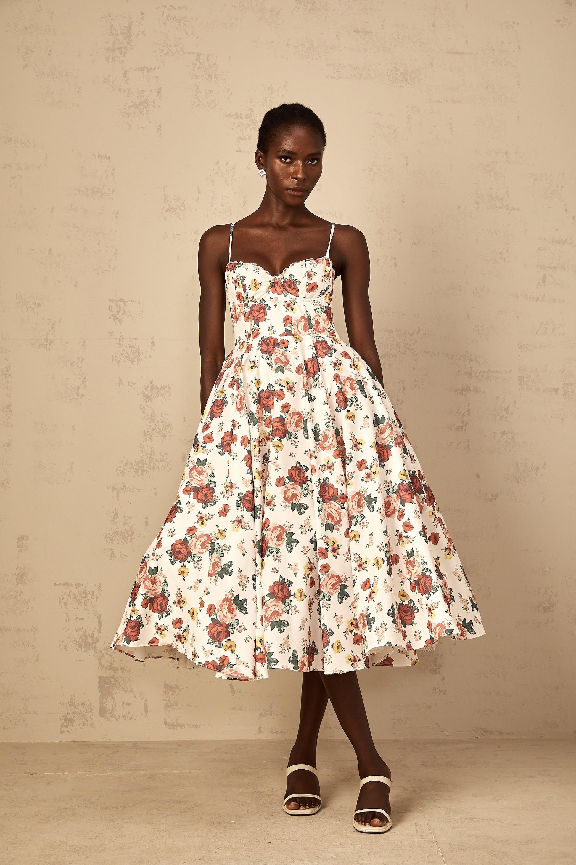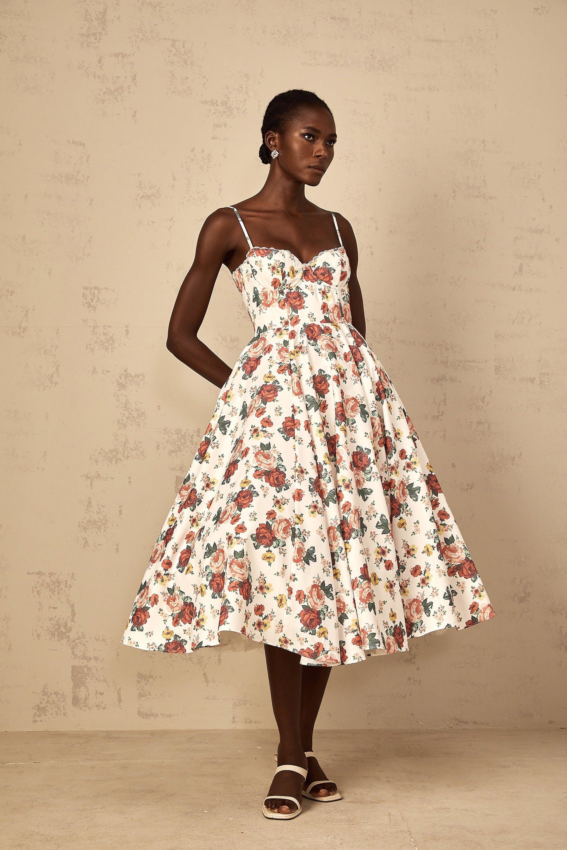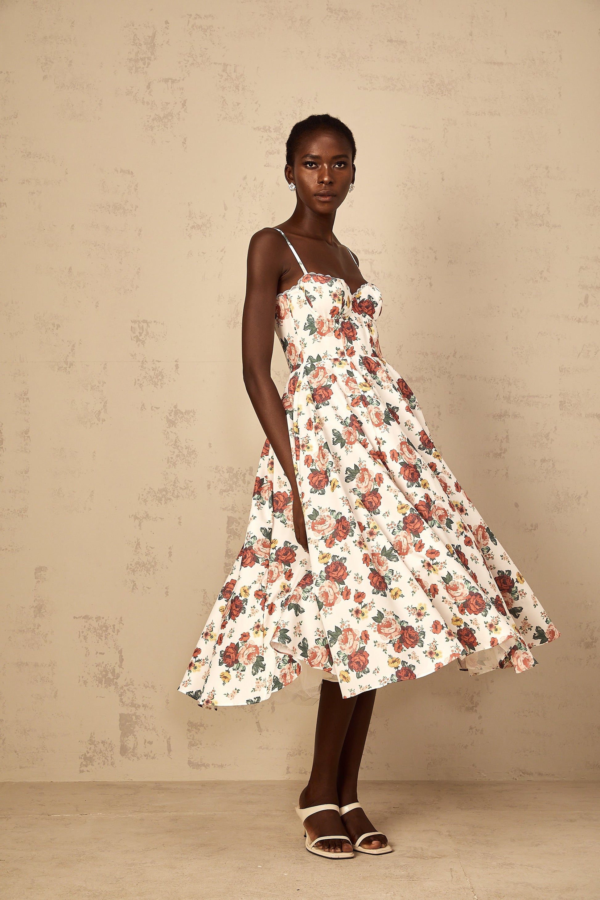 Airelle White Rose Print Flounced Midi Dress
