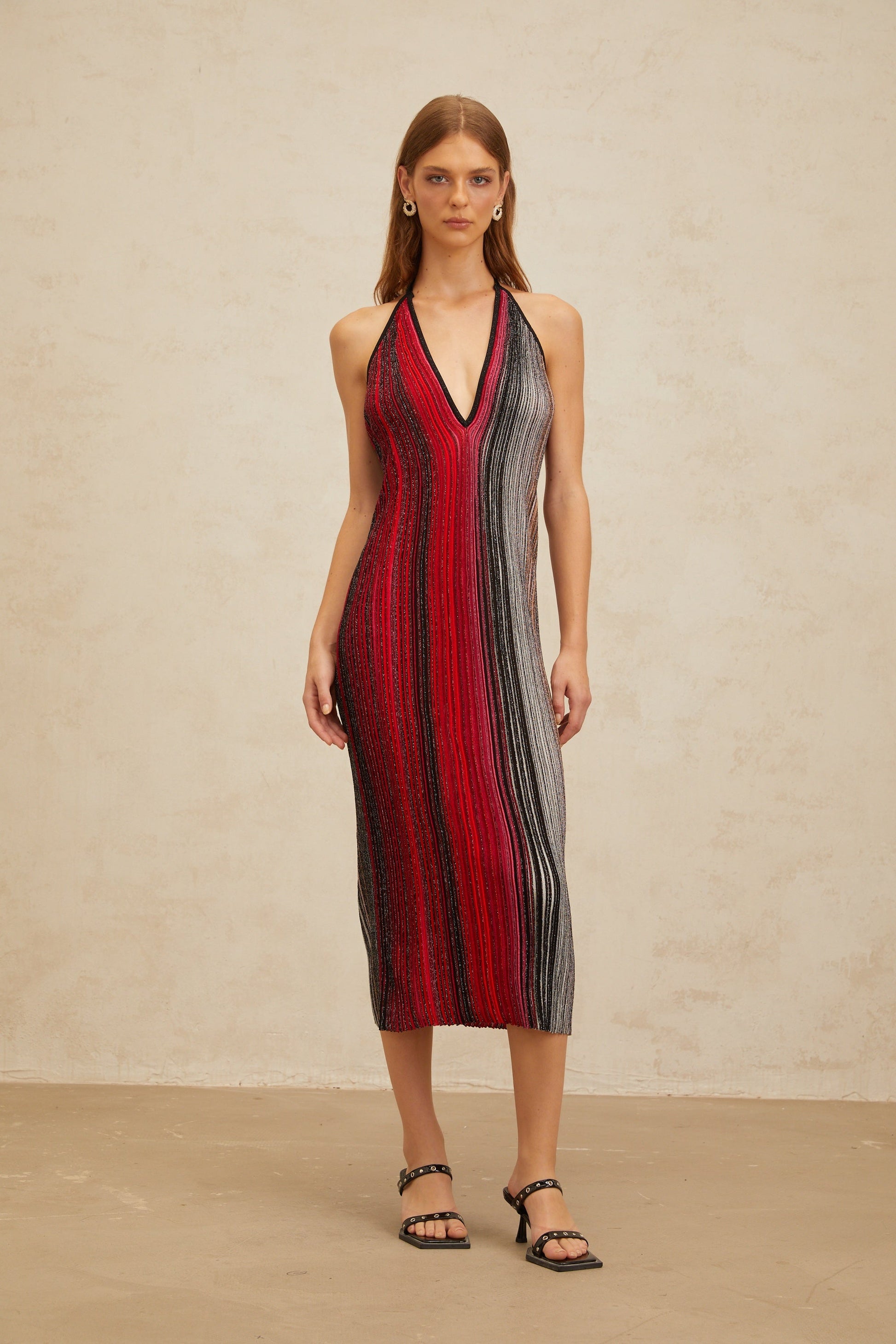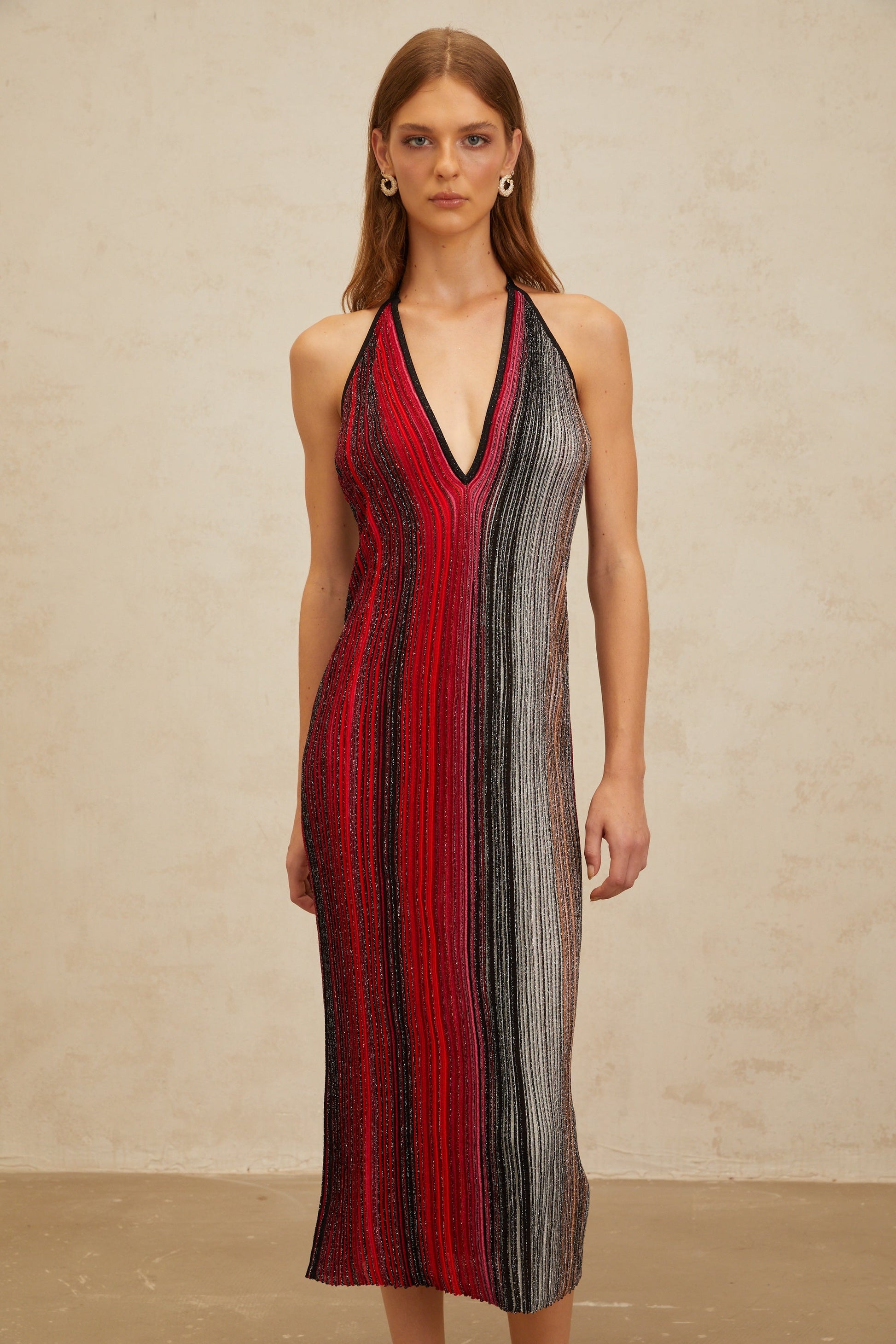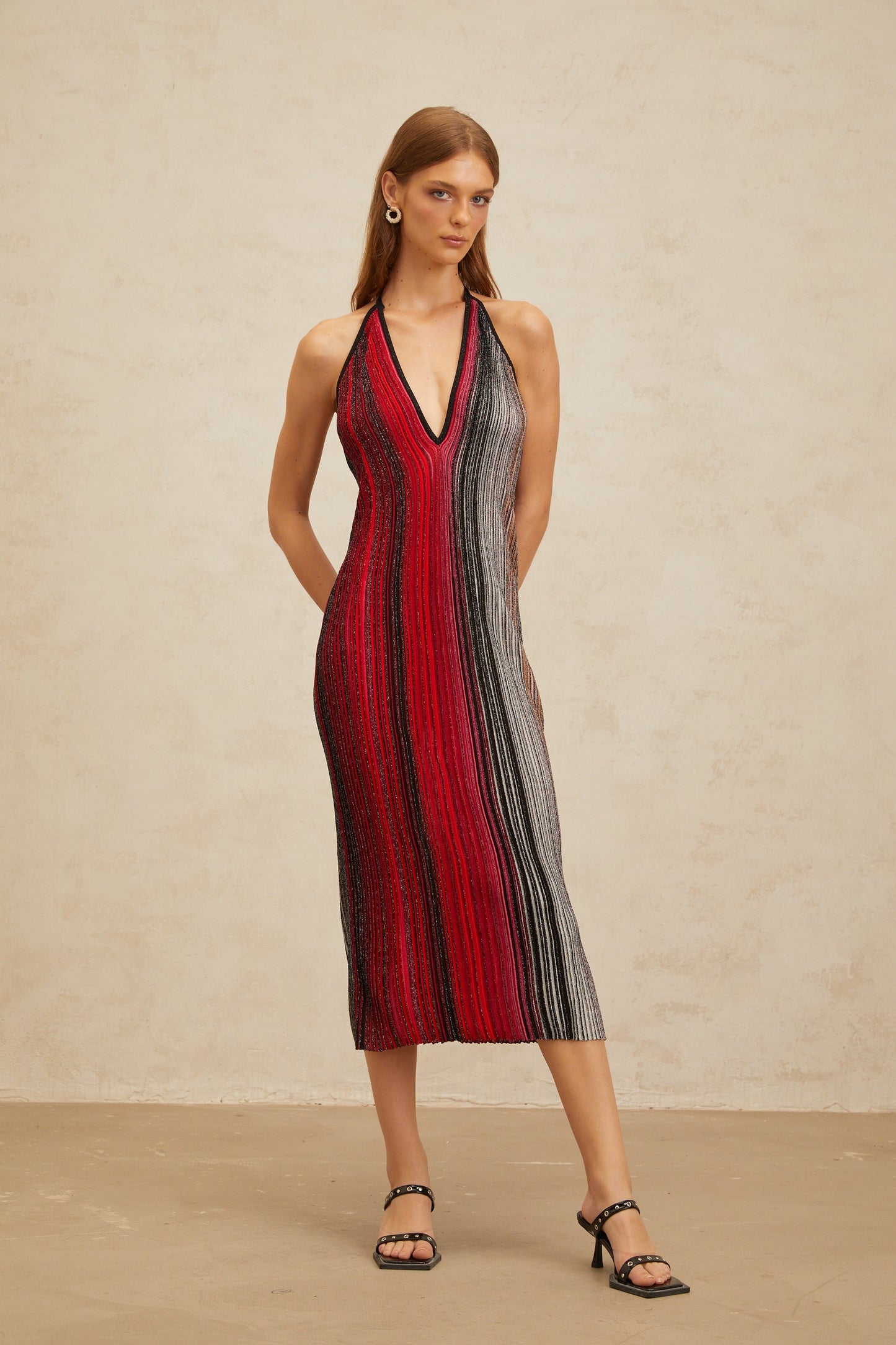 Amaryllis Red Sequined Striped Knit Midi Dress