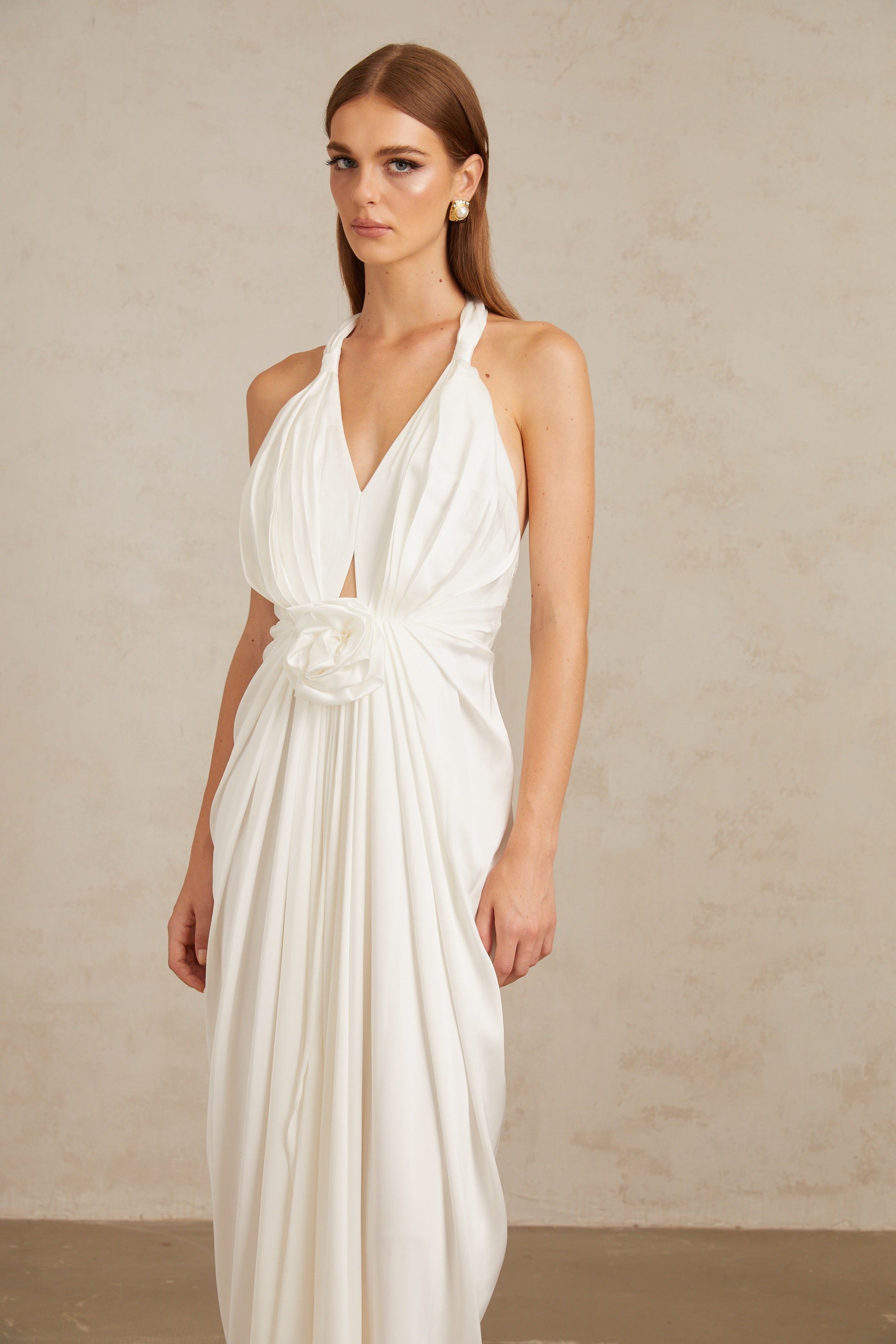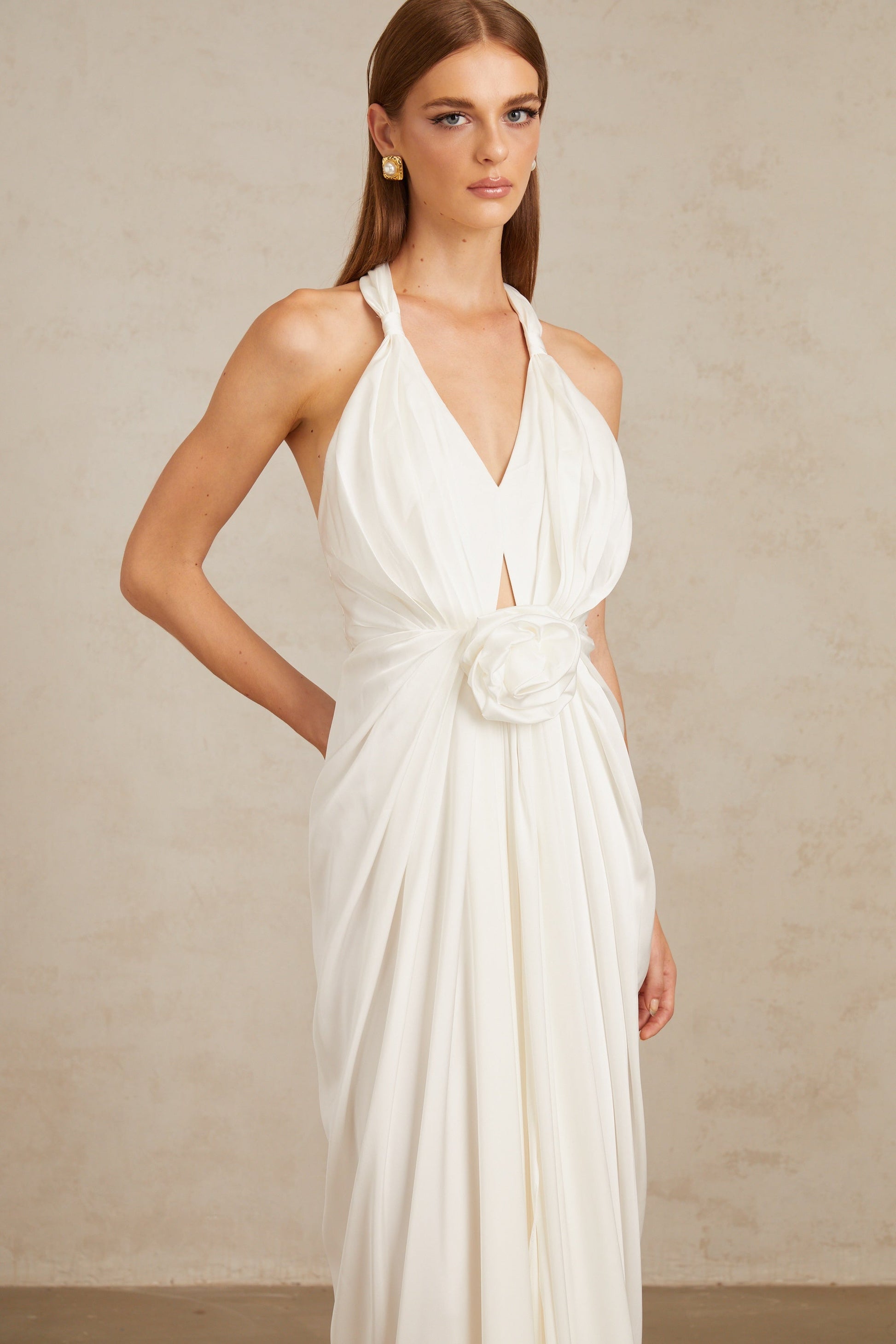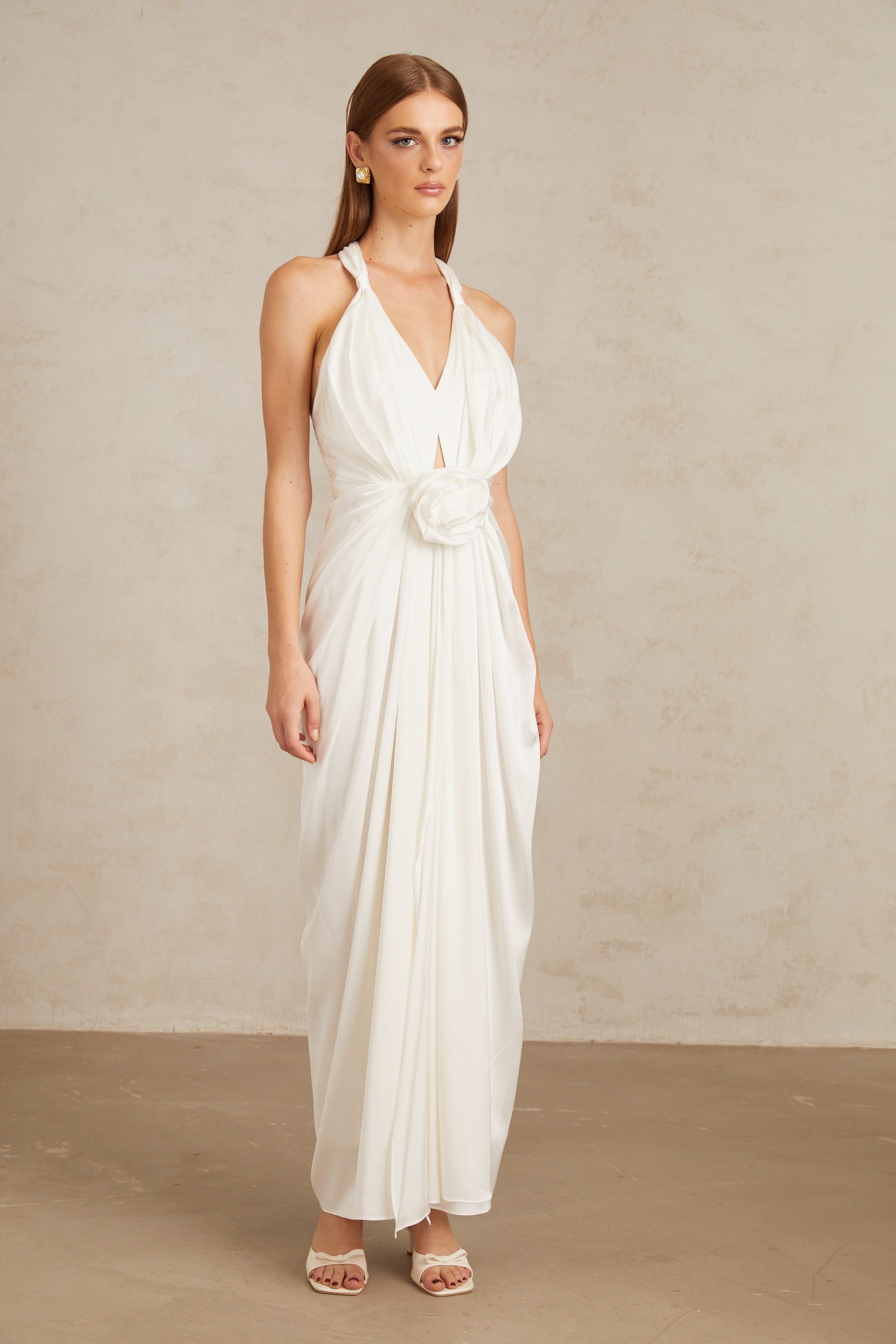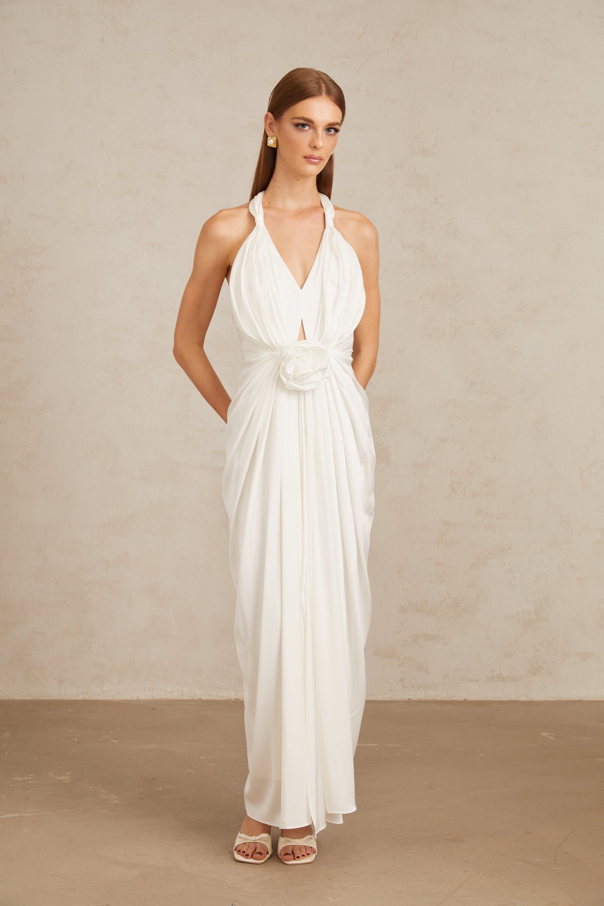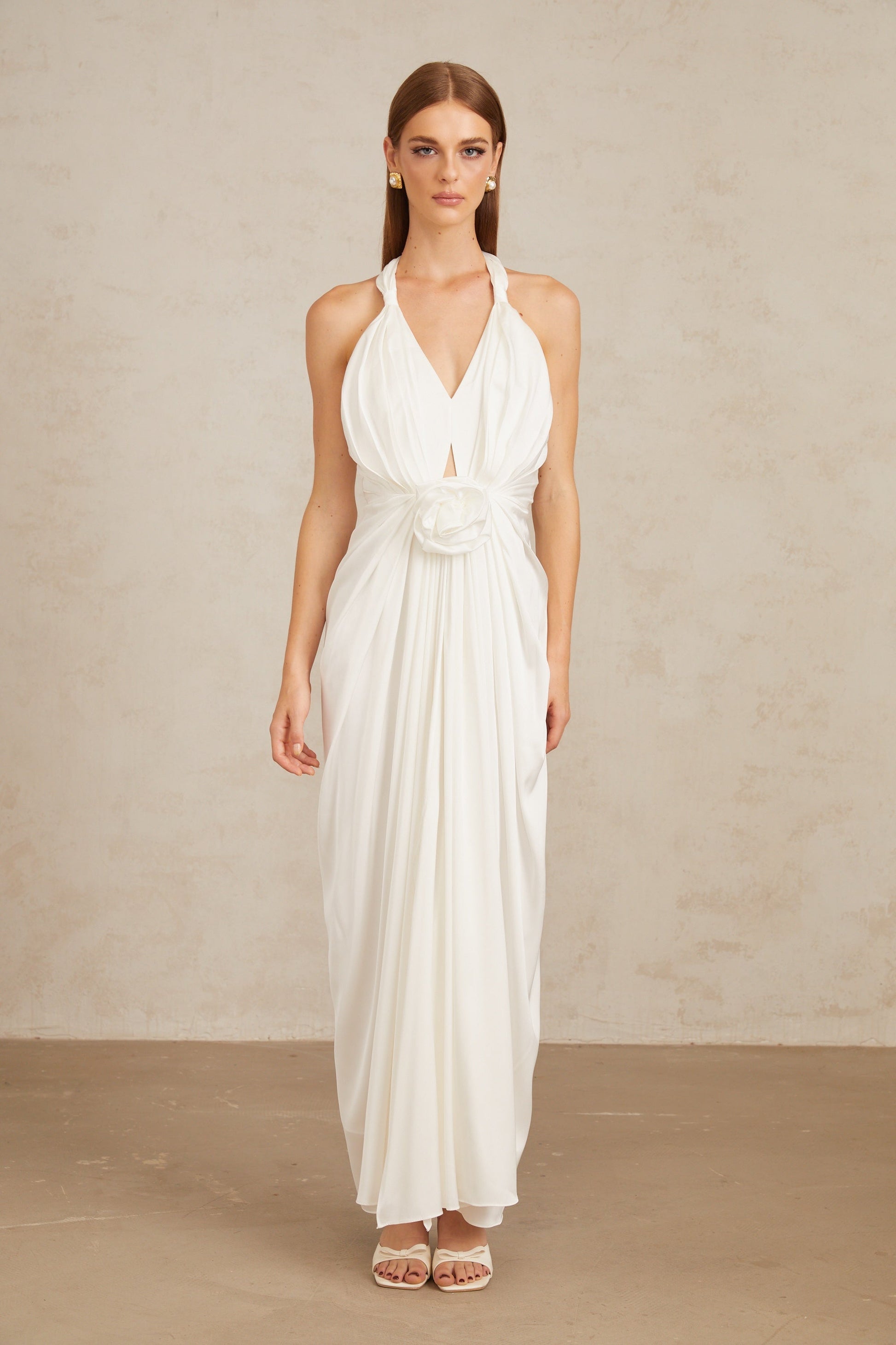 Anais White Gathered Floral Appliqué Maxi Gown