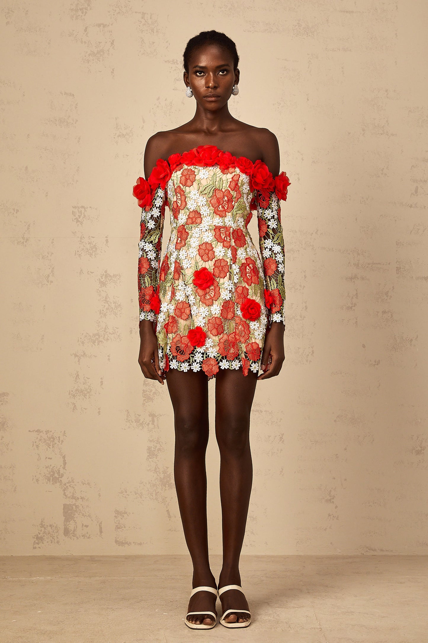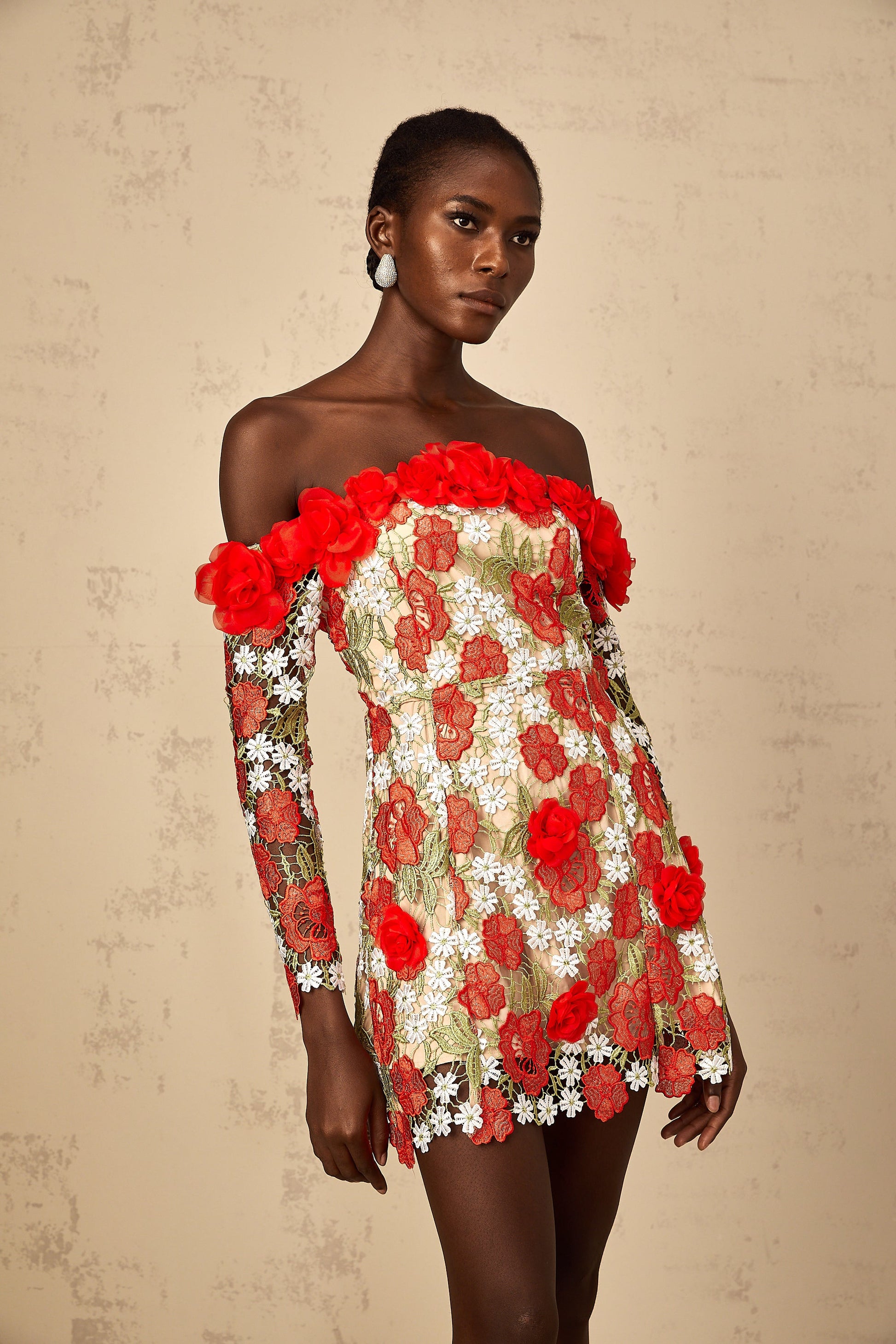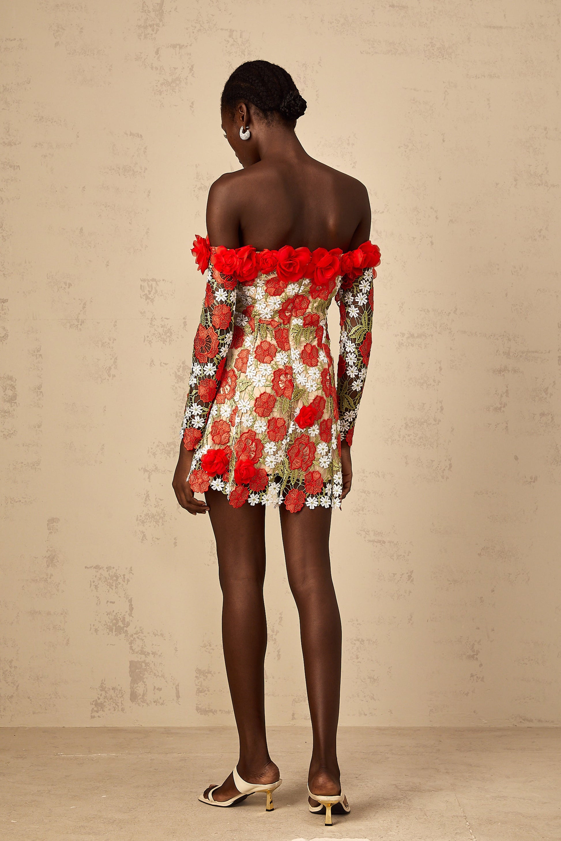 Anaya Red Rose Appliqué Embroidered Mini Dress