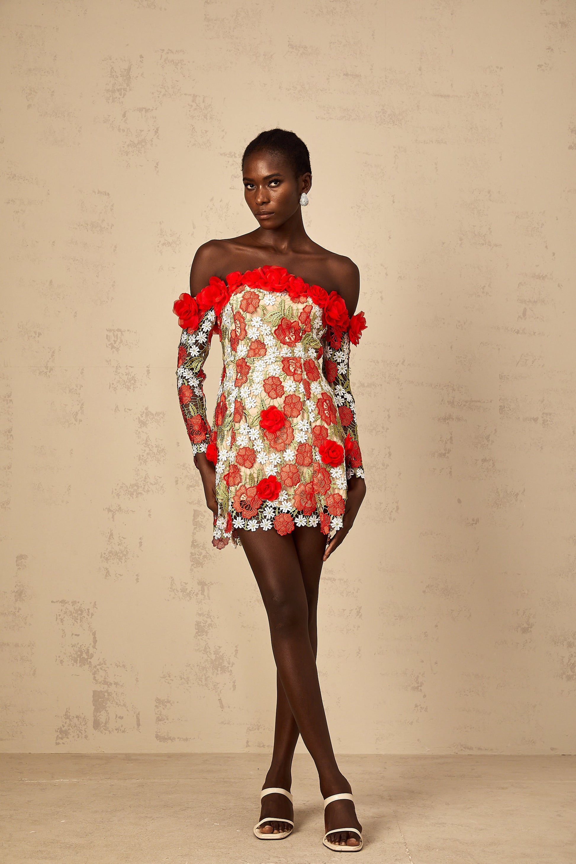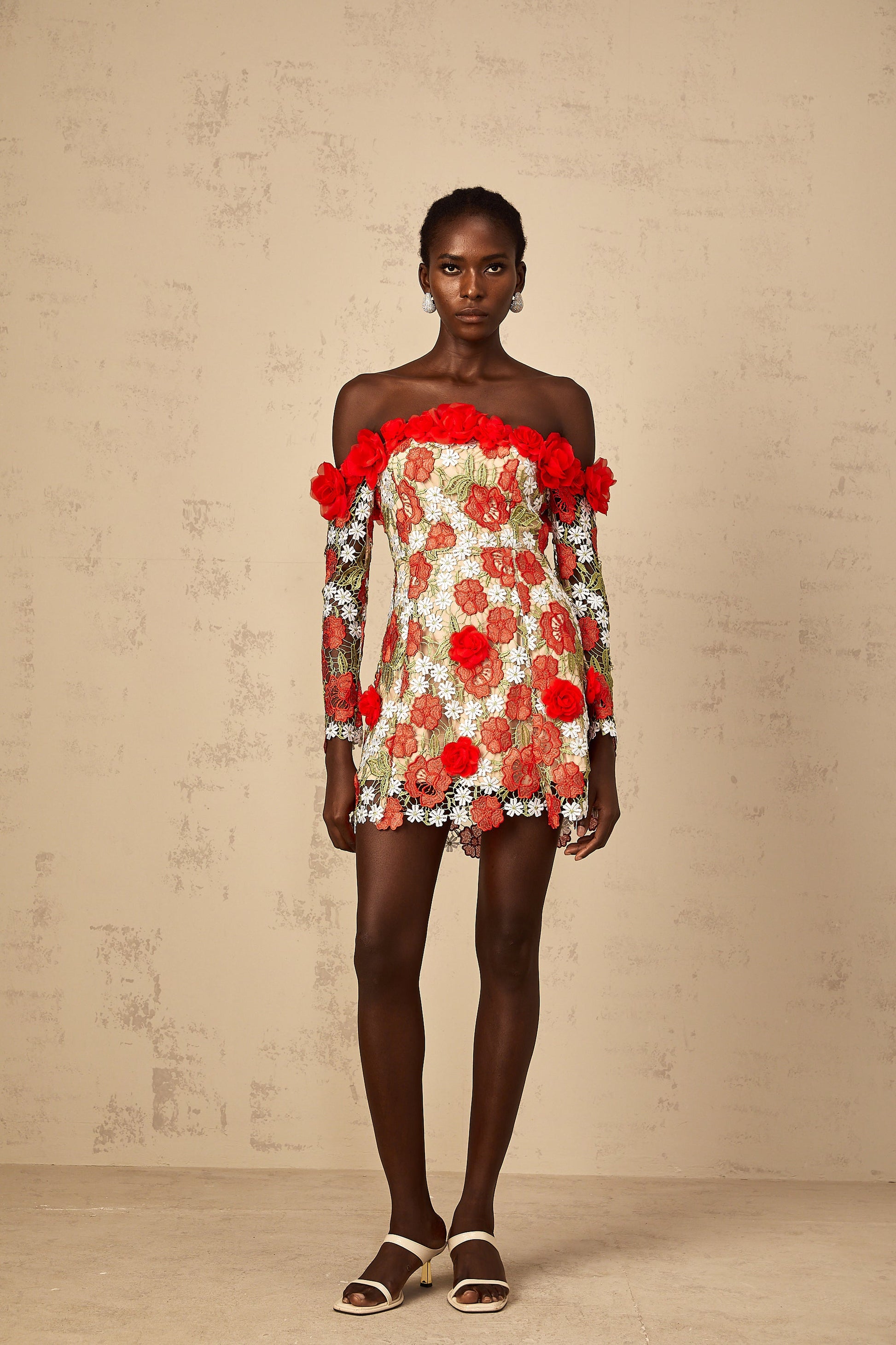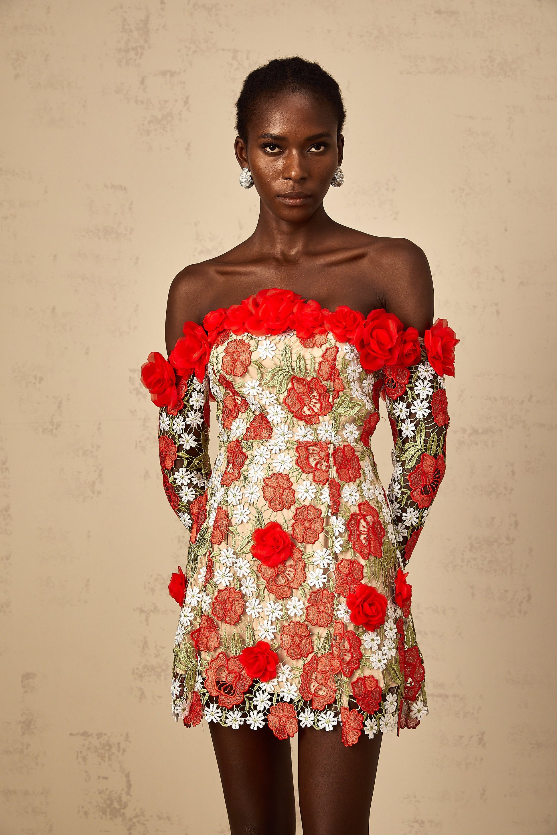 Anaya Red Rose Appliqué Embroidered Mini Dress
