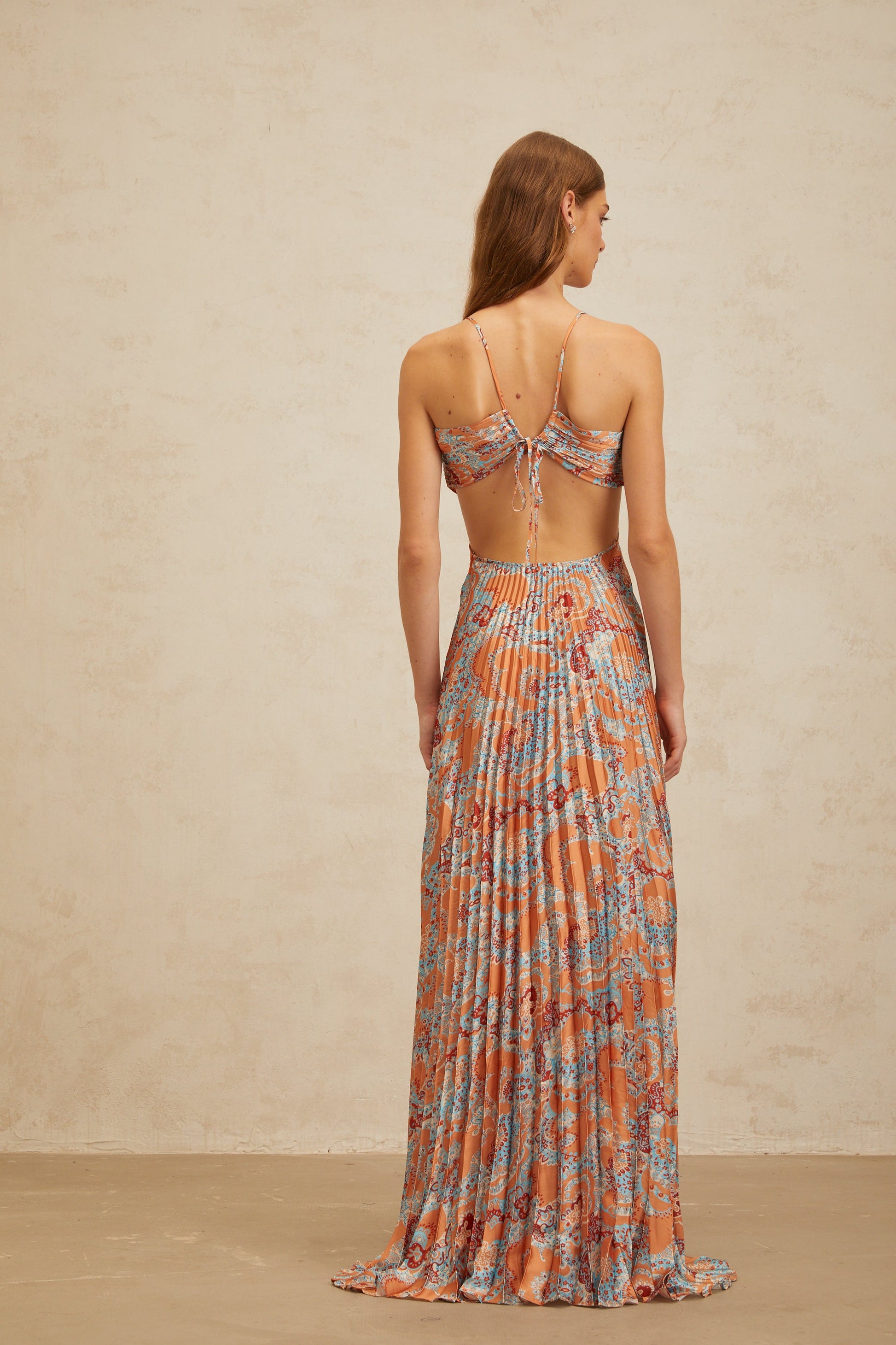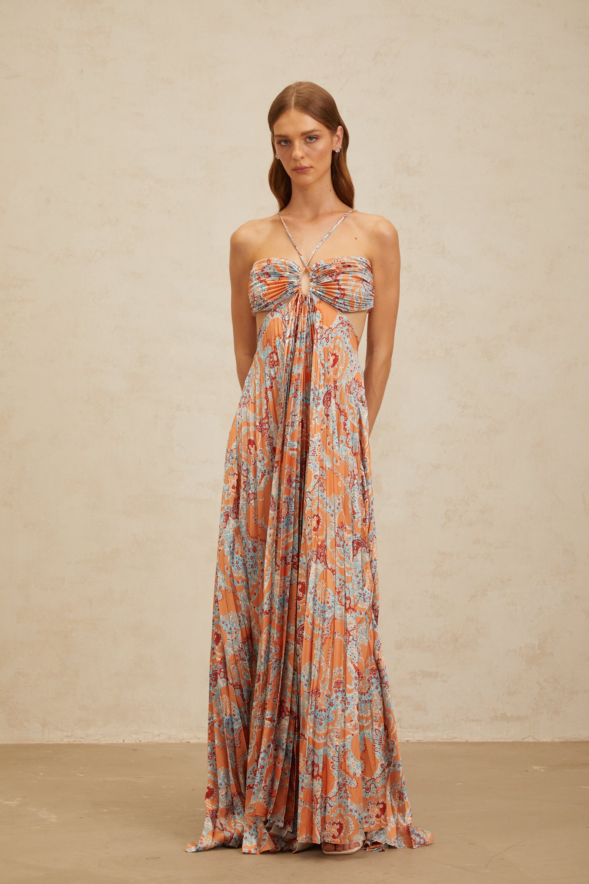 Andréa Orange Floral Print Pleated Maxi Dress with Cutout Detail