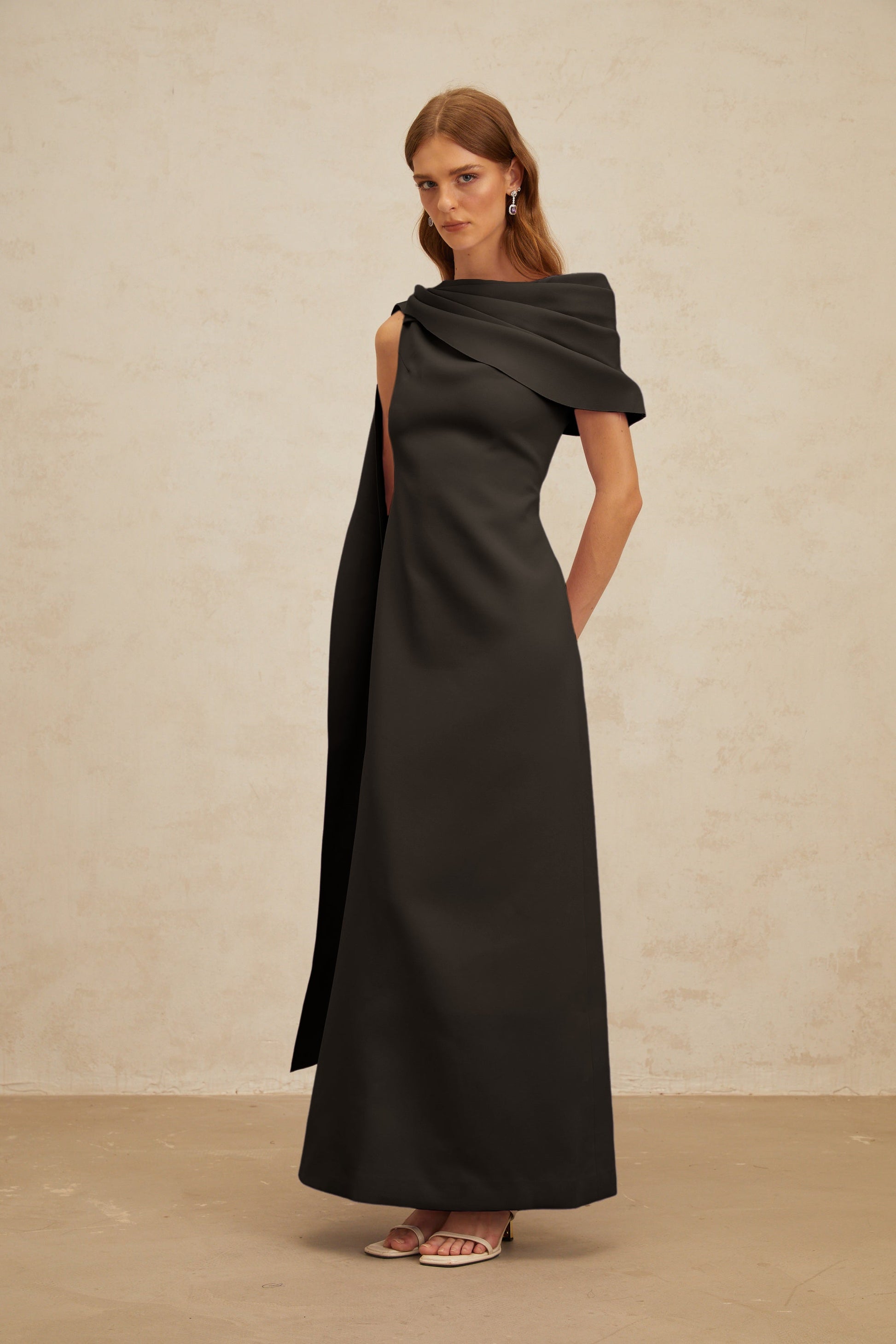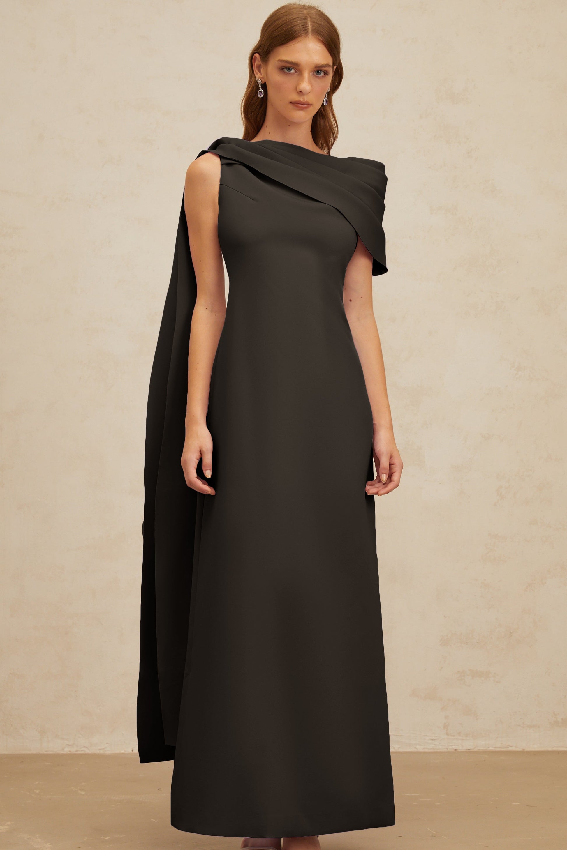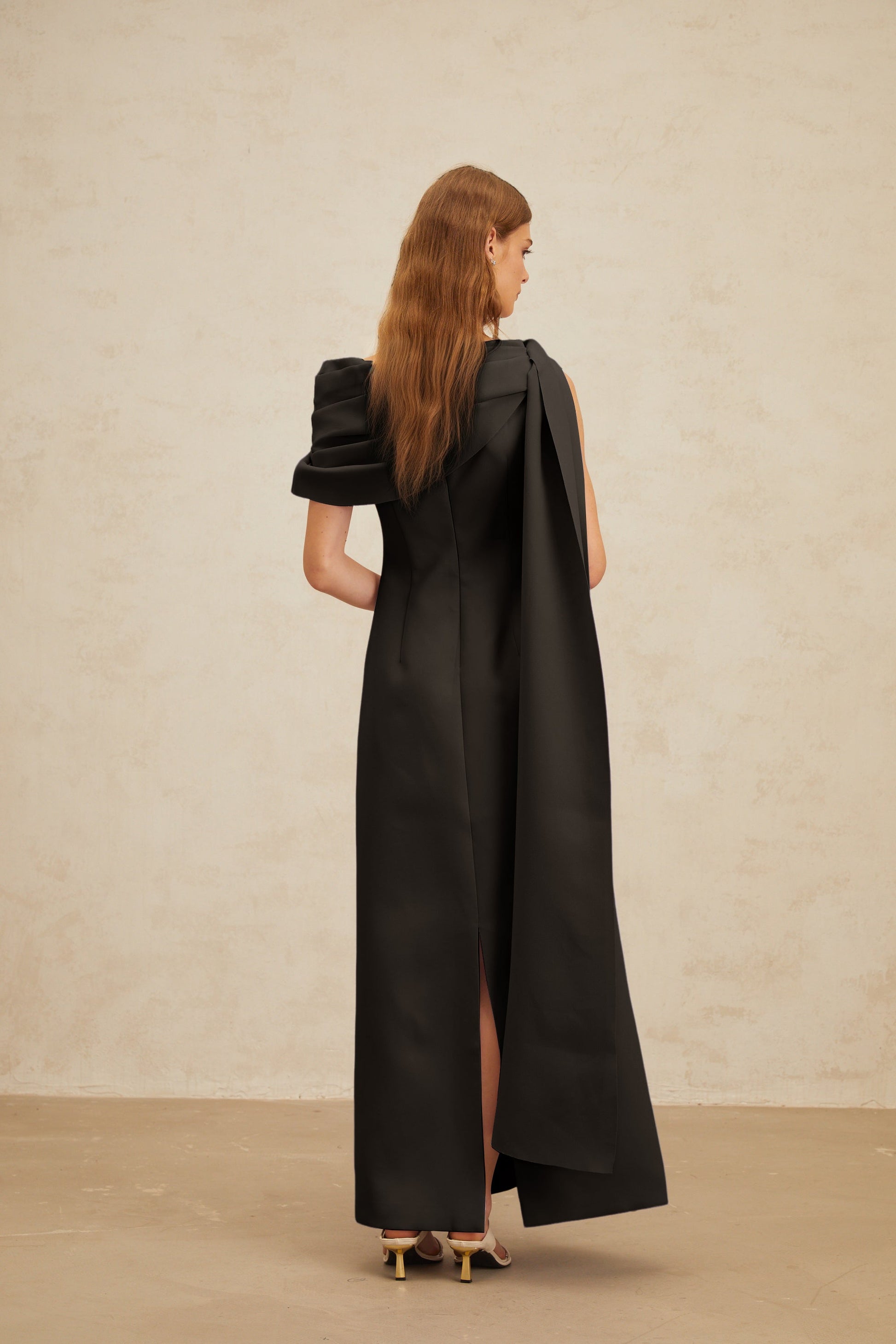Annabelle Black Cape-Design Ribbon Maxi Dress