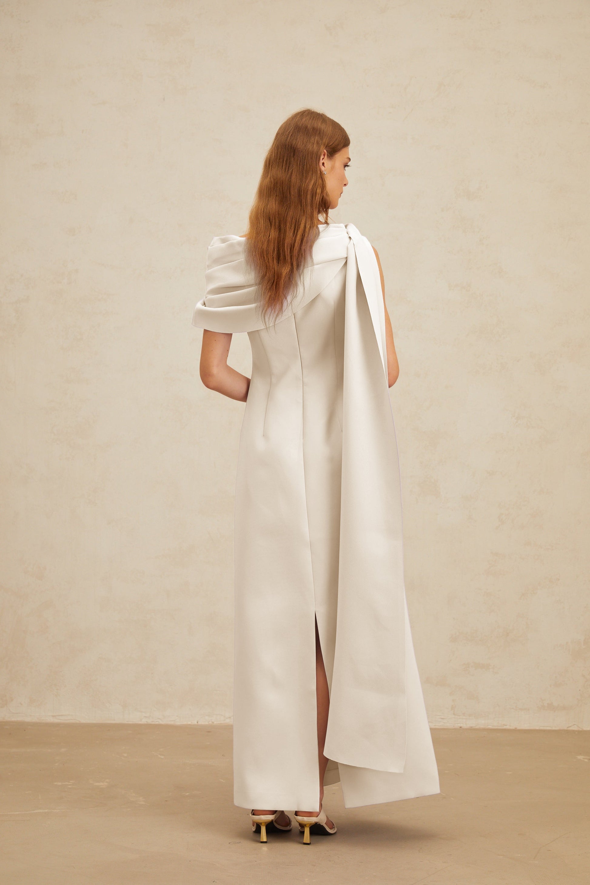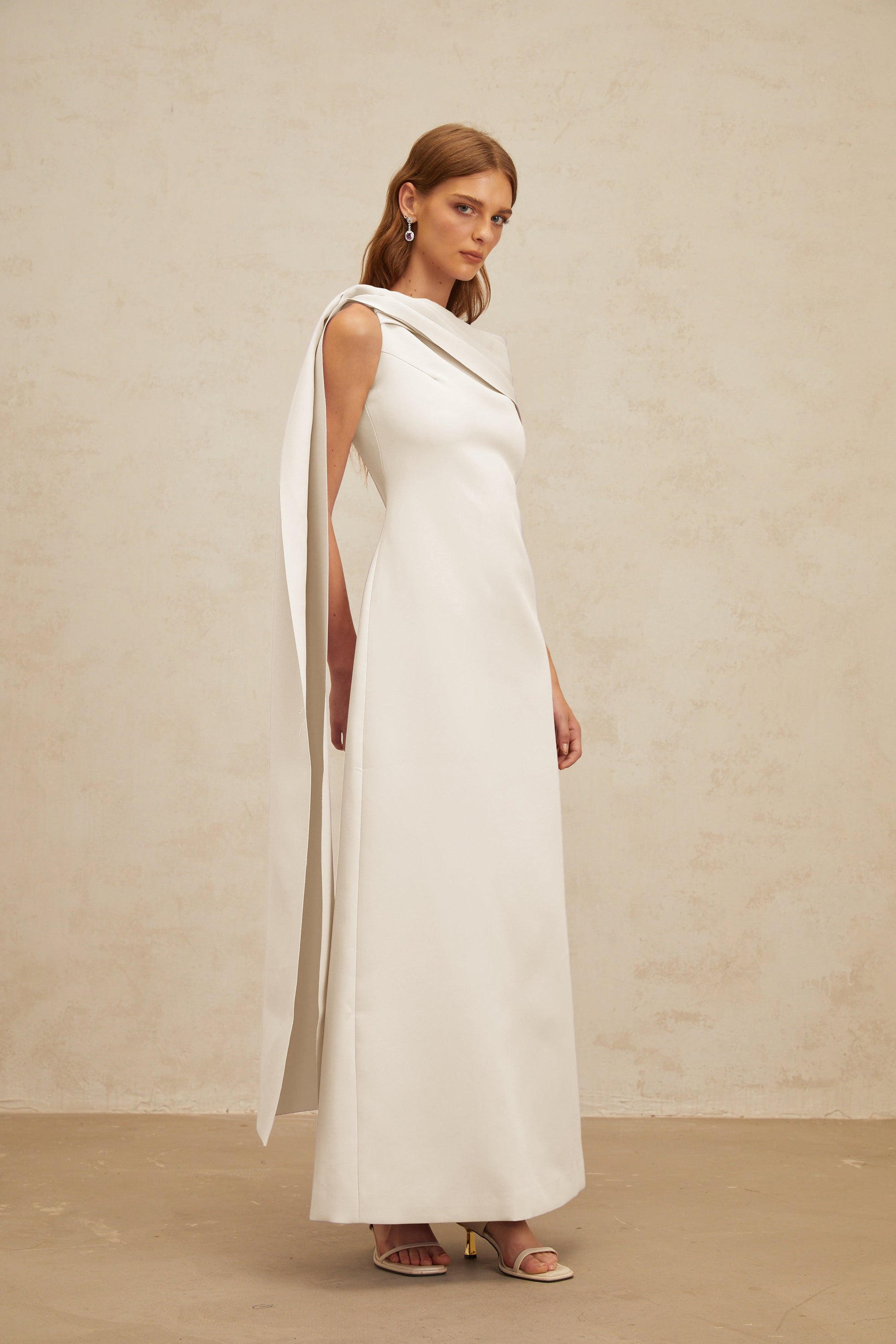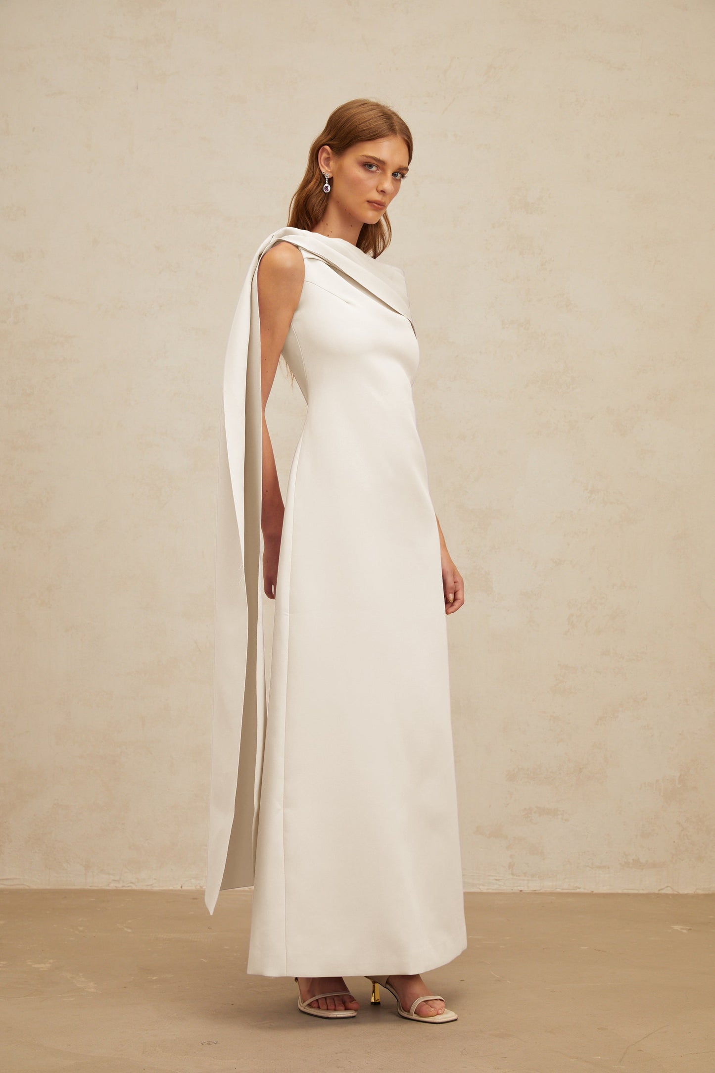 Annabelle White Cape-Design Ribbon Maxi Dress