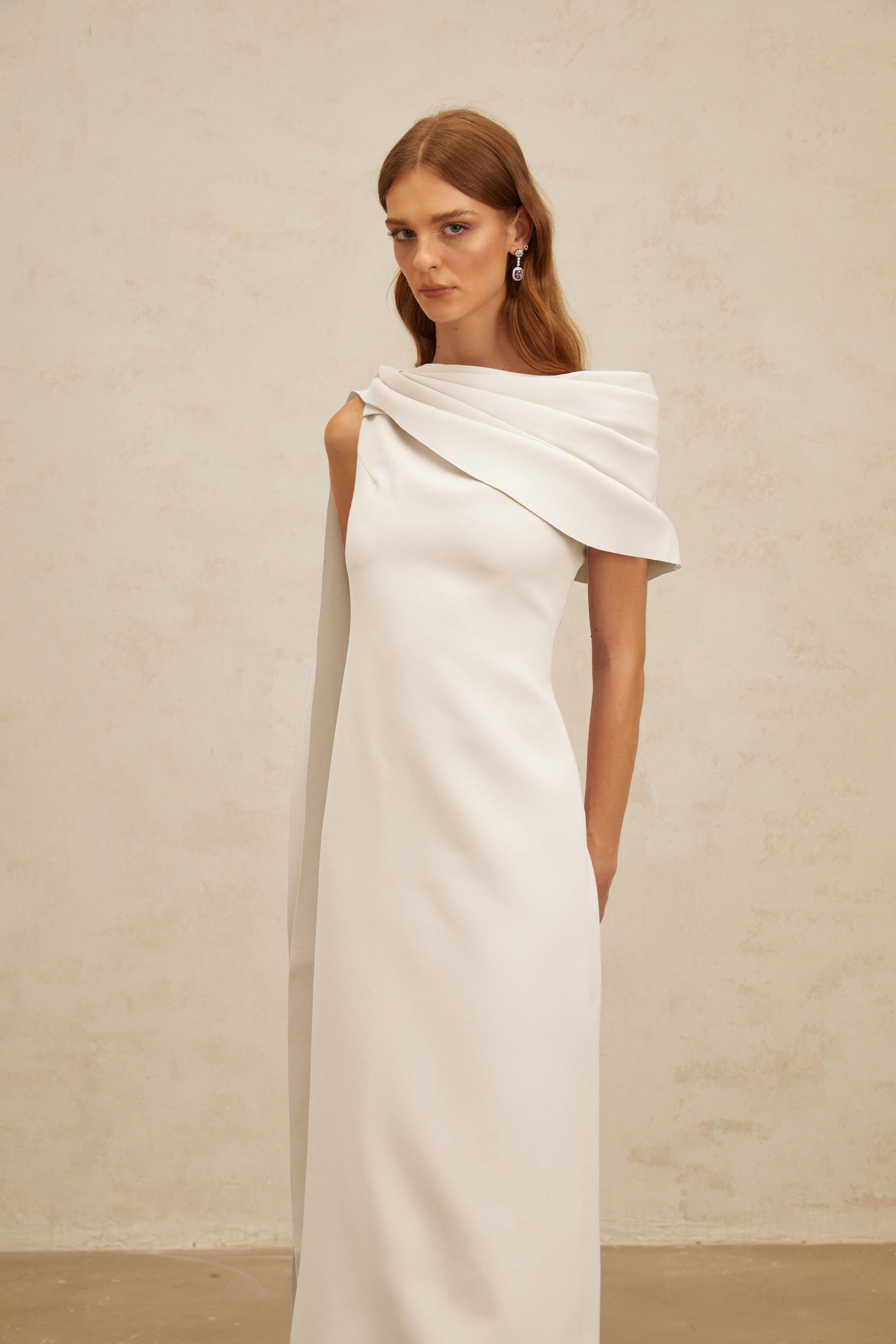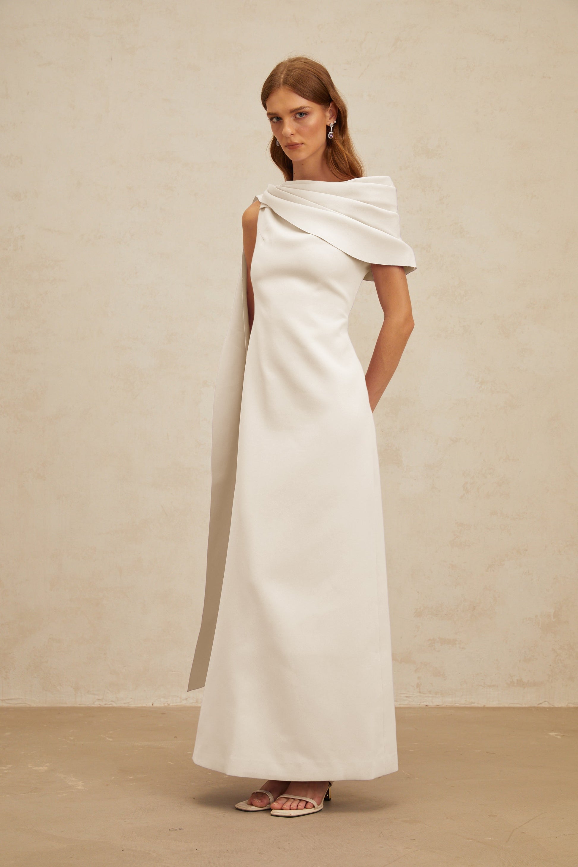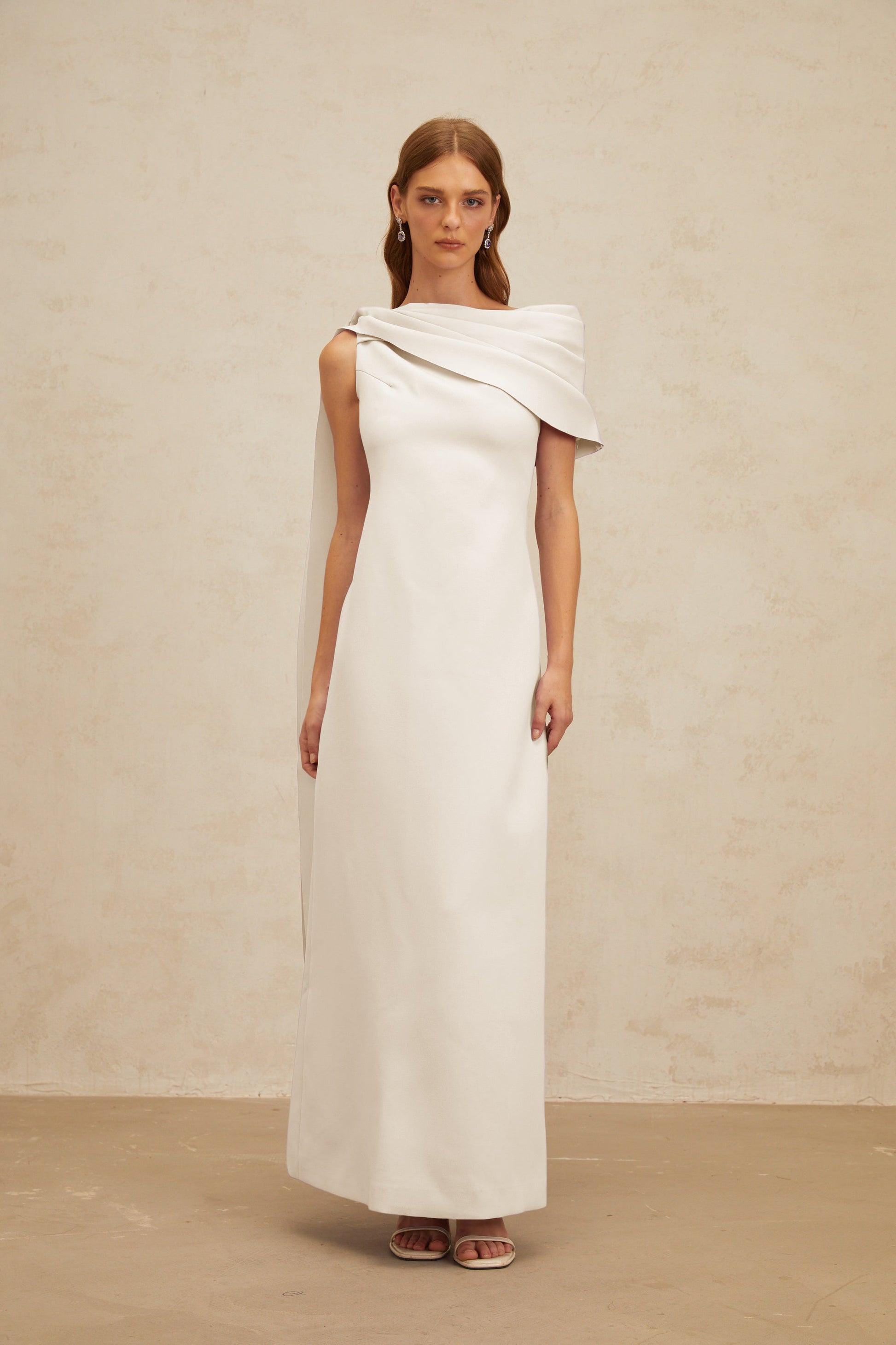 Annabelle White Cape-Design Ribbon Maxi Dress