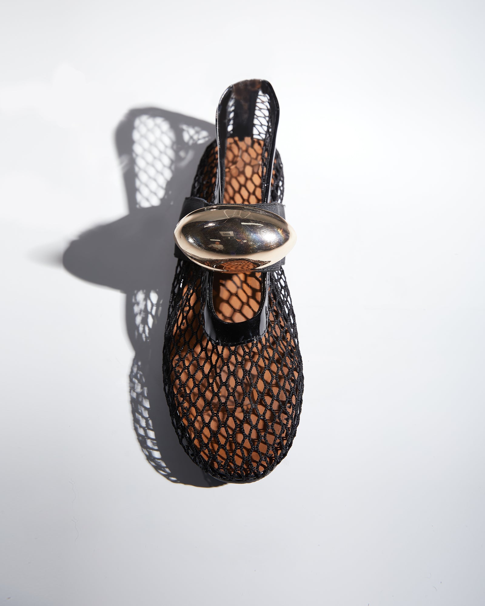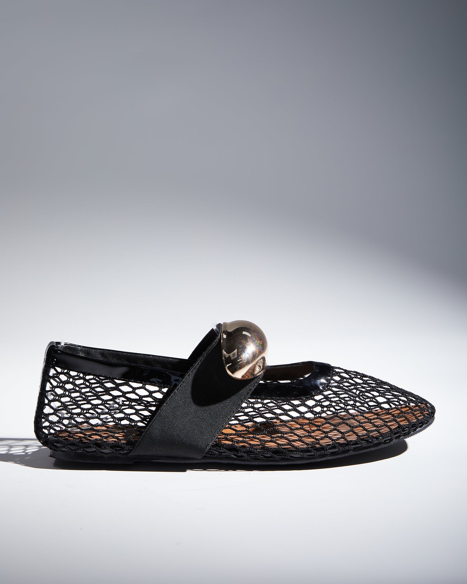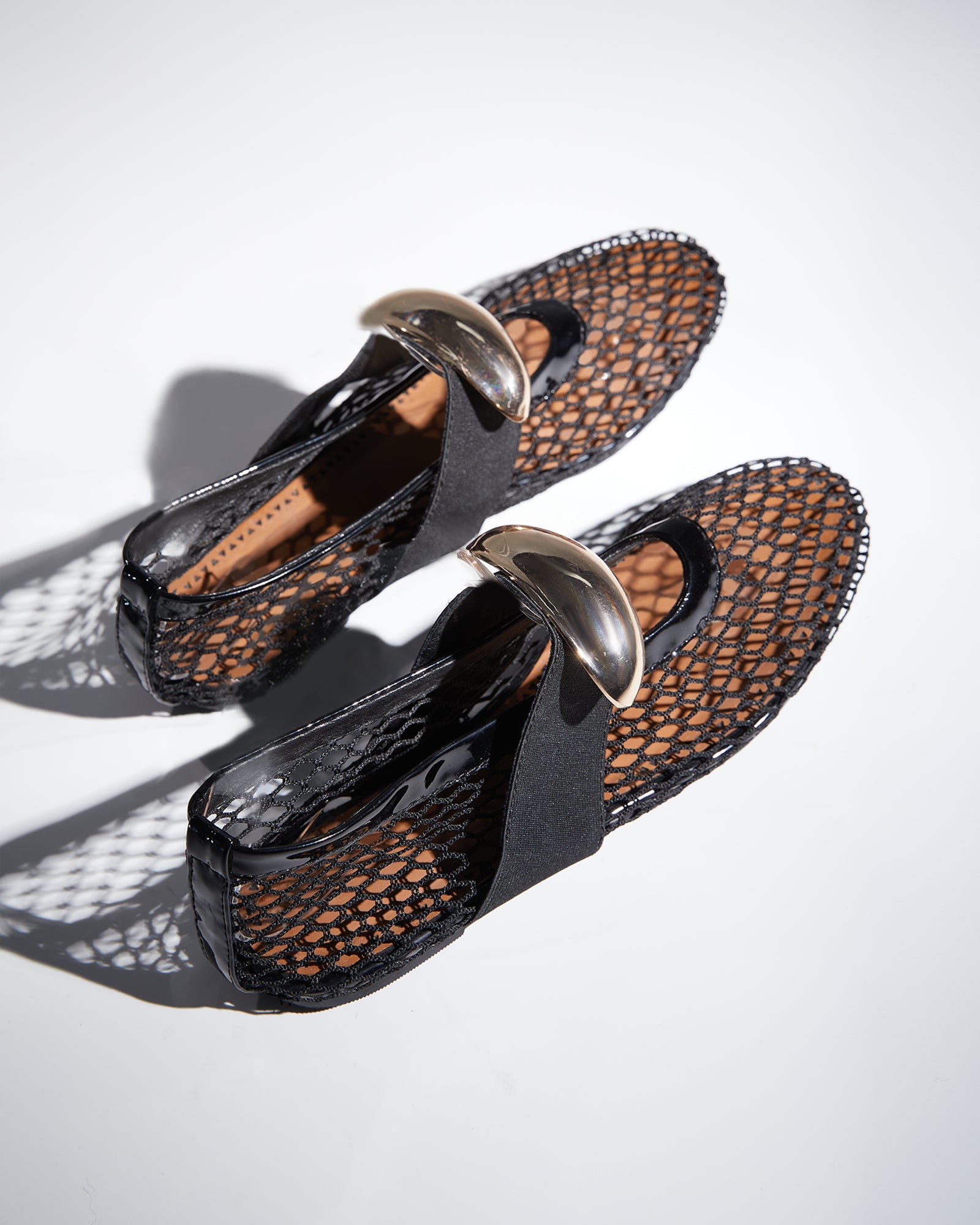 Elevate your style with Aria Hardware Buckle Fishnet Ballet Flats. Featuring a unique hardware buckle and fishnet design, these flats offer a chic and edgy look. The comfortable fit and sturdy construction make them perfect for all-day wear. Step out in confidence and turn heads with these statement-making flats!