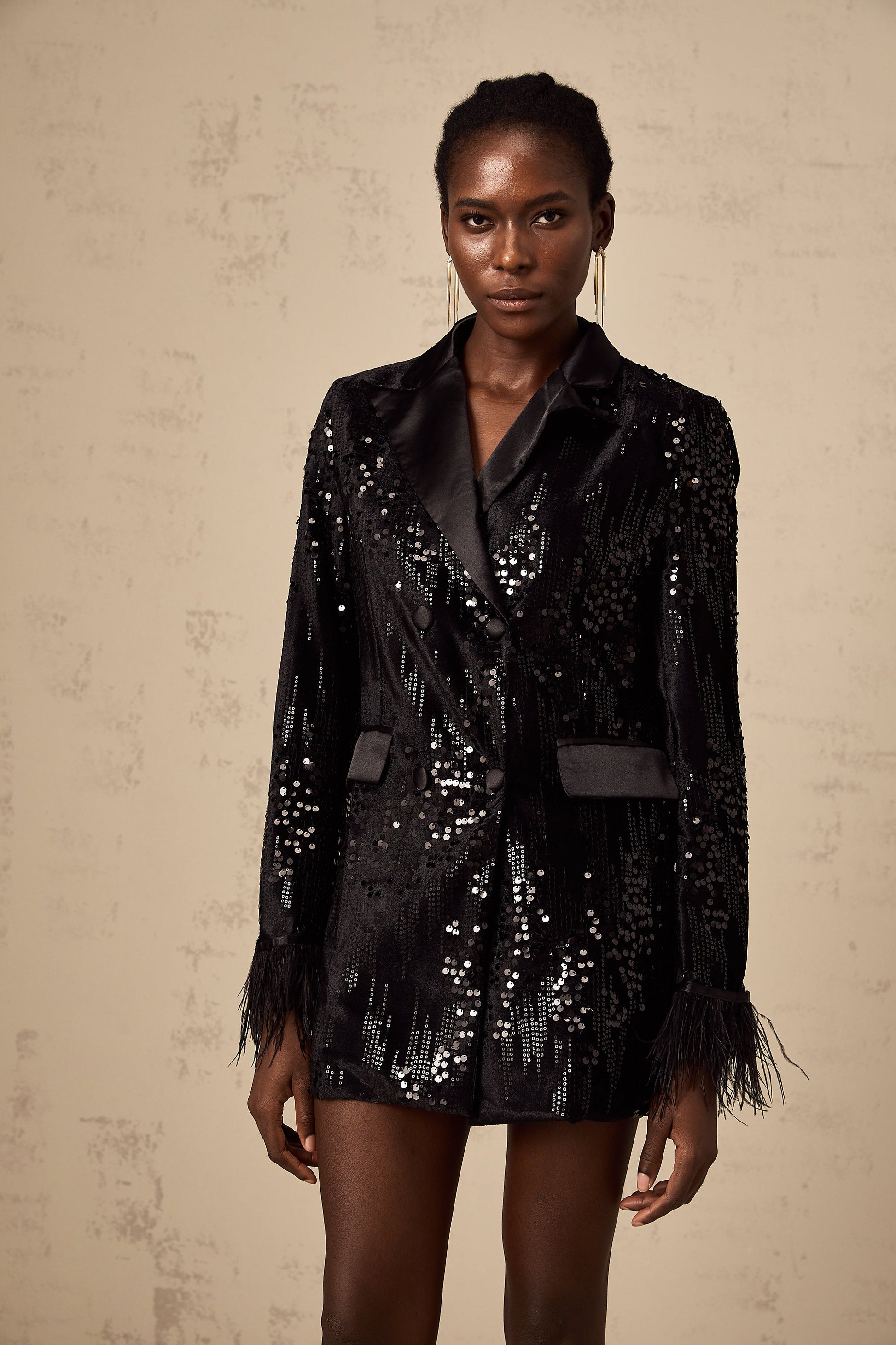 Ariane black feather-trim sequin-embellished blazer