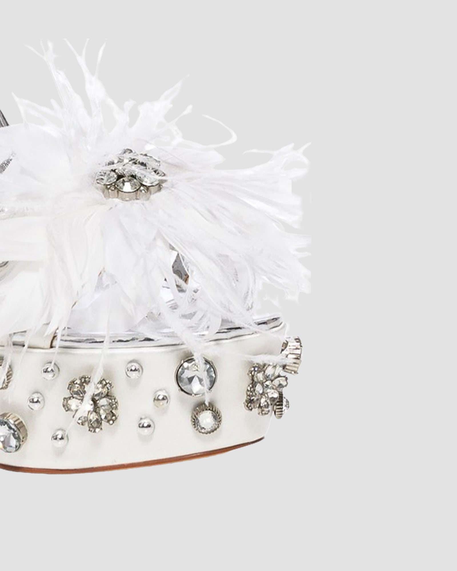 Elevate your style with the Armida Feather Strap Platform Sandals In White. With a unique feather strap design and a platform sole, these sandals will add a touch of elegance to any outfit. The sturdy platform offers comfort and stability, making them perfect for all-day wear.
