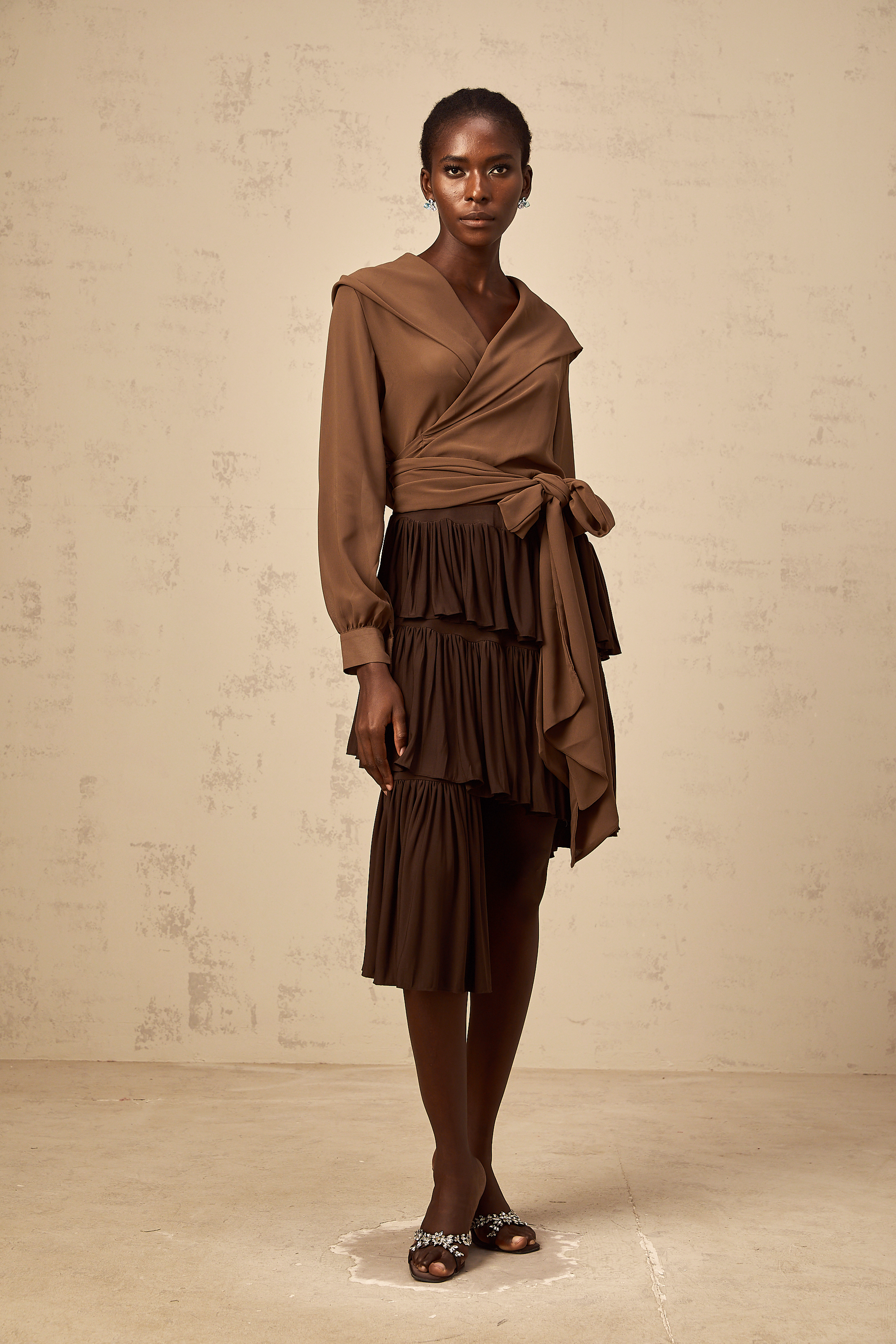 Astrid brown asymmetrical pleated tiered mini skirt