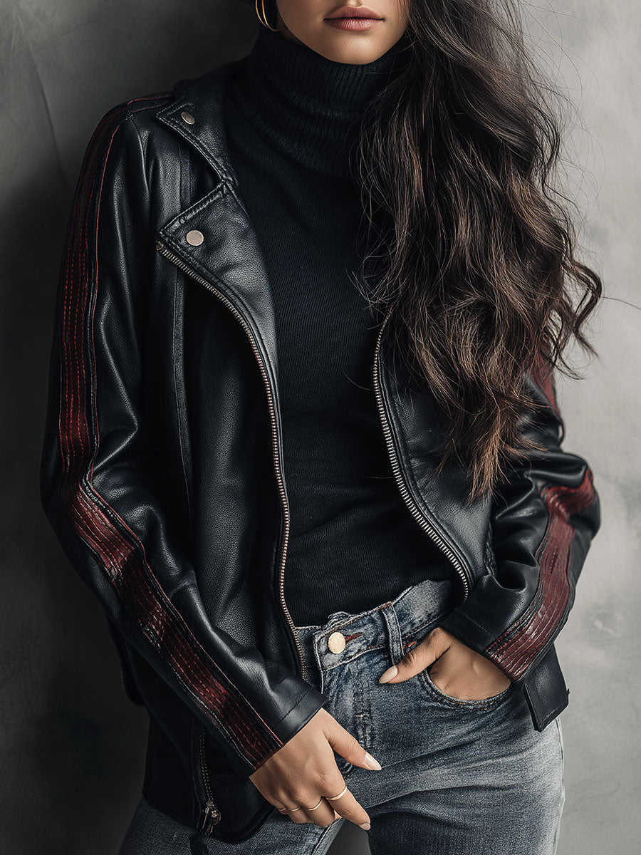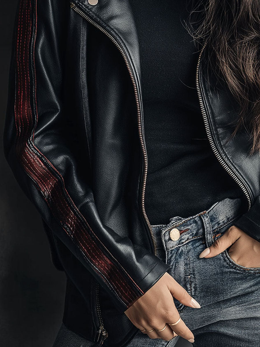 This Asymmetric Zipper Black Eco Leather Moto Biker Jacket with Burgundy Stripes is perfect for those who want to make a bold fashion statement while remaining eco-conscious. Its versatile styling options make it a valuable addition to any wardrobe, suitable for a variety of occasions, from casual outings to night events.