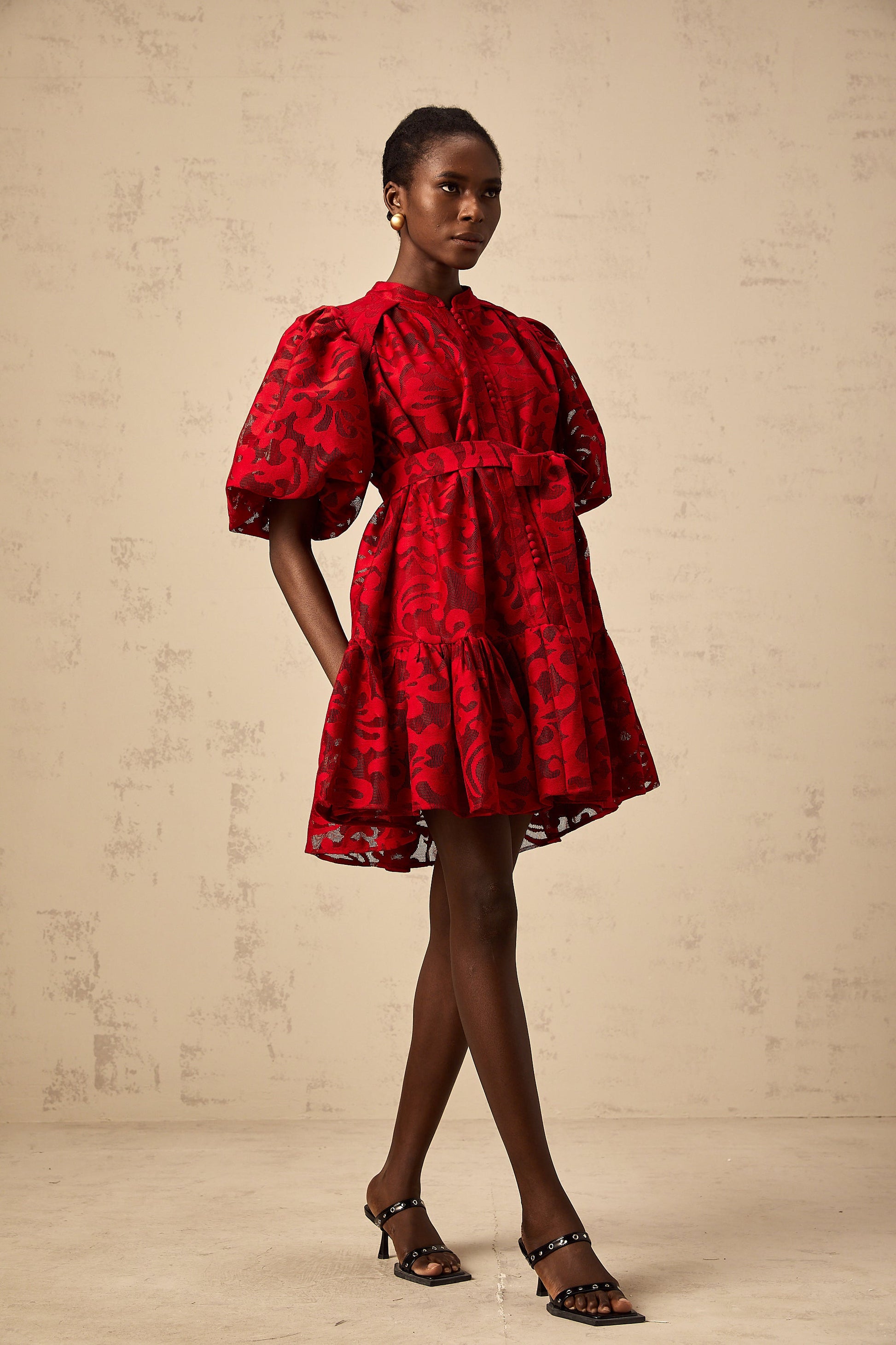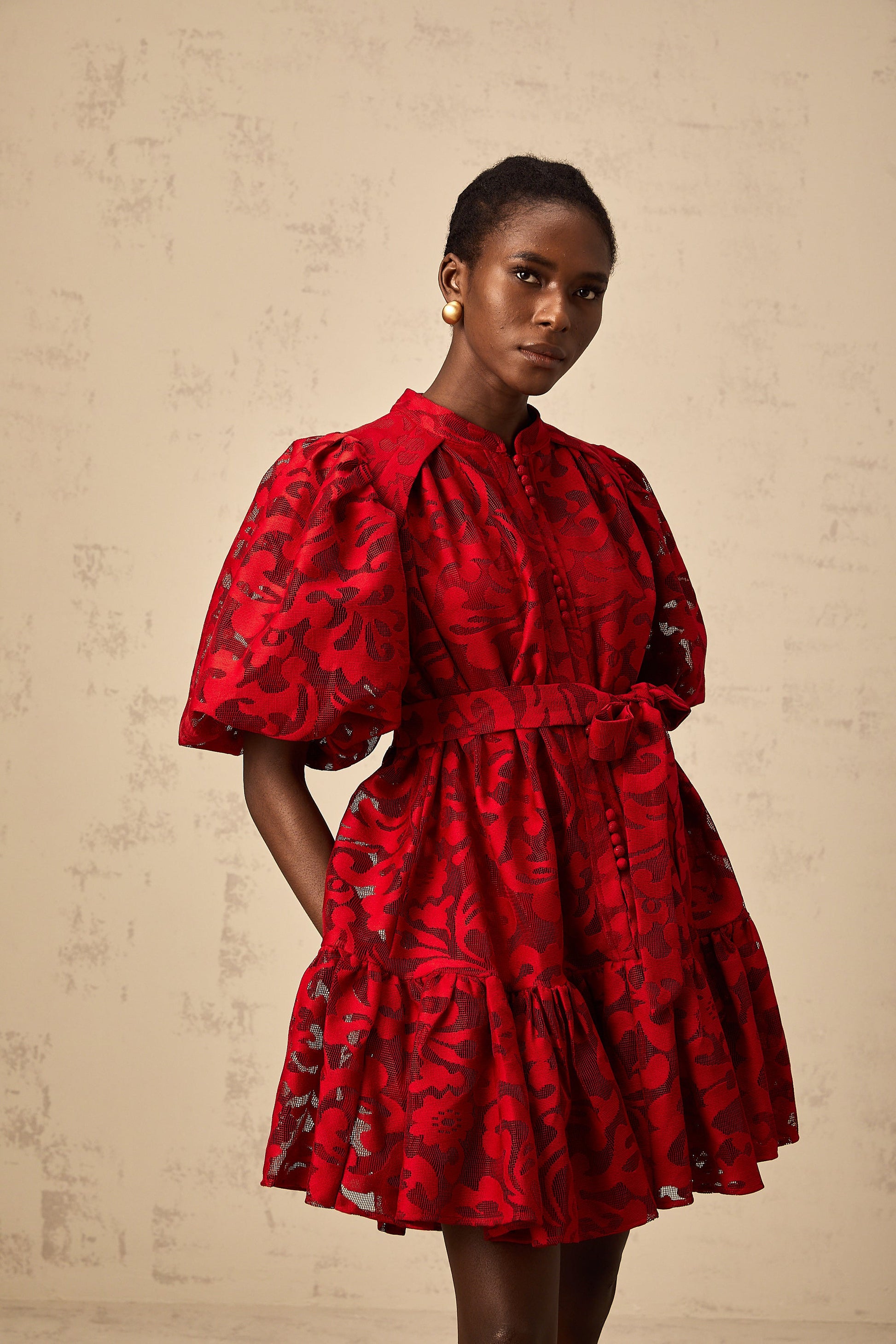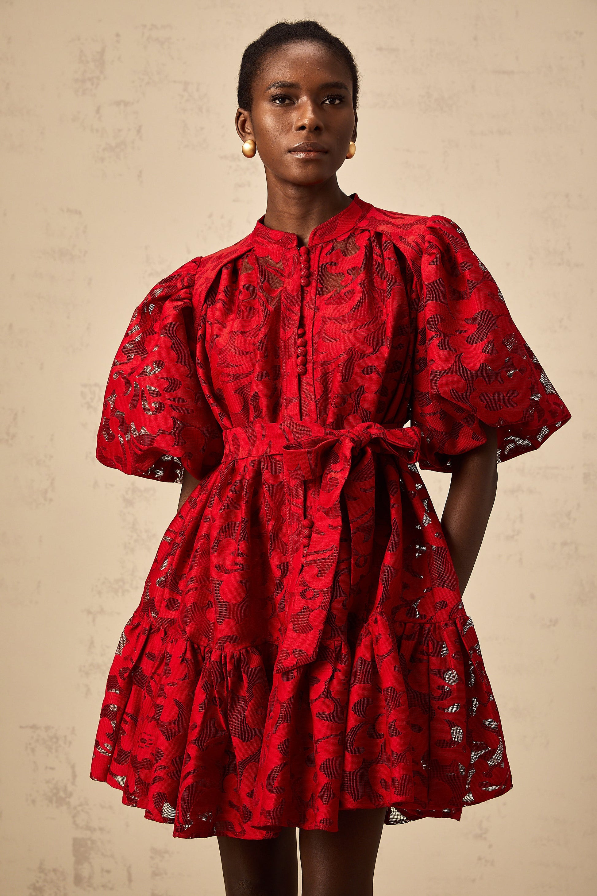 AthÉnaÏs red jacquard semi-sheer mini dress