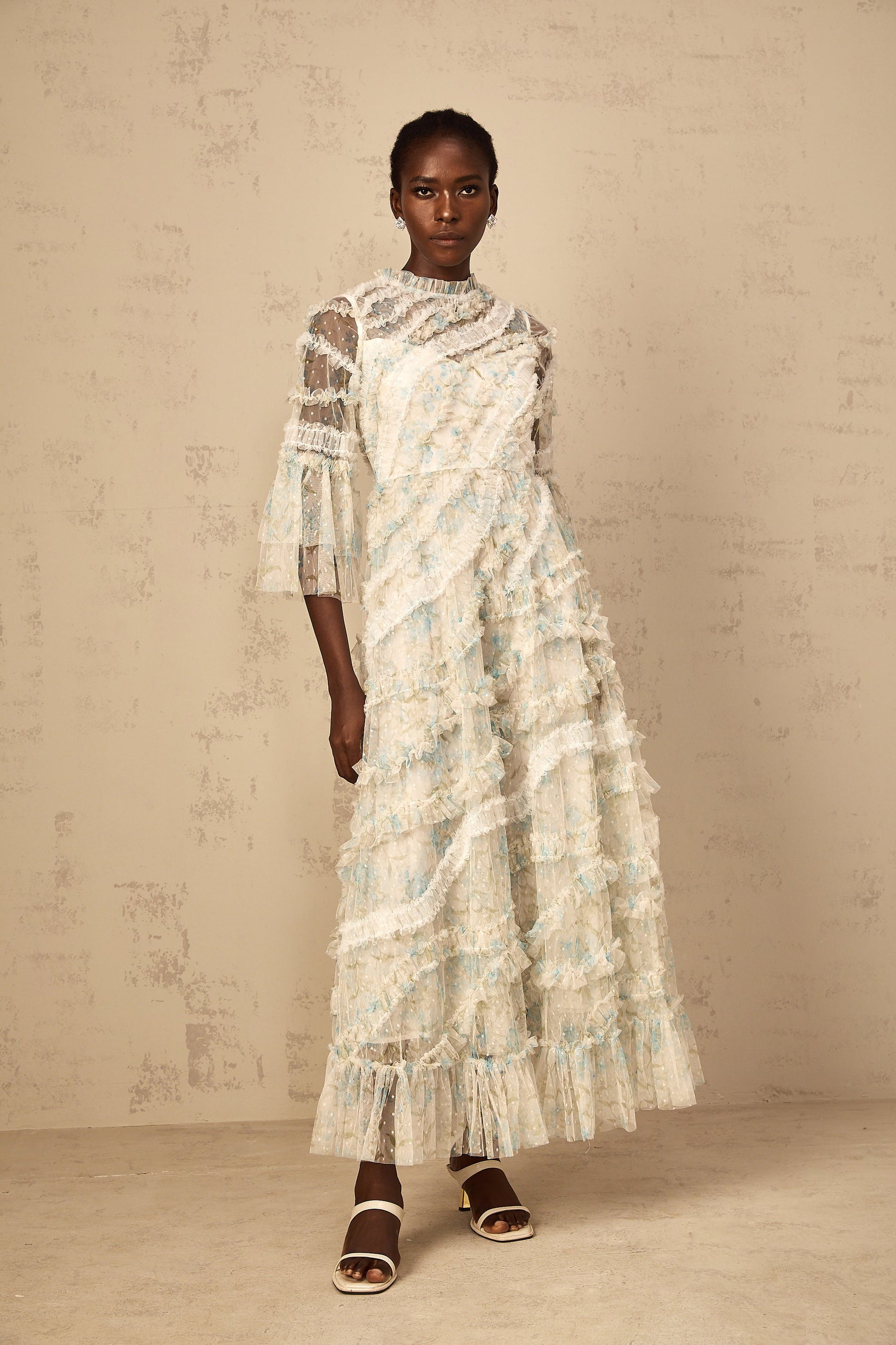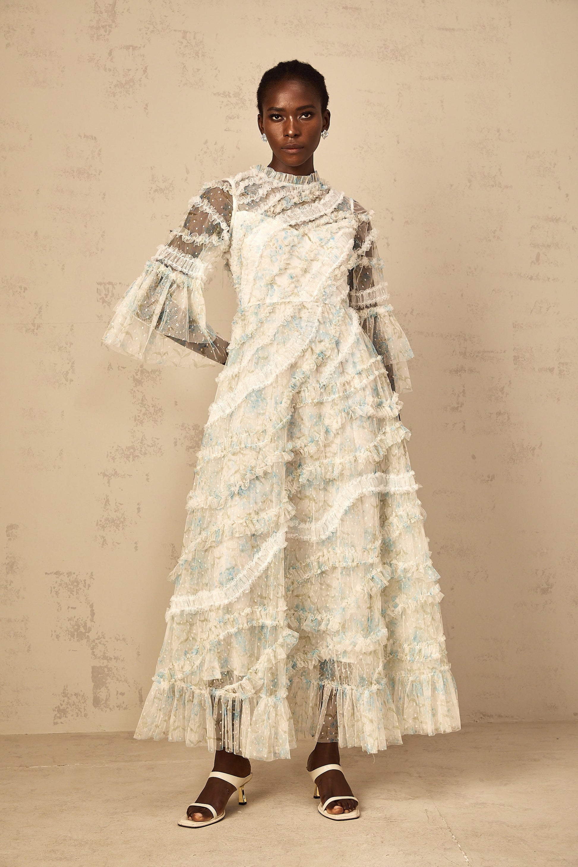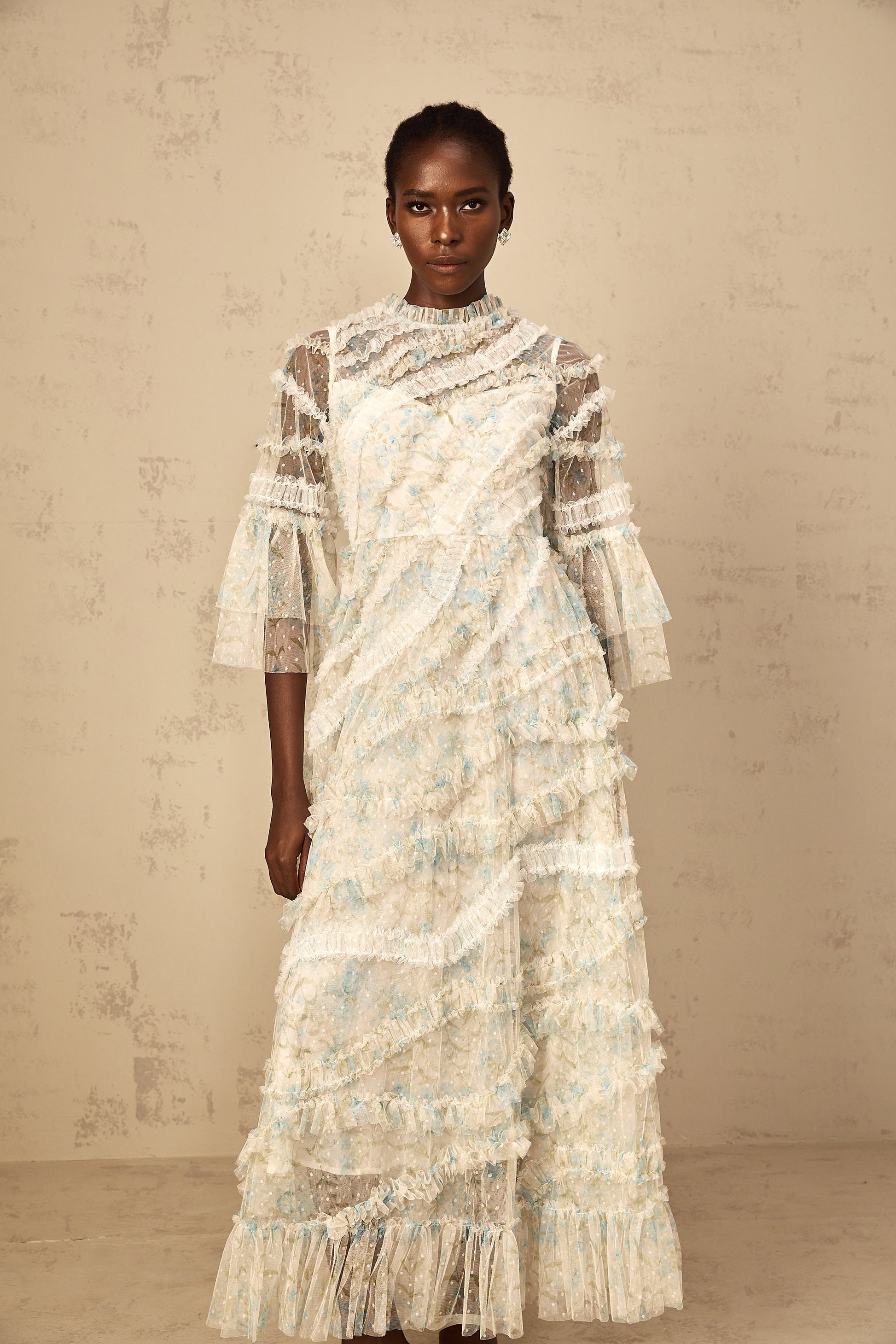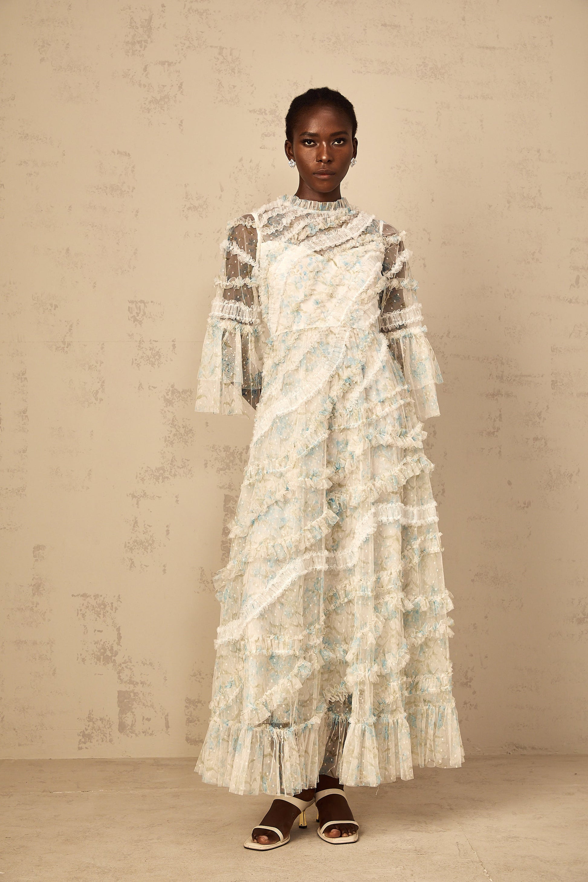 Aurianne Blue Floral Print Ruffled Tulle Maxi Dress