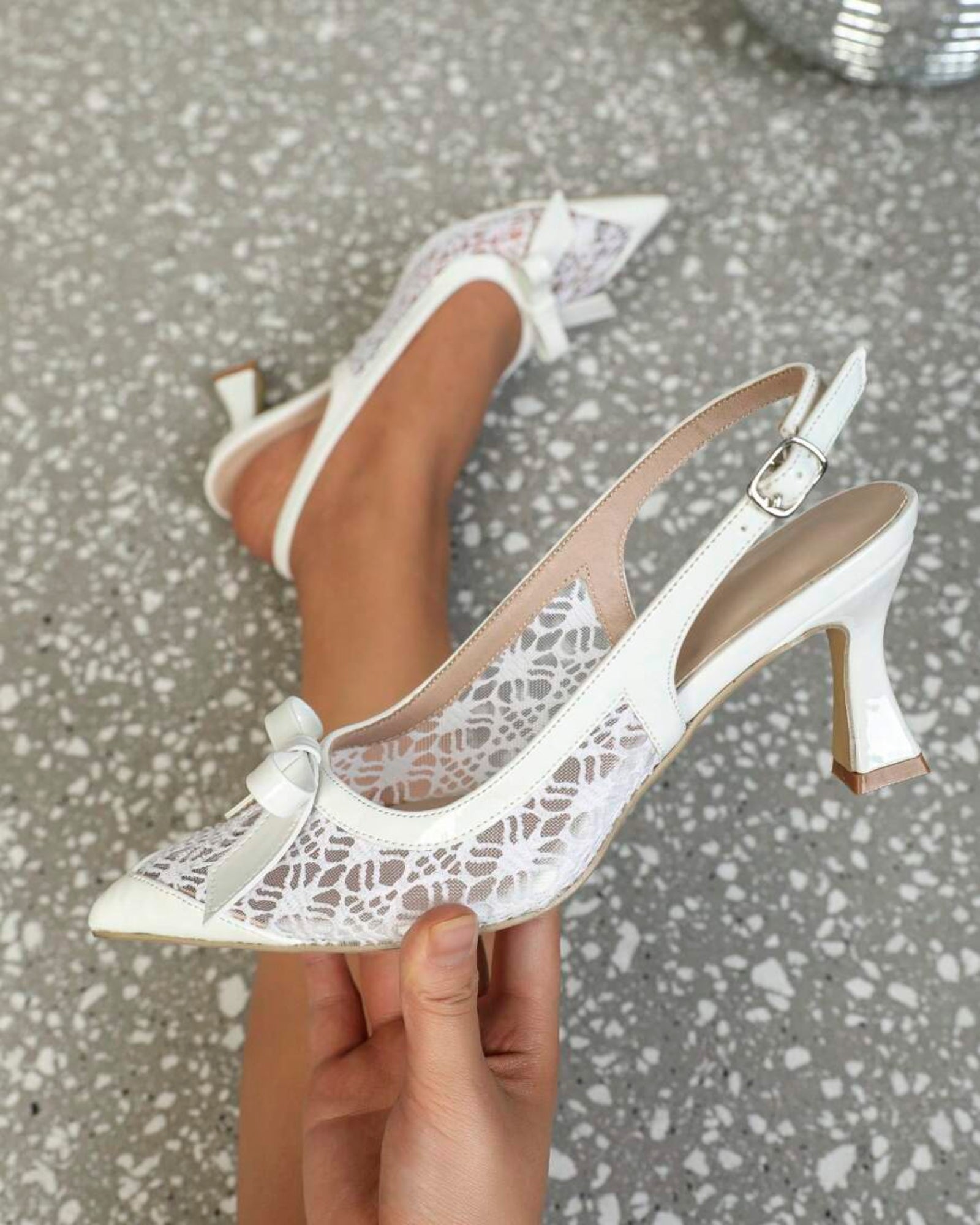 Elevate your style with the Baako Lace Bow Slingback Pumps in White. Featuring delicate lace detailing and a charming bow accent, these pumps blend elegance with a modern touch. The slingback design ensures a secure, comfortable fit, perfect for all-day wear. Ideal for special occasions or adding a sophisticated flair to your everyday look, these pumps make a graceful statement wherever you go.