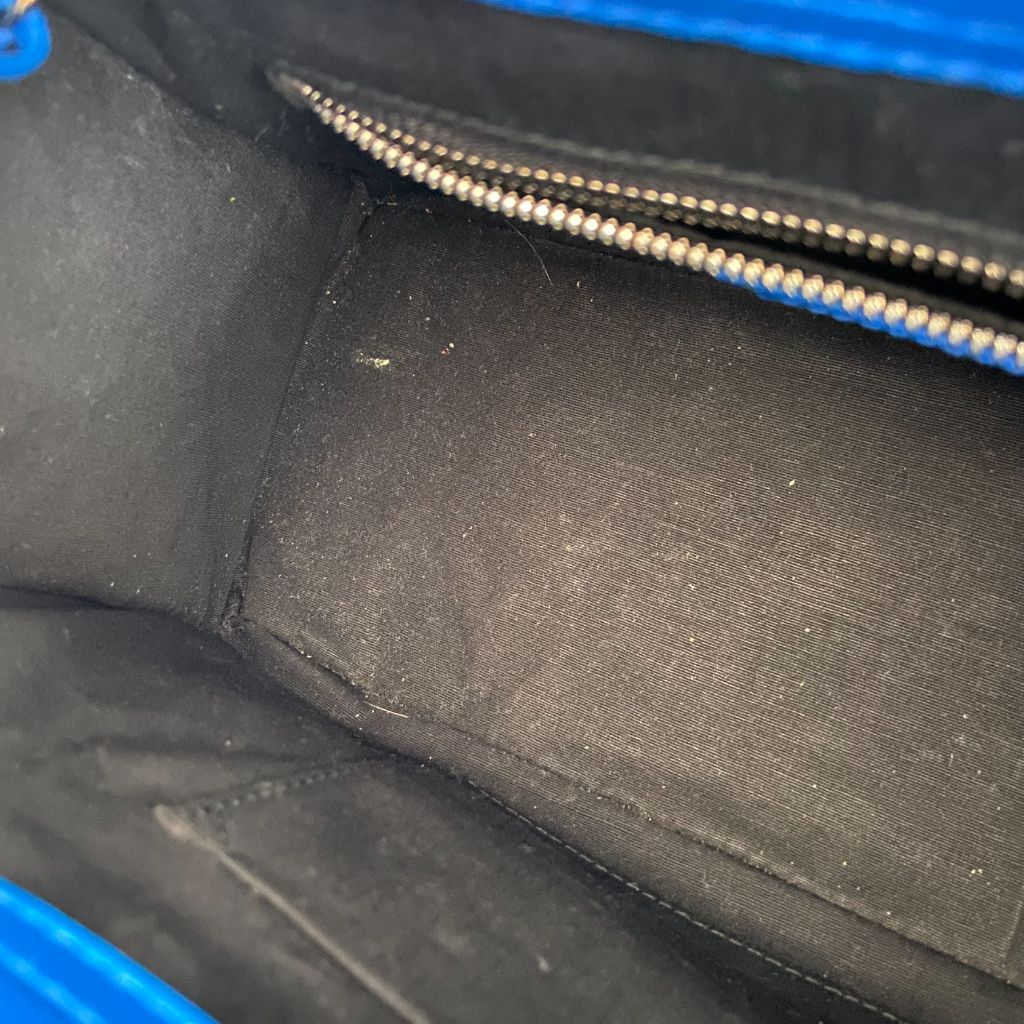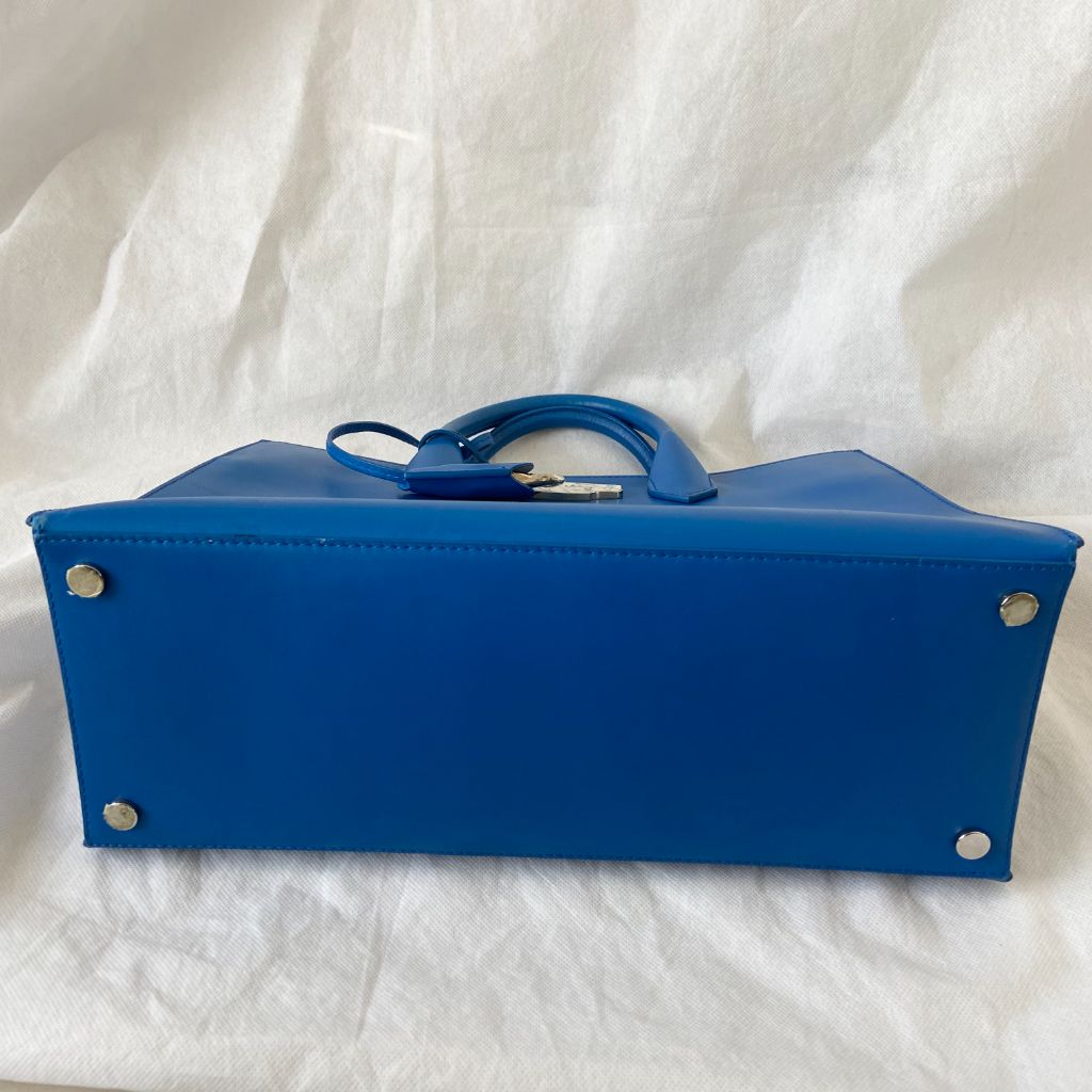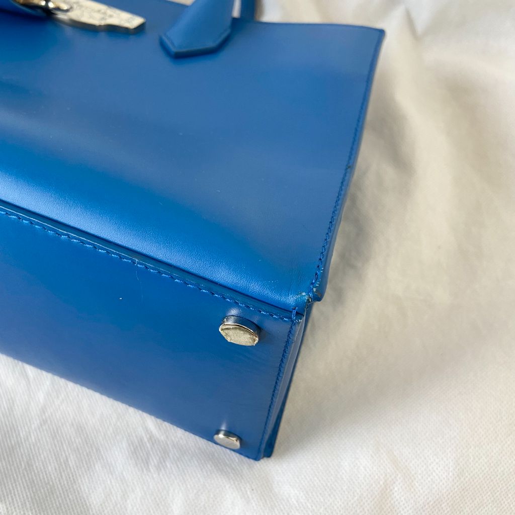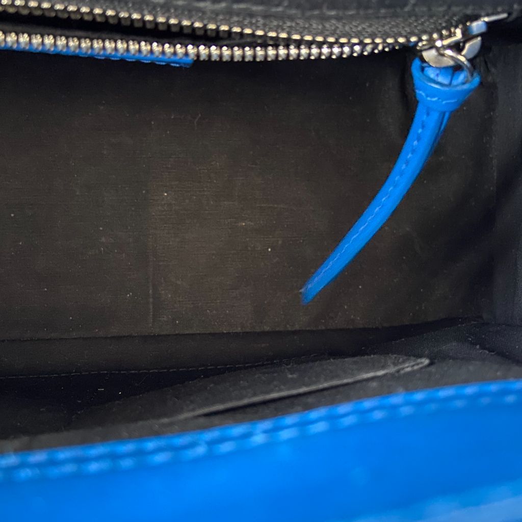 Small blue Balenciaga All Afternoon Bag, perfect for those afternoon tea parties. Includes zipper compartment inside with a classic black interior.