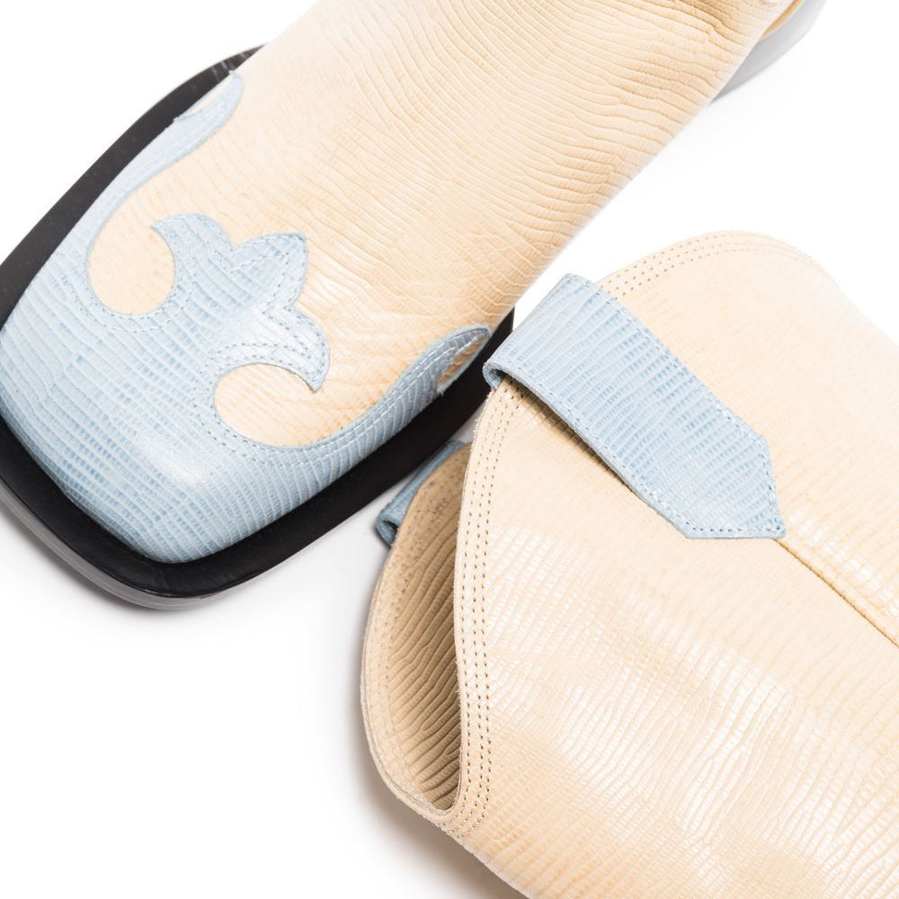 - Special Designs :Beige Vegan leather knee high boots with Blue Vegan leather designes and low chunky heels
