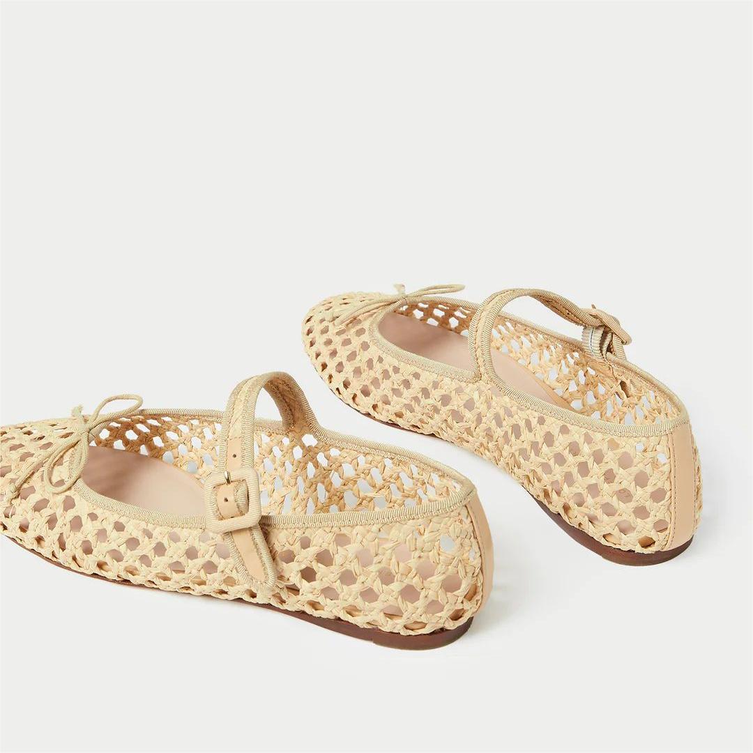 - Special Designs: Beige Mary Janes feature raffia cut out, buckled strappy, and a bow accent design.