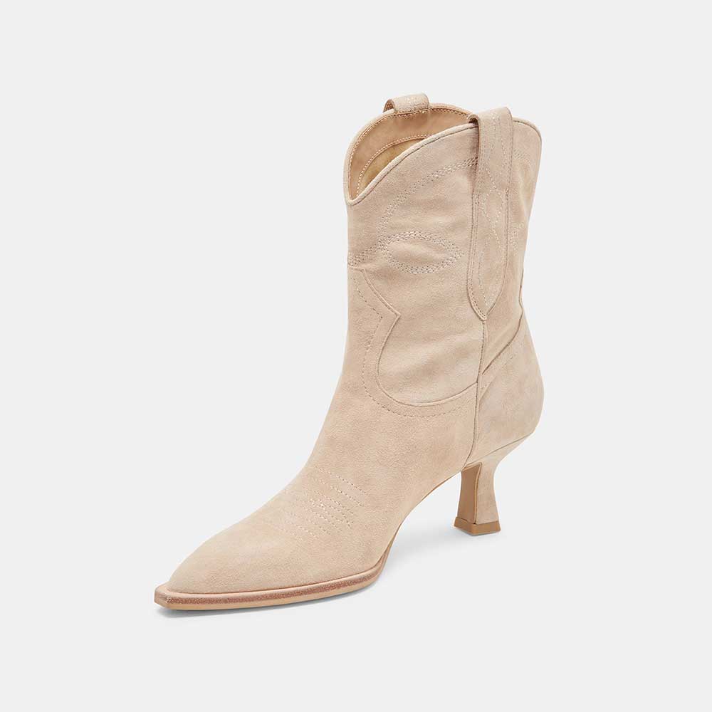 Beige Pointed Toe Kitten Heel Pull Tab Ankle Boots with Stitching