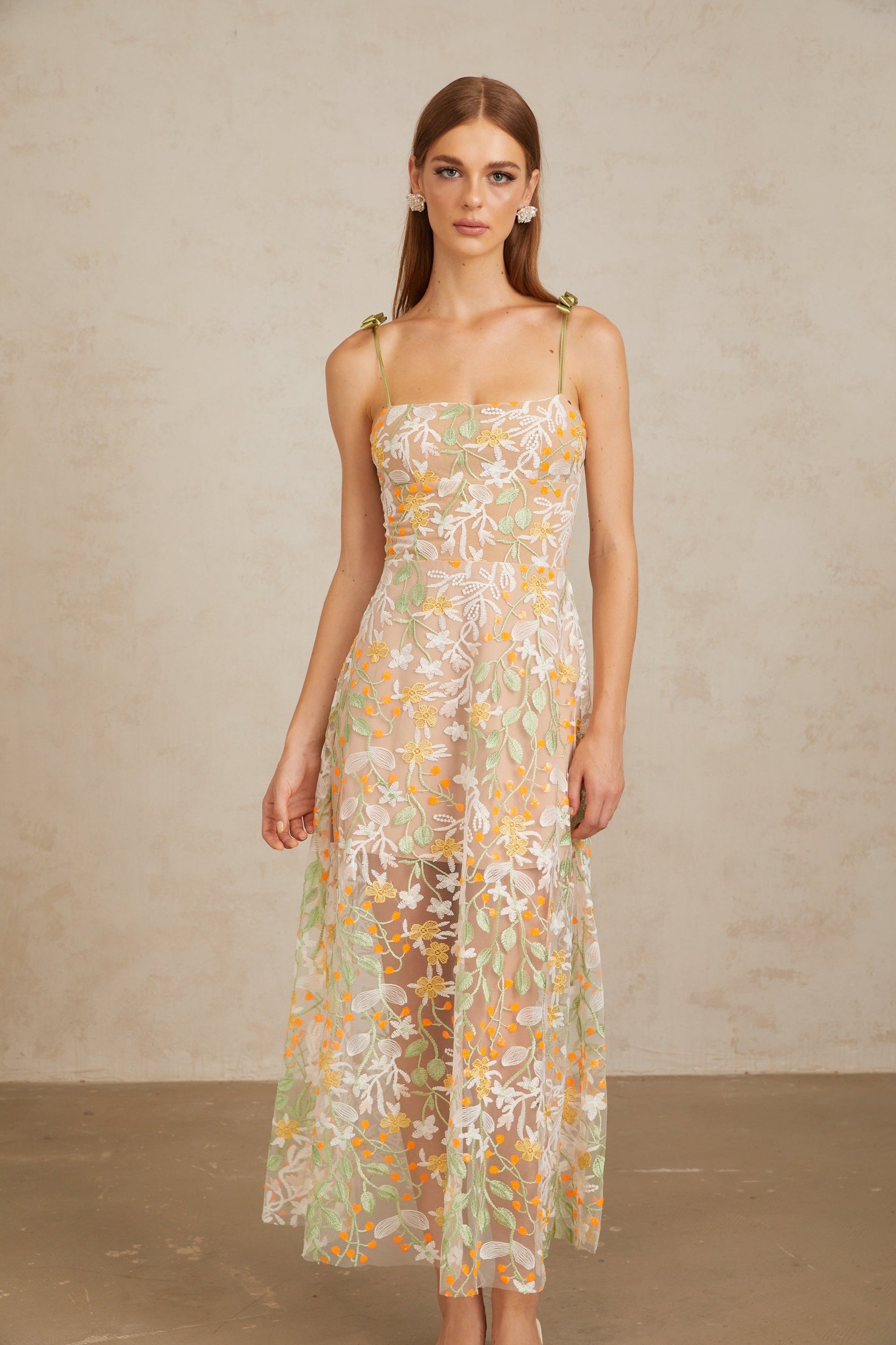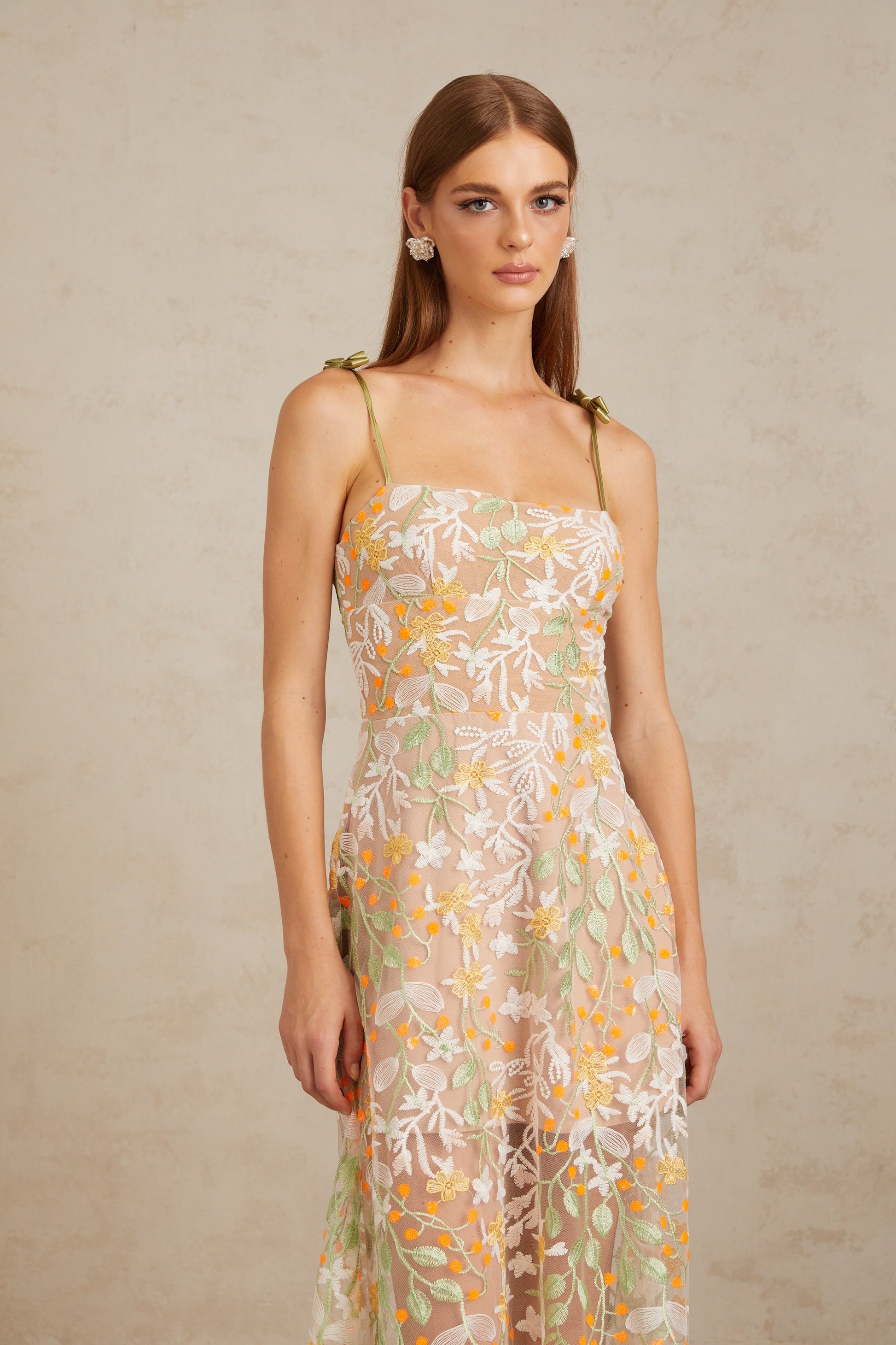 Bérénice Neutral Floral Embroidered Flare Maxi Dress