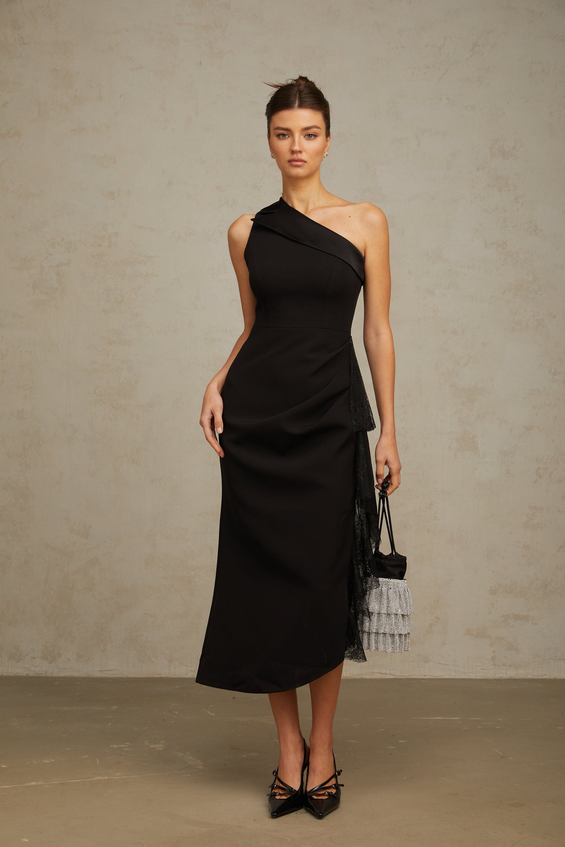 Bernadette black lace-panell asymmetrical midi dress