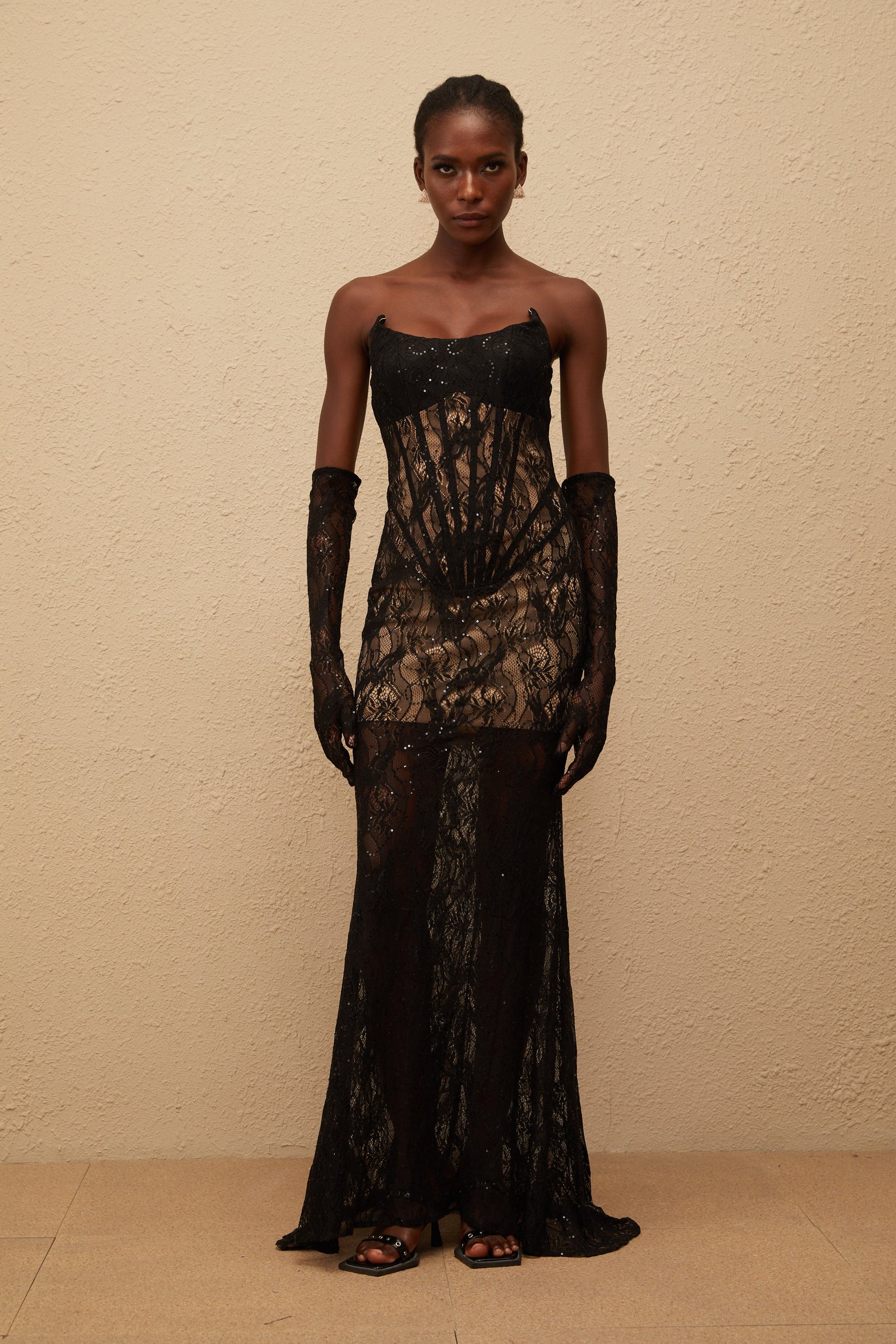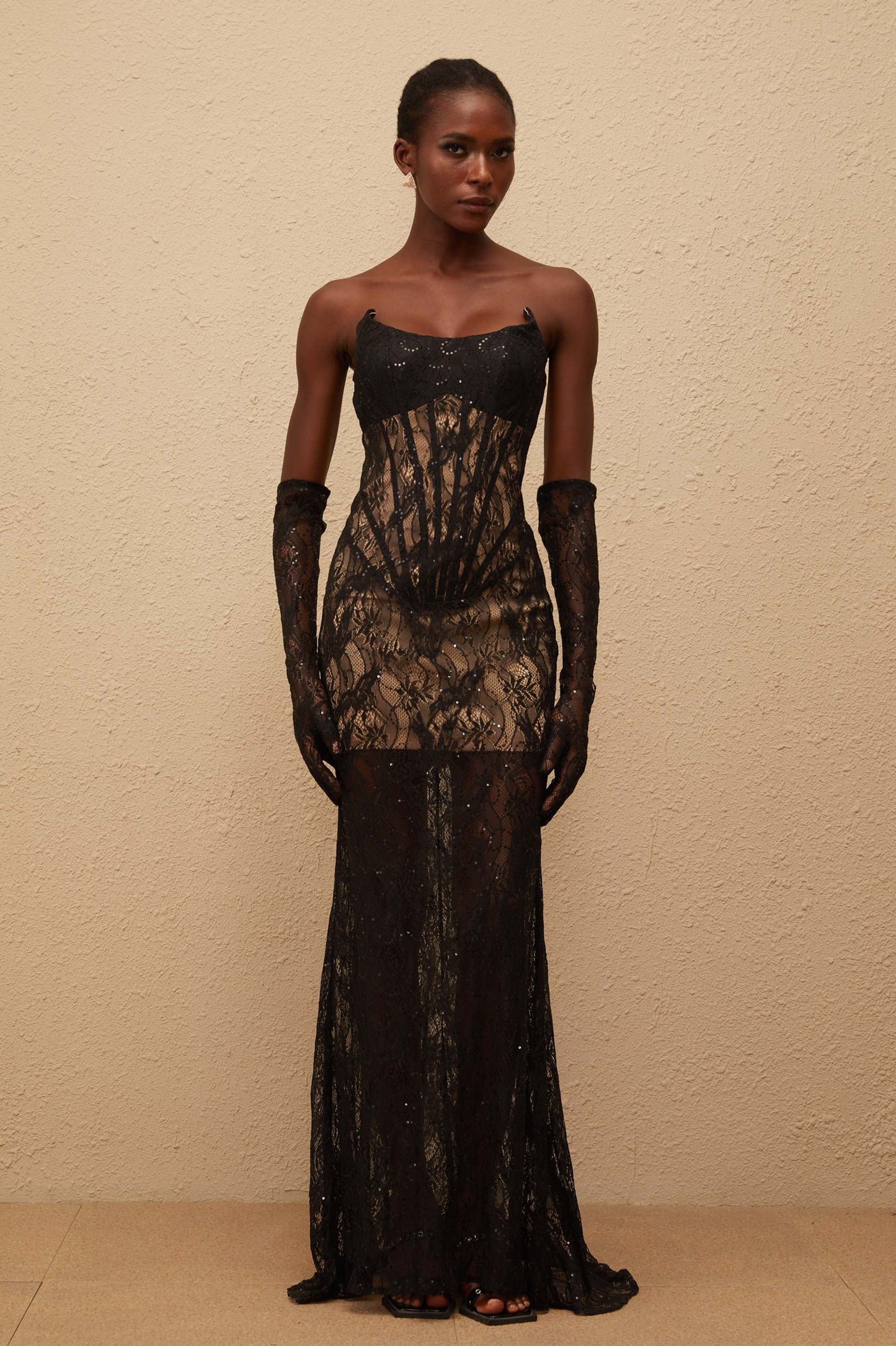 Bertille Black Floral Lace Corset Maxi Dress