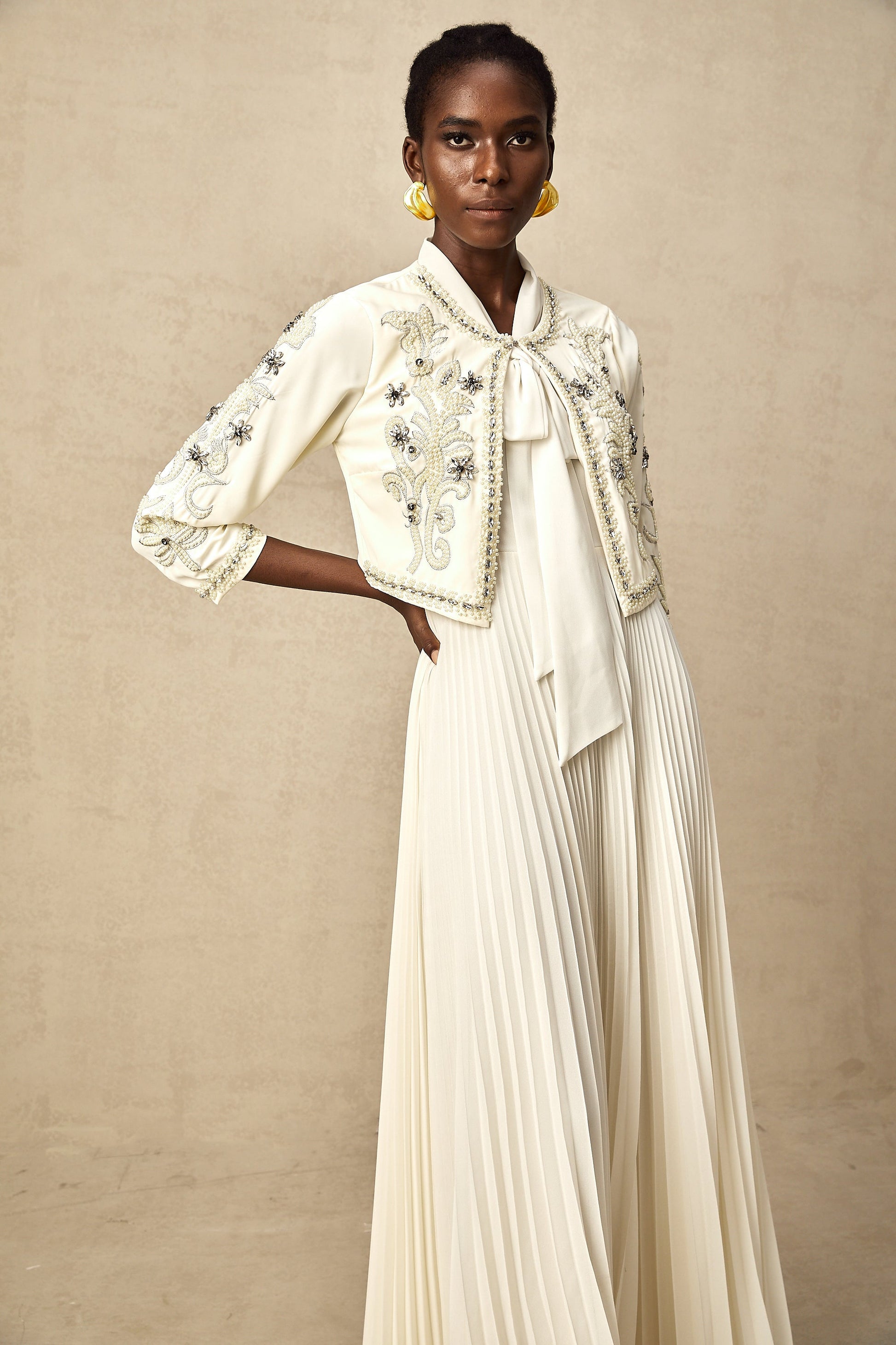 Blanche White Embellished Pleated Two-Piece Jacket and Dress Set