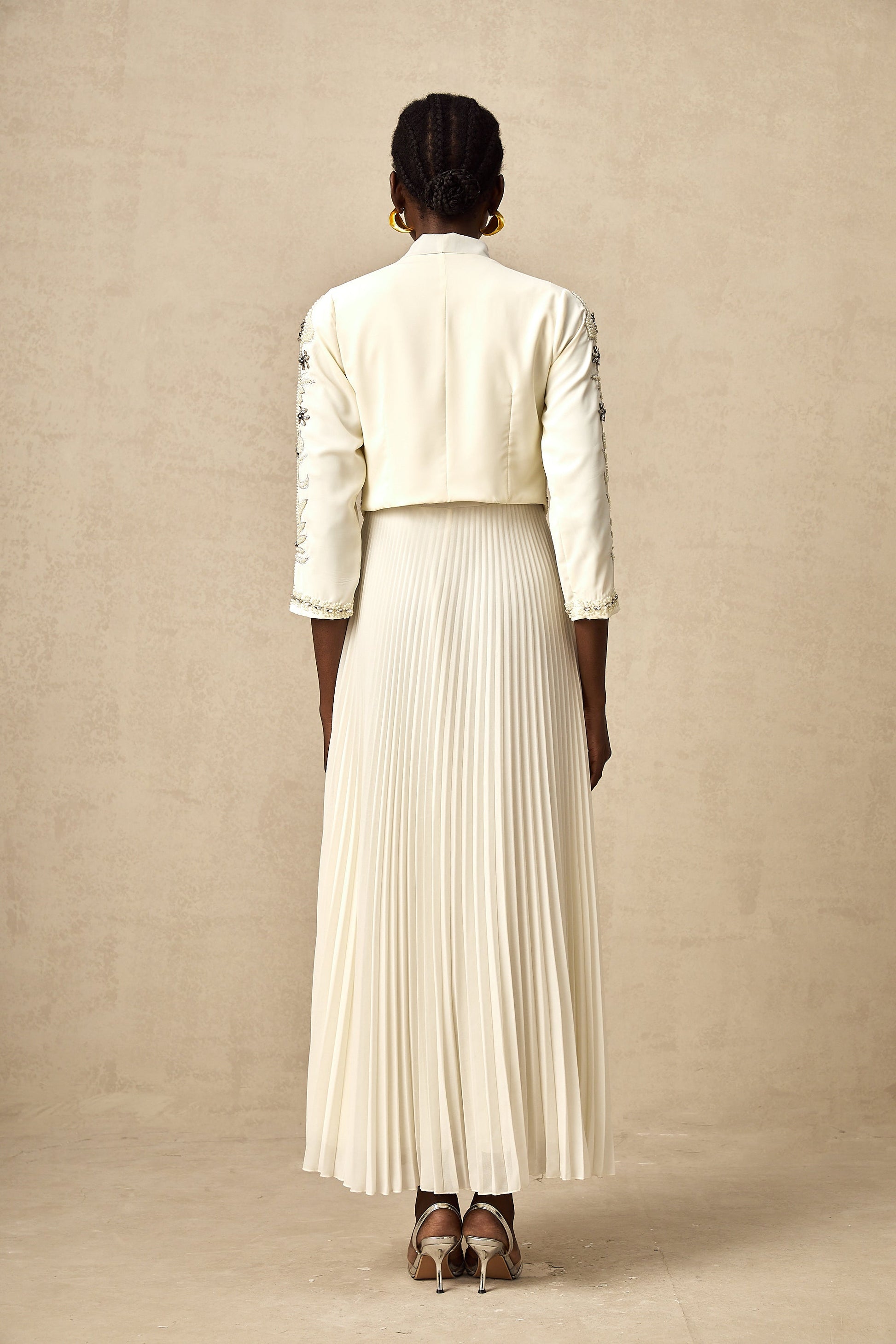 Blanche White Embellished Pleated Two-Piece Jacket and Dress Set