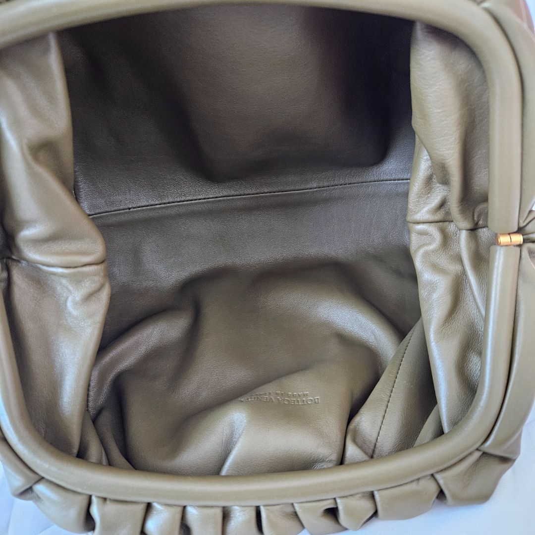 Bottega Veneta Olive Green Leather The Pouch cutch, features soft oversized clutch features a magnetic frame enveloped in folds of Nappa leather to create a voluminous, rounded shape. The single internal compartment is lined in calf leather.