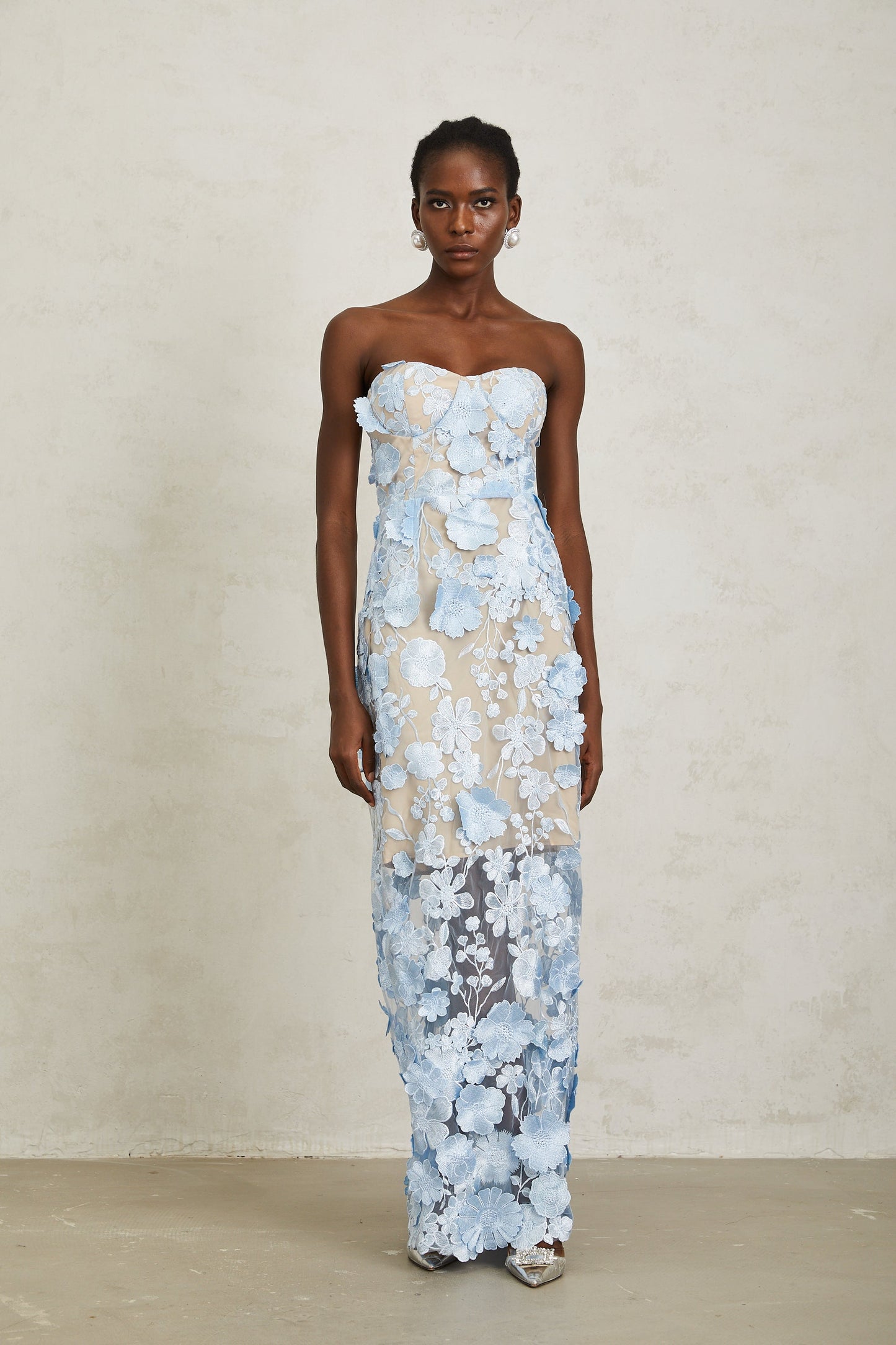Brigitte Blue Floral Appliqué Corset Maxi Dress