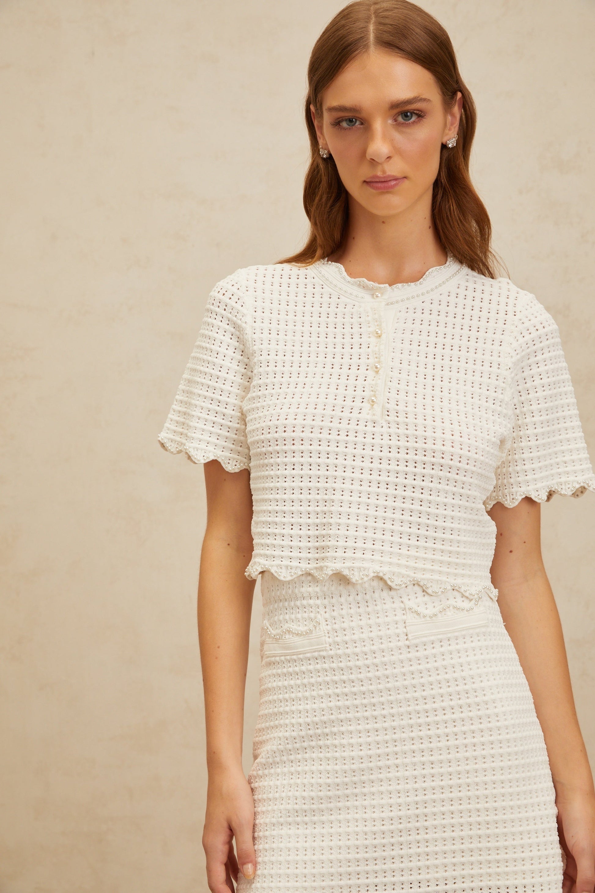 Maxanne cream-white ruffled pointelle-knit top & skirt matching set