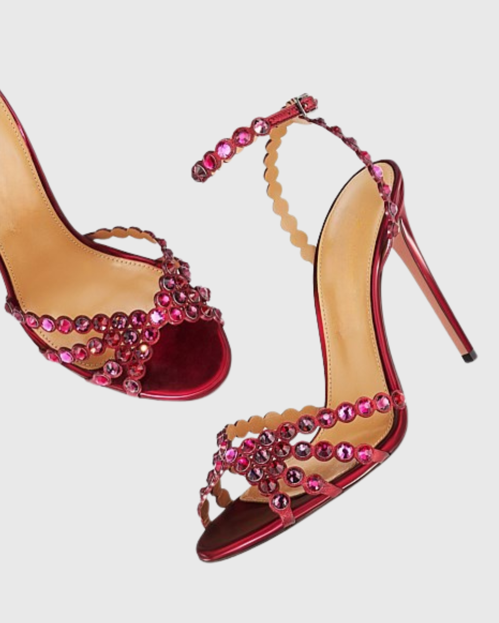 Step into elegance with the Cameo Rhinestone Embellished PVC Strap Sandals in Wine. Featuring sparkling rhinestones on clear PVC straps, these sandals add a touch of glamour to any outfit. The rich wine color complements the dazzling embellishments, making them perfect for both day and night occasions. Lightweight and stylish, they offer a chic way to elevate your look with comfort and confidence.
