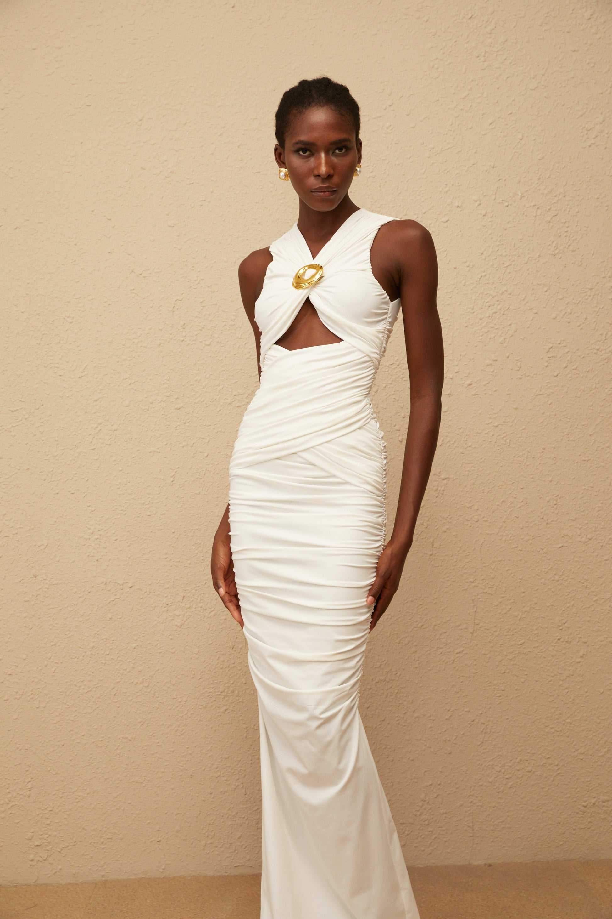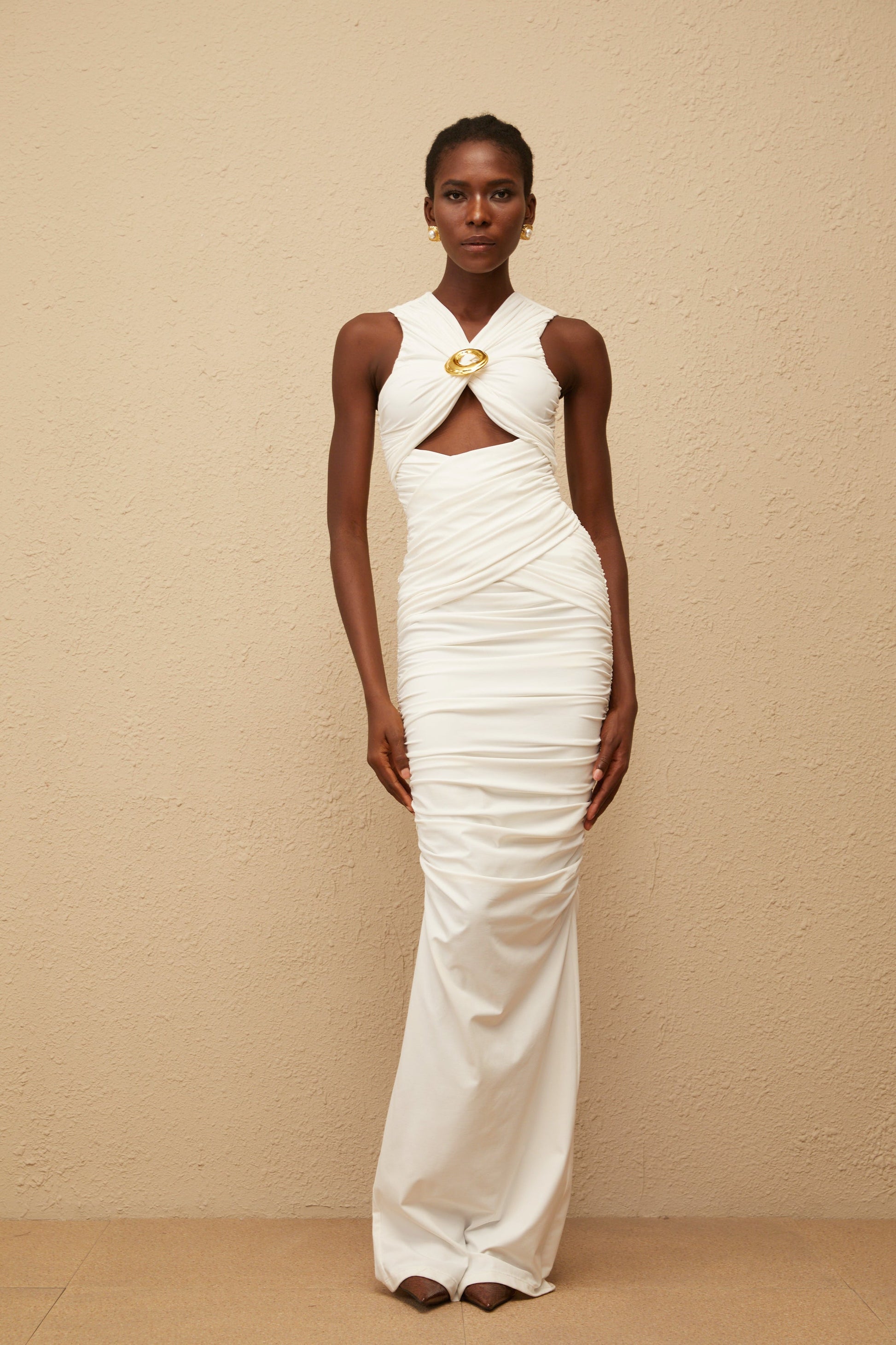 Capucine White Ruched Corset Maxi Dress