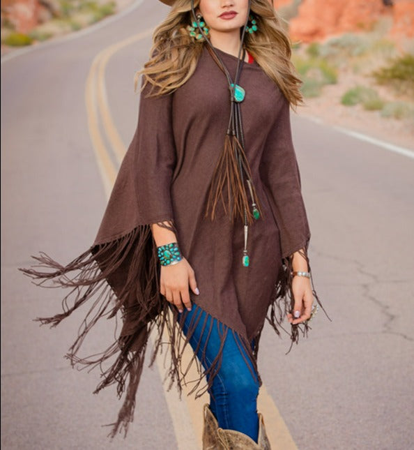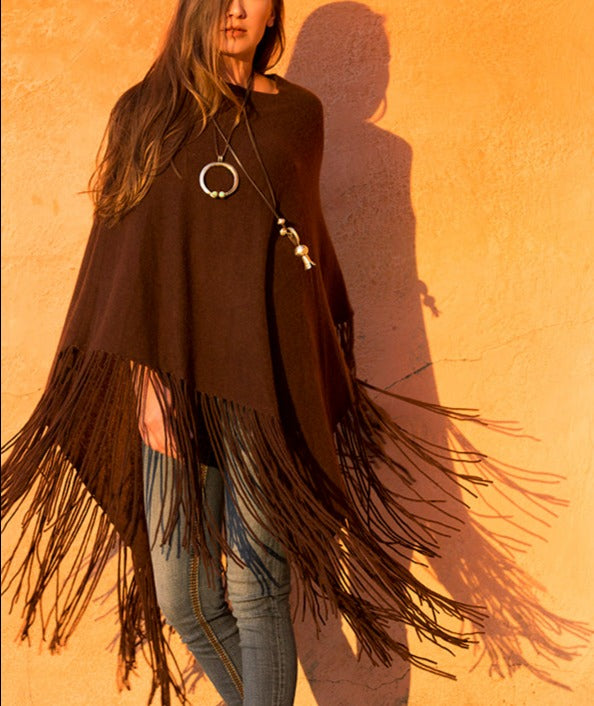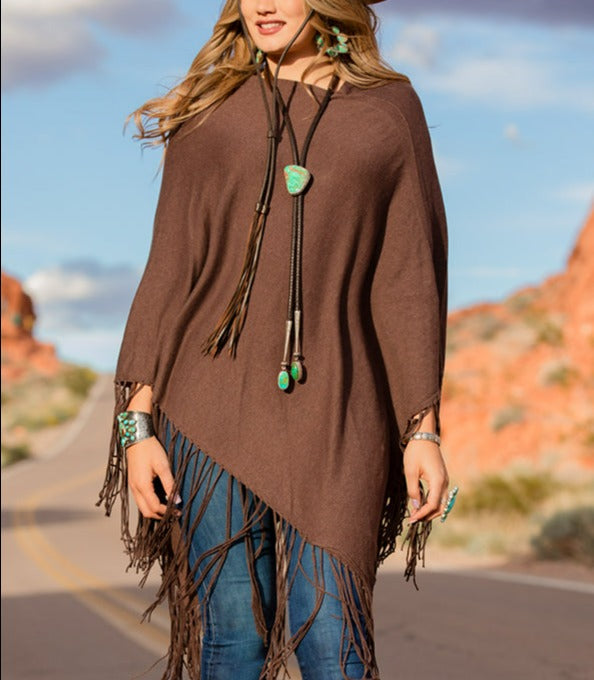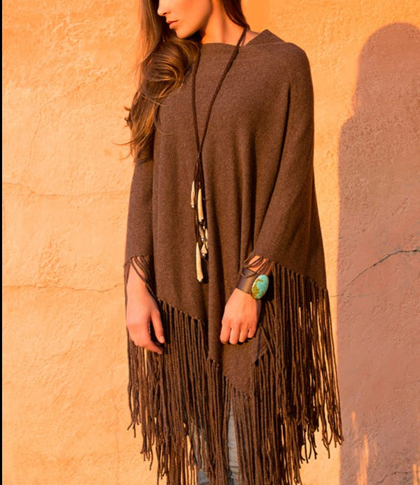 Aqua Boar and Cranberry fringe ponchos. The perfect finish to any outfit. Handcrafted cashmere and cotton is velvety soft with a sensual fluid drape and feel. An asymmetrical build with so many great ways to wear them! We stock in Aqua and Boar but order quick to insure you get one, we only did 12 each! Wonderful weight for those slightly chilled summer nights, or worn as a poncho over our lace skirt or Wild West mini! One size fits all.