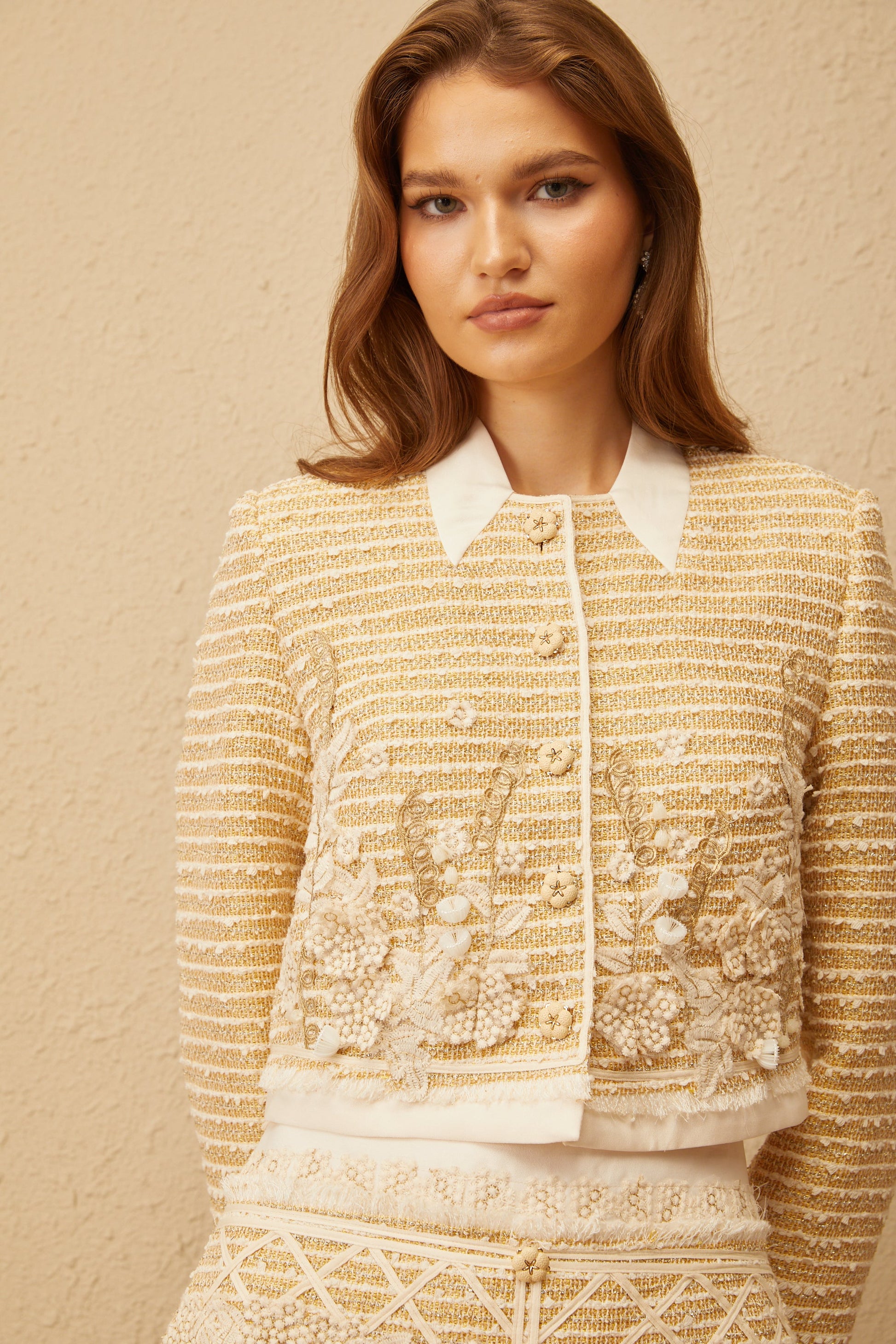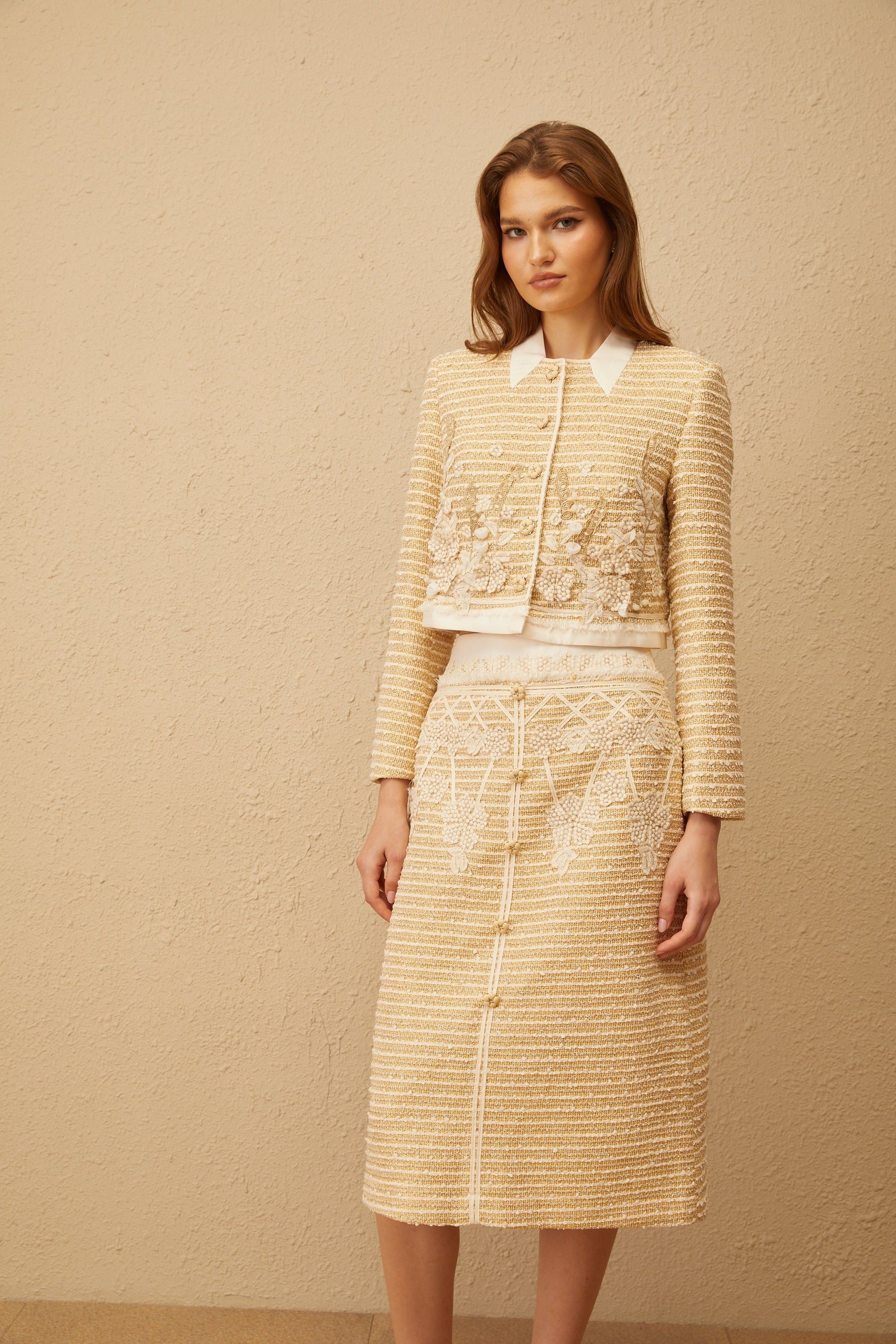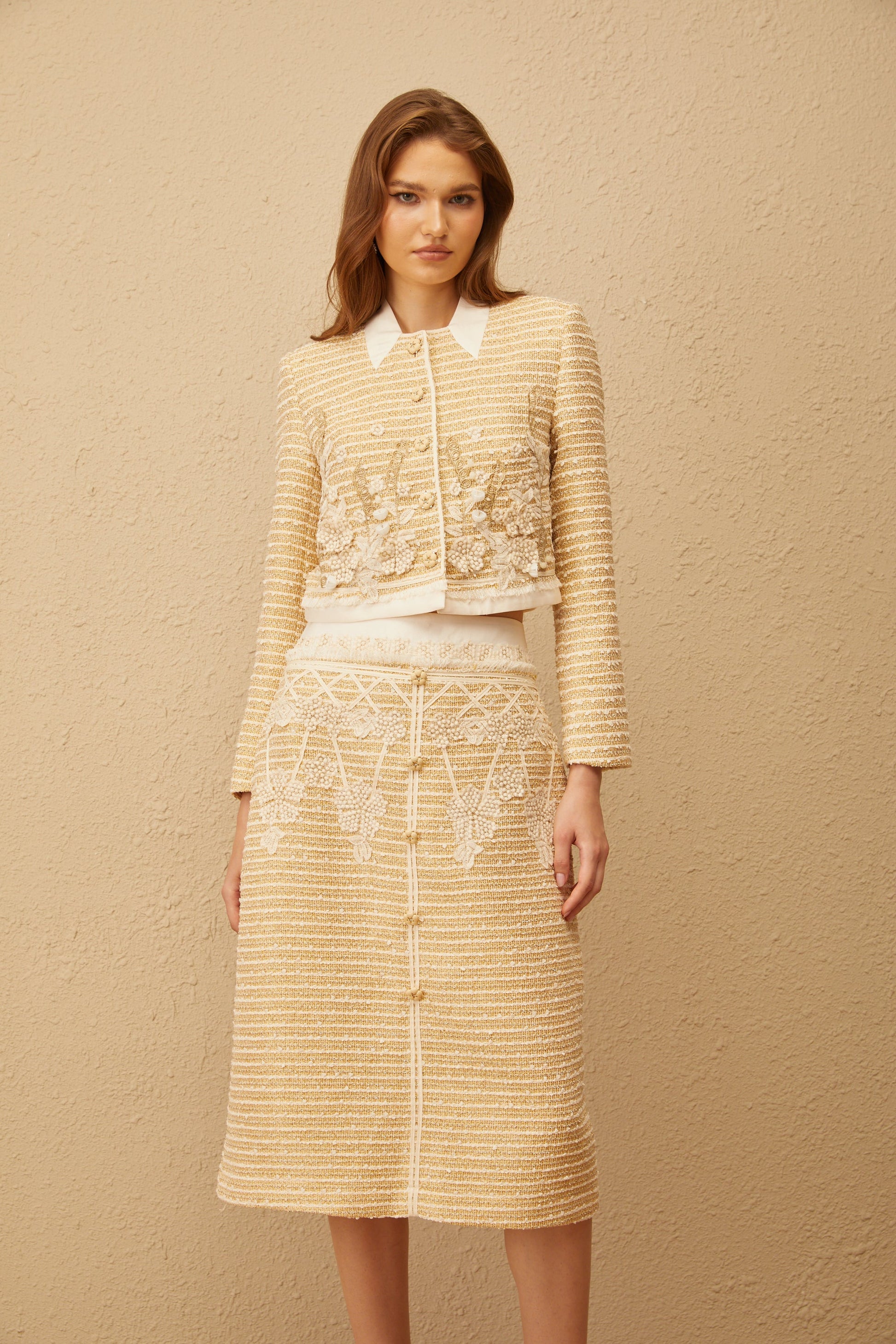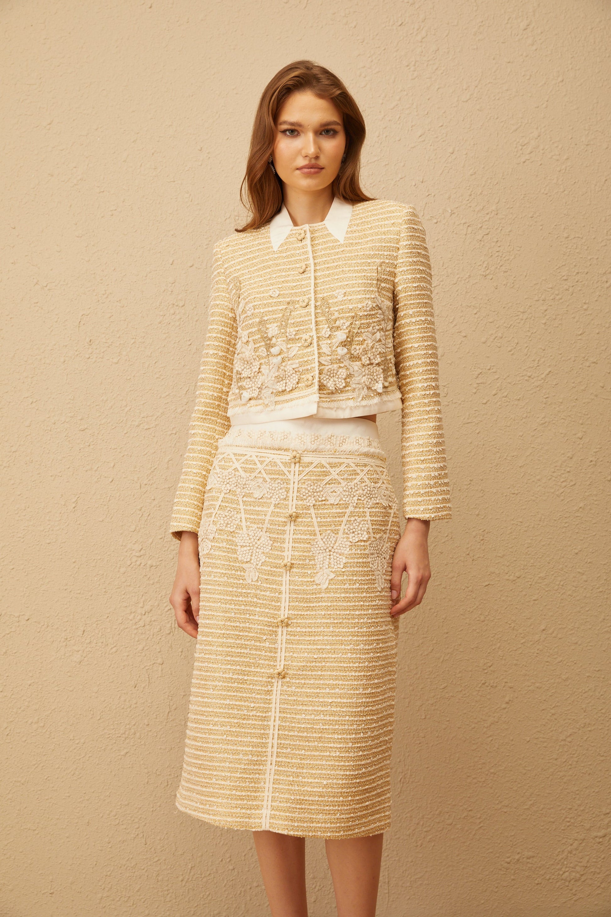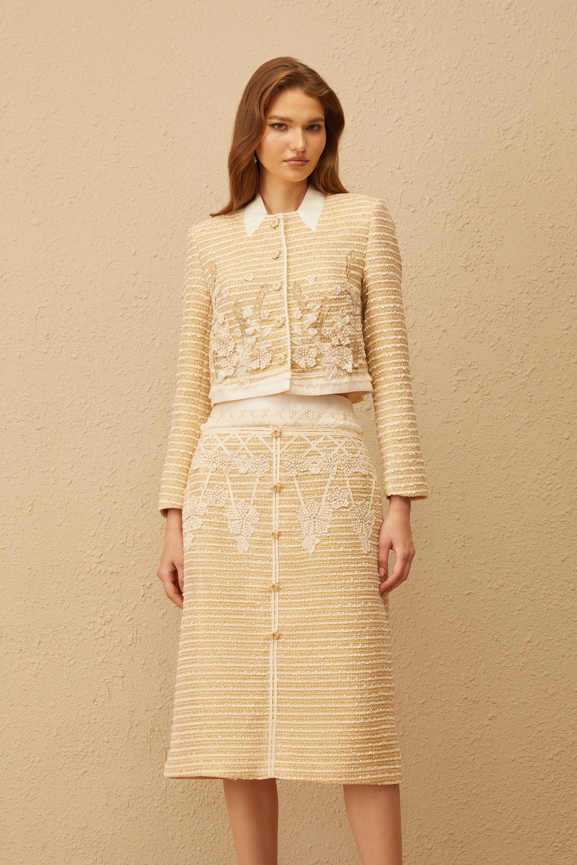 Catalina Neutral Floral Jacquard Tweed Jacket & Skirt Set