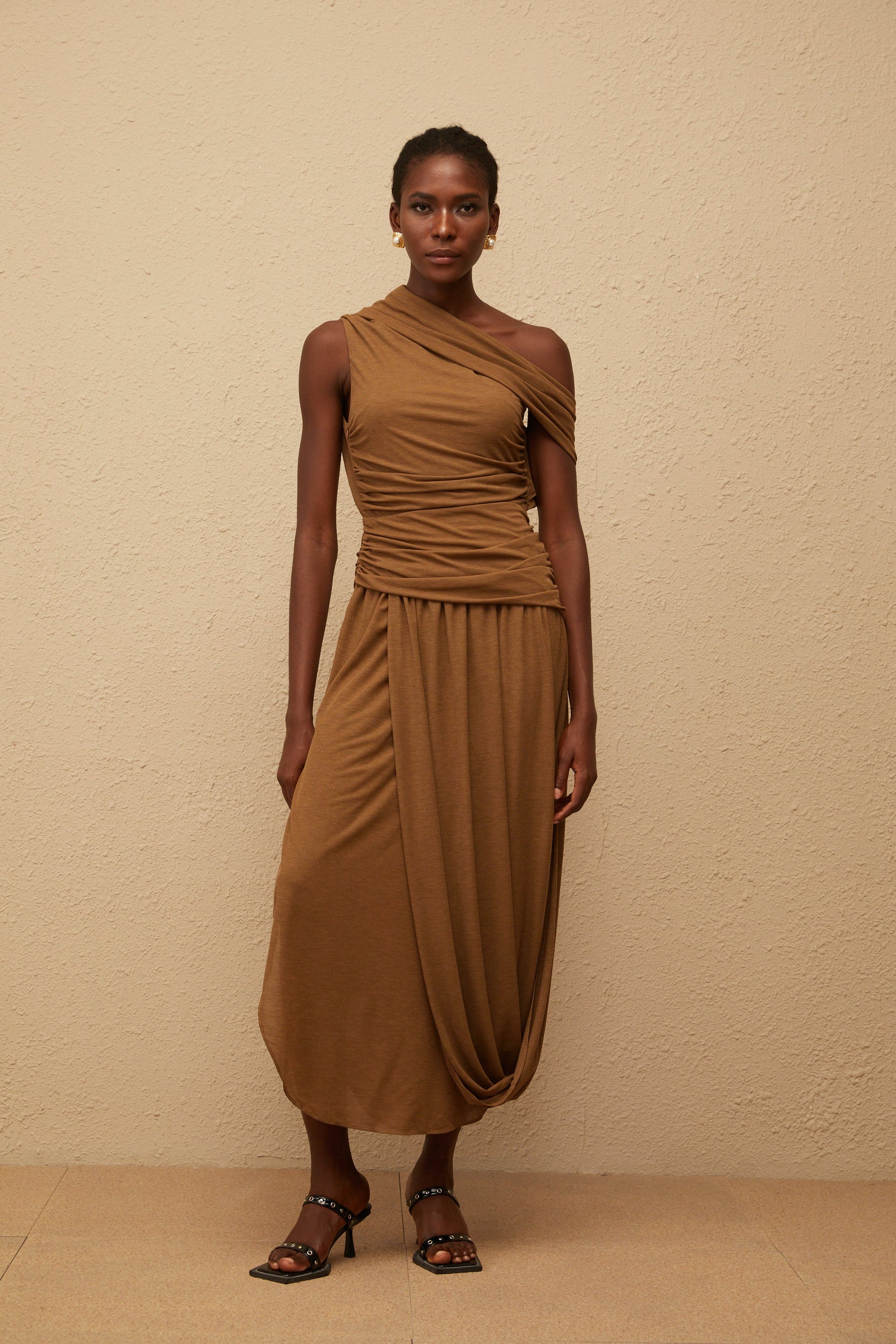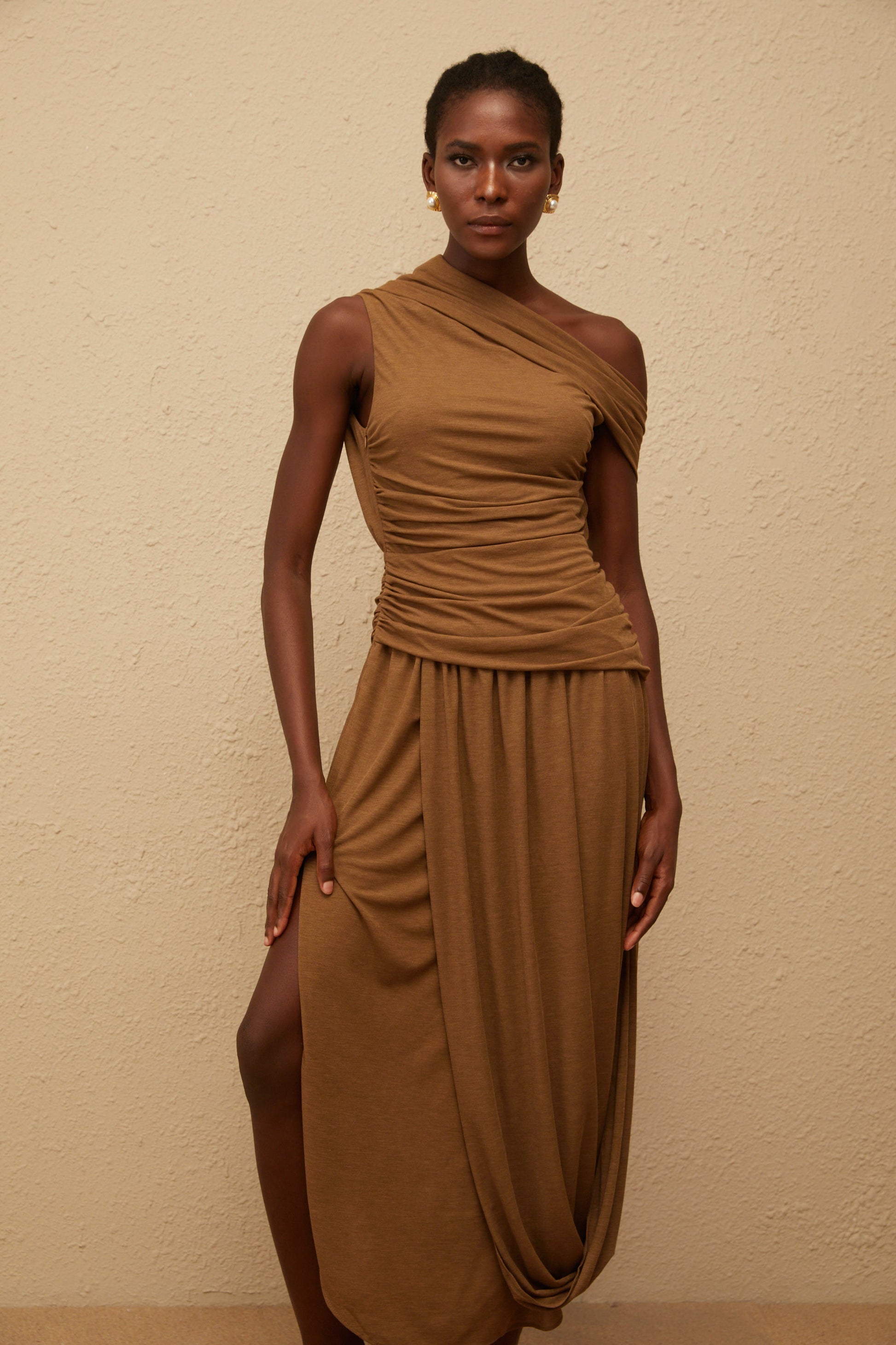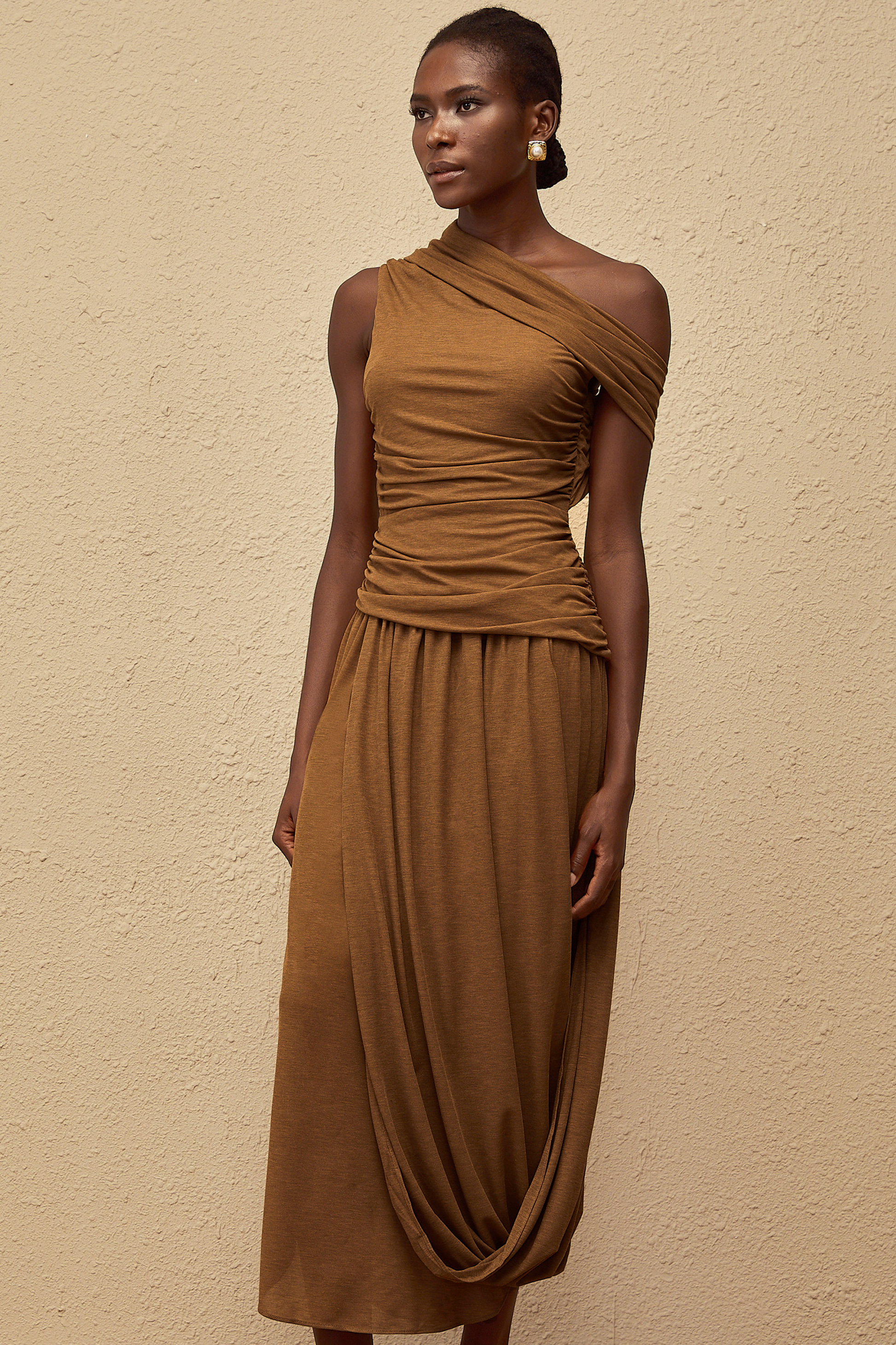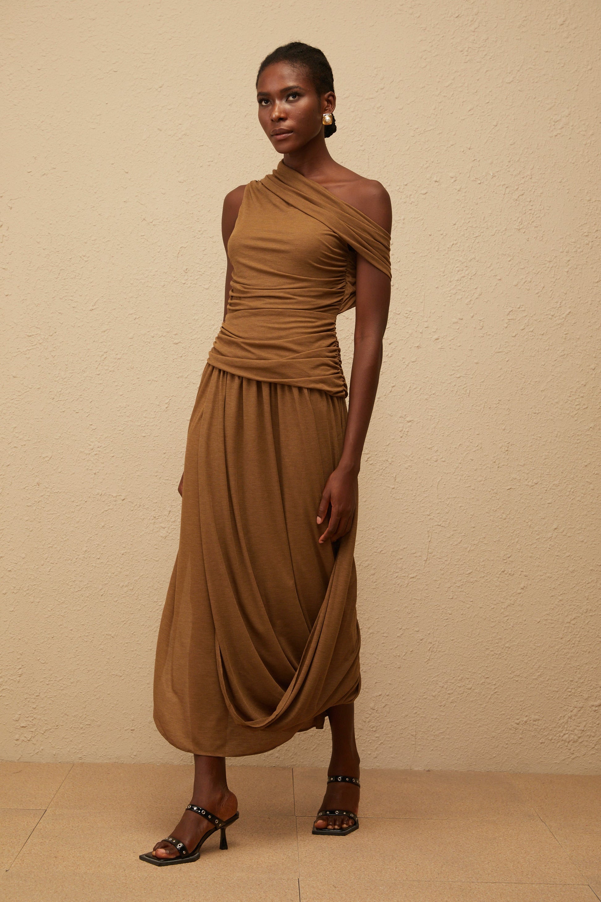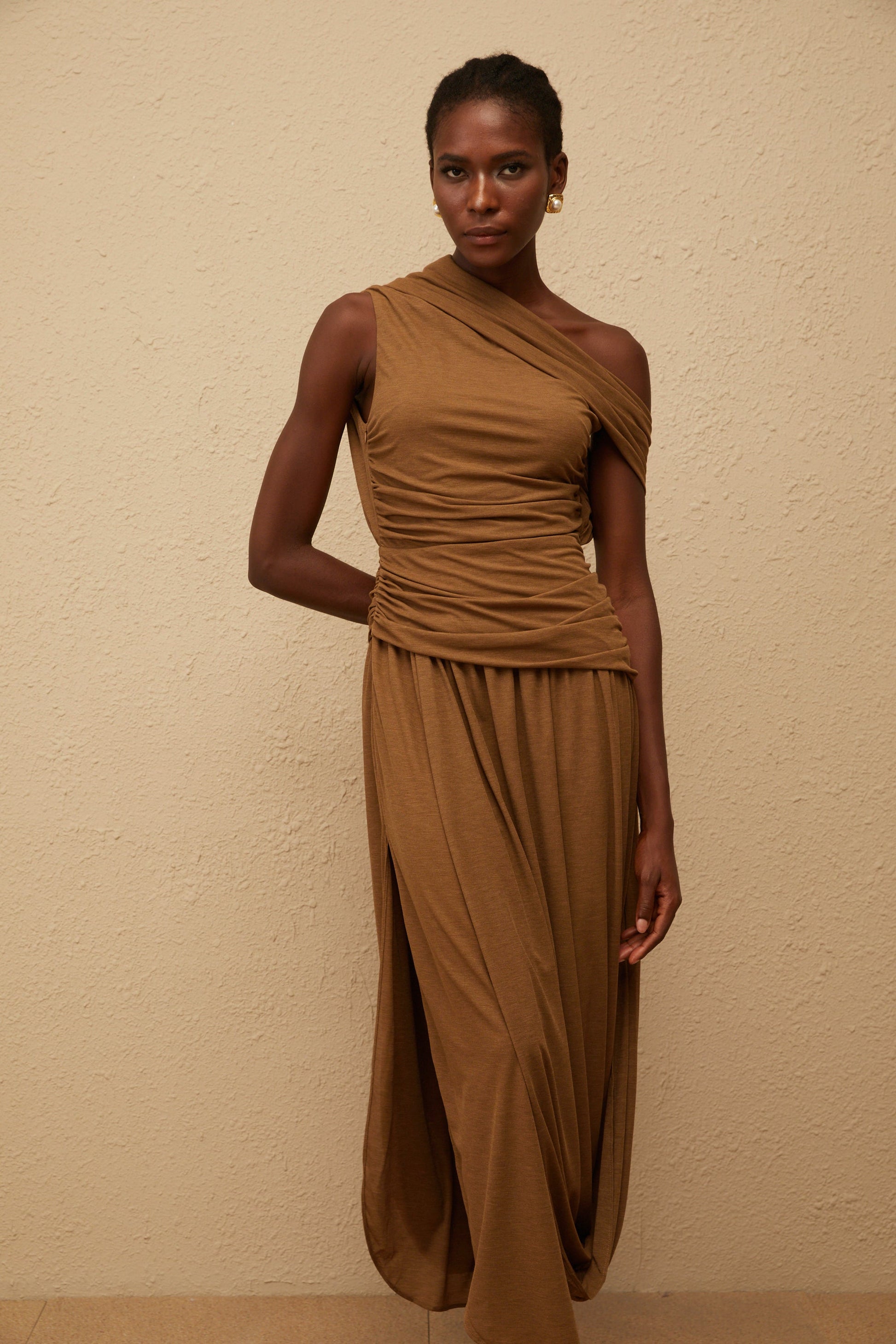 Catarina Brown Asymmetrical Ruched Maxi Dress