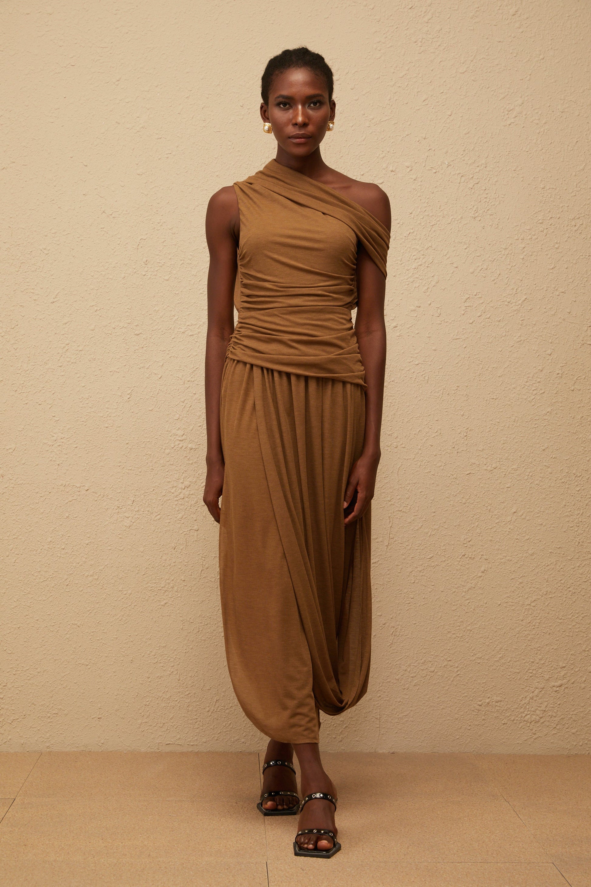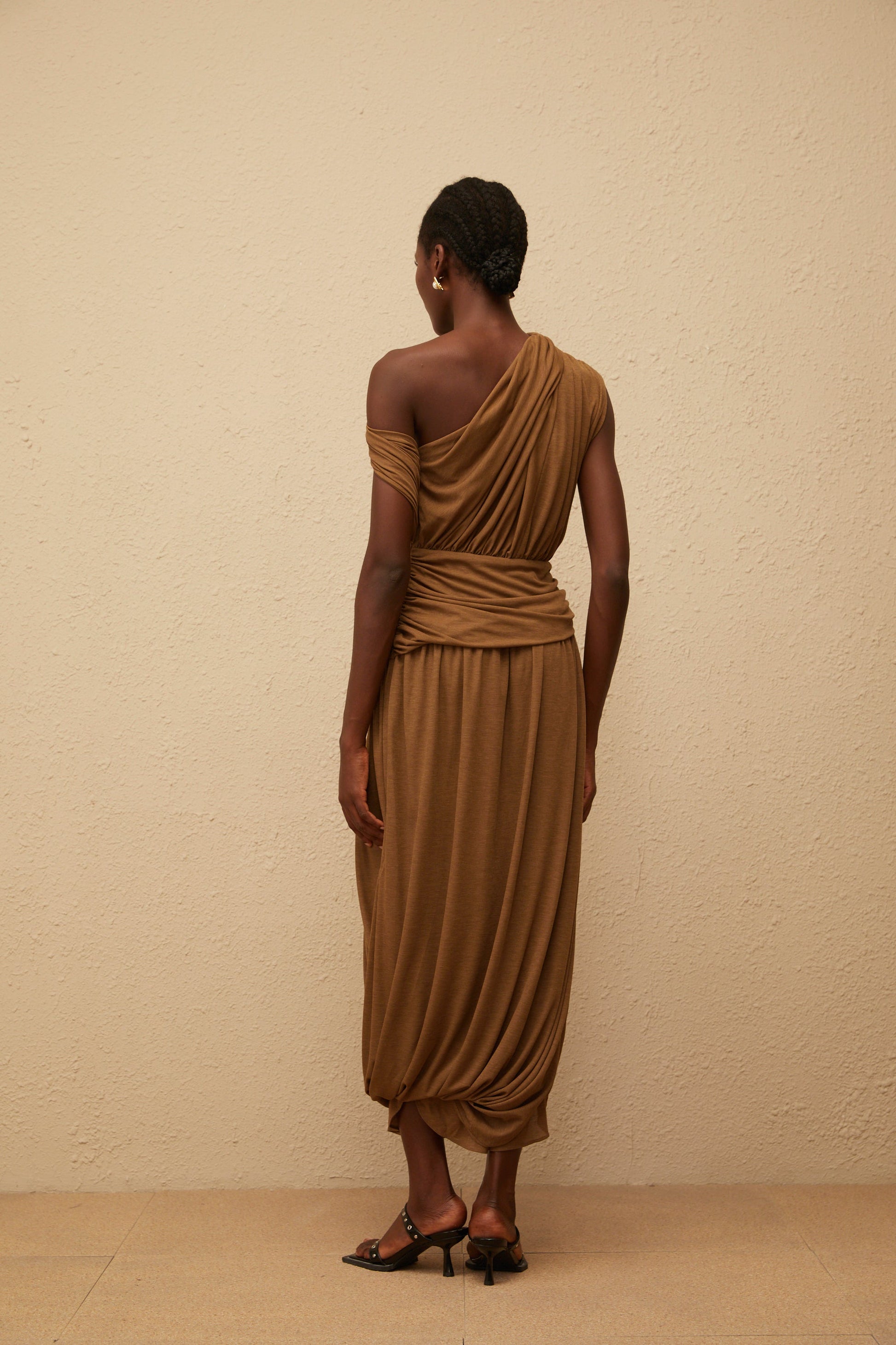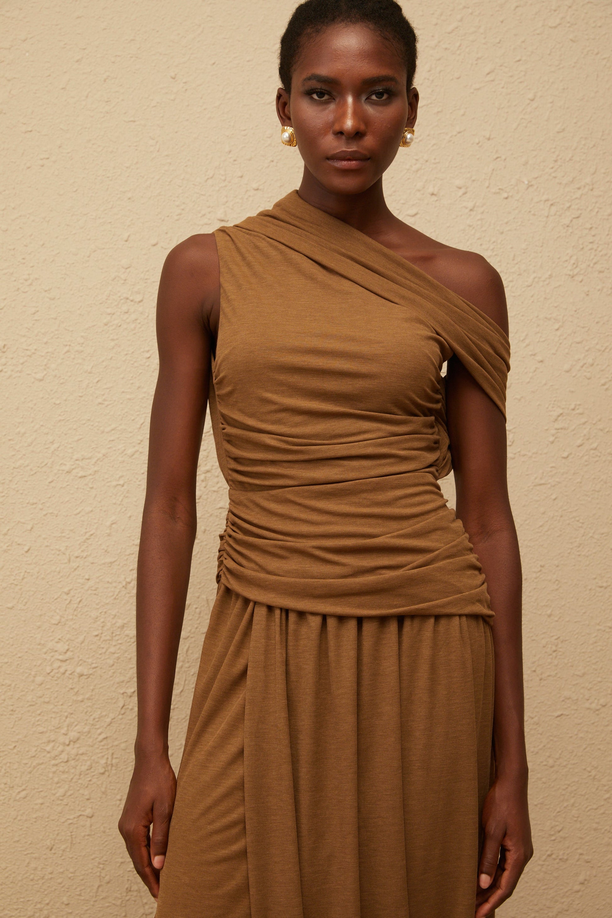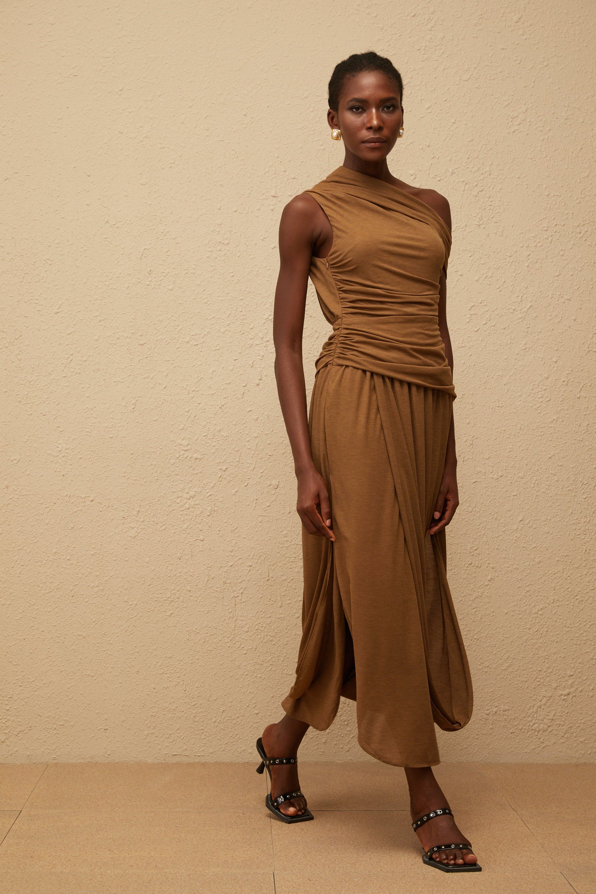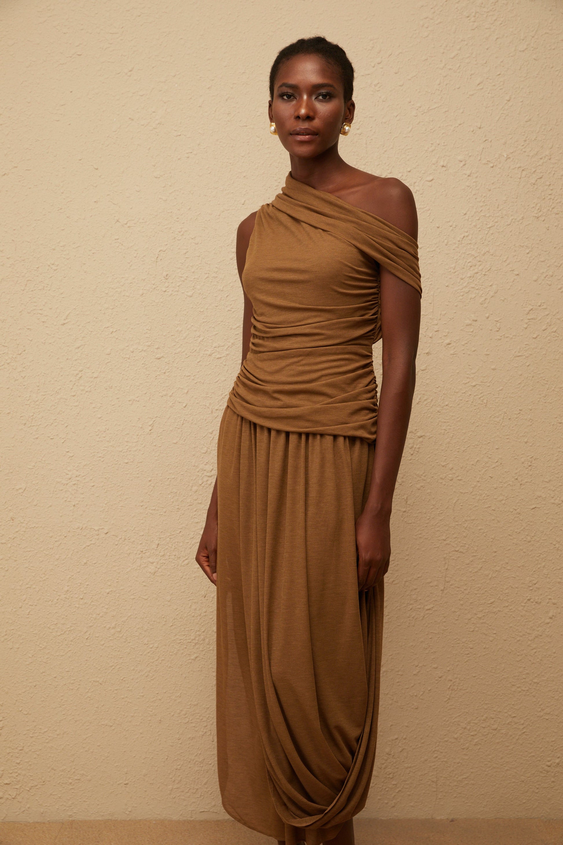 Catarina Brown Asymmetrical Ruched Maxi Dress