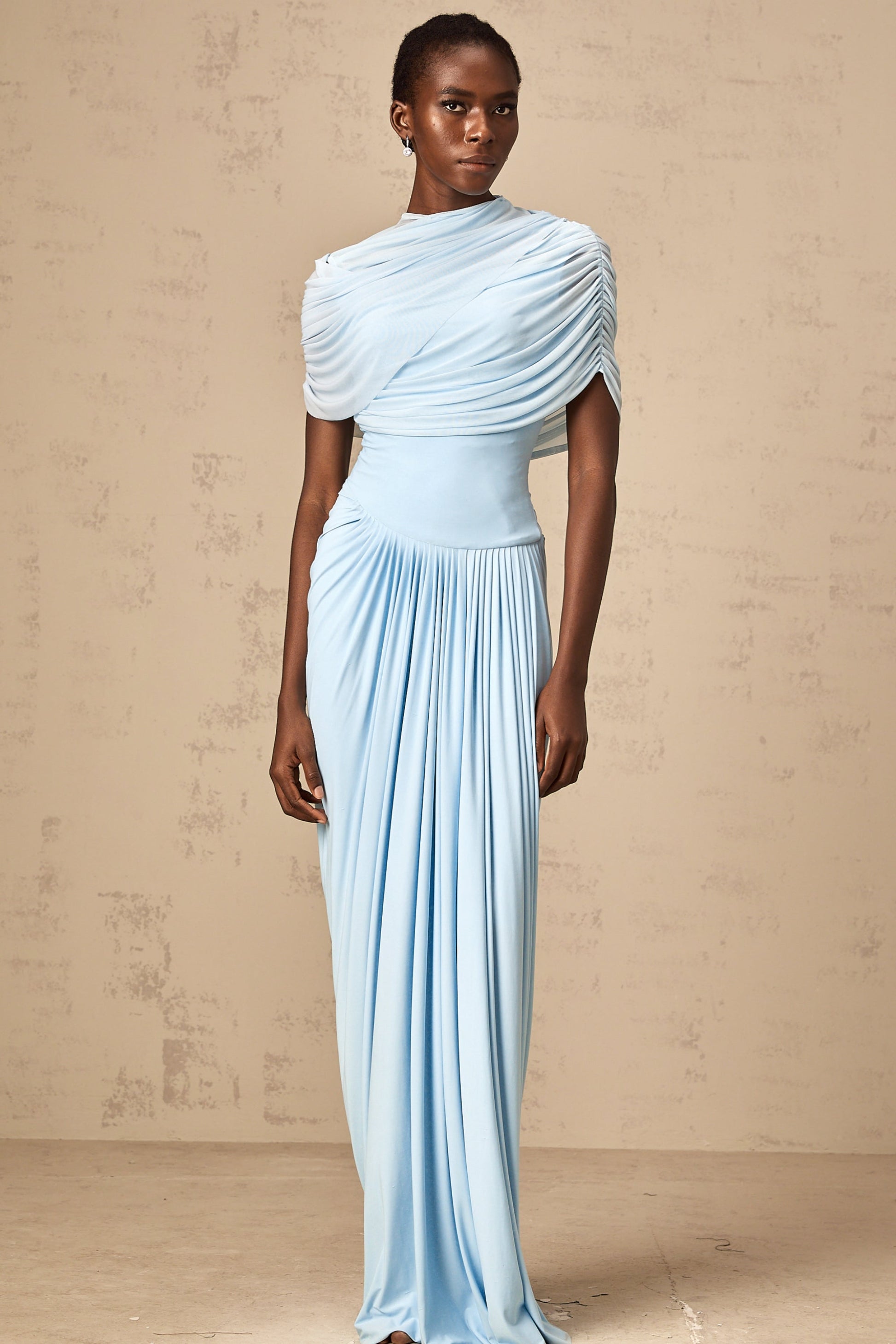 Catherine asymmetrical pleated maxi dress in Baby-blue