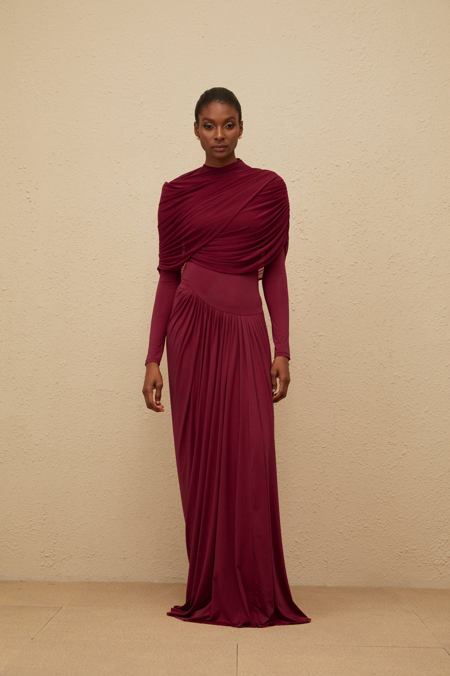 Catherine Red Asymmetrical Pleated Long-Sleeve Maxi Dress