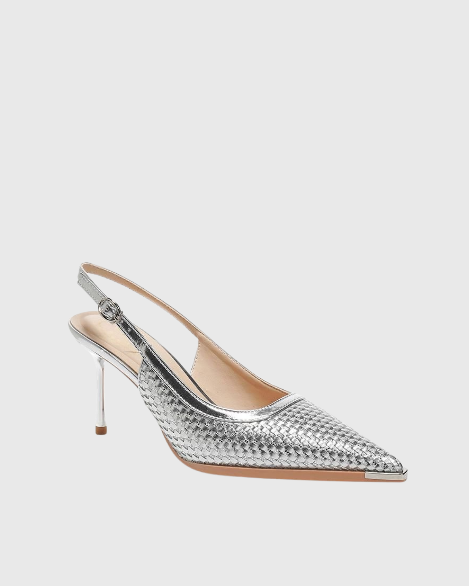 Experience luxury and style with our Cecily Woven Slingback Pumps in Silver! Featuring a beautifully crafted silver woven design, these slingbacks are perfect for any occasion. Elevate your outfit and step into comfort with these stunning pumps. Indulge in the ultimate shoe experience today!