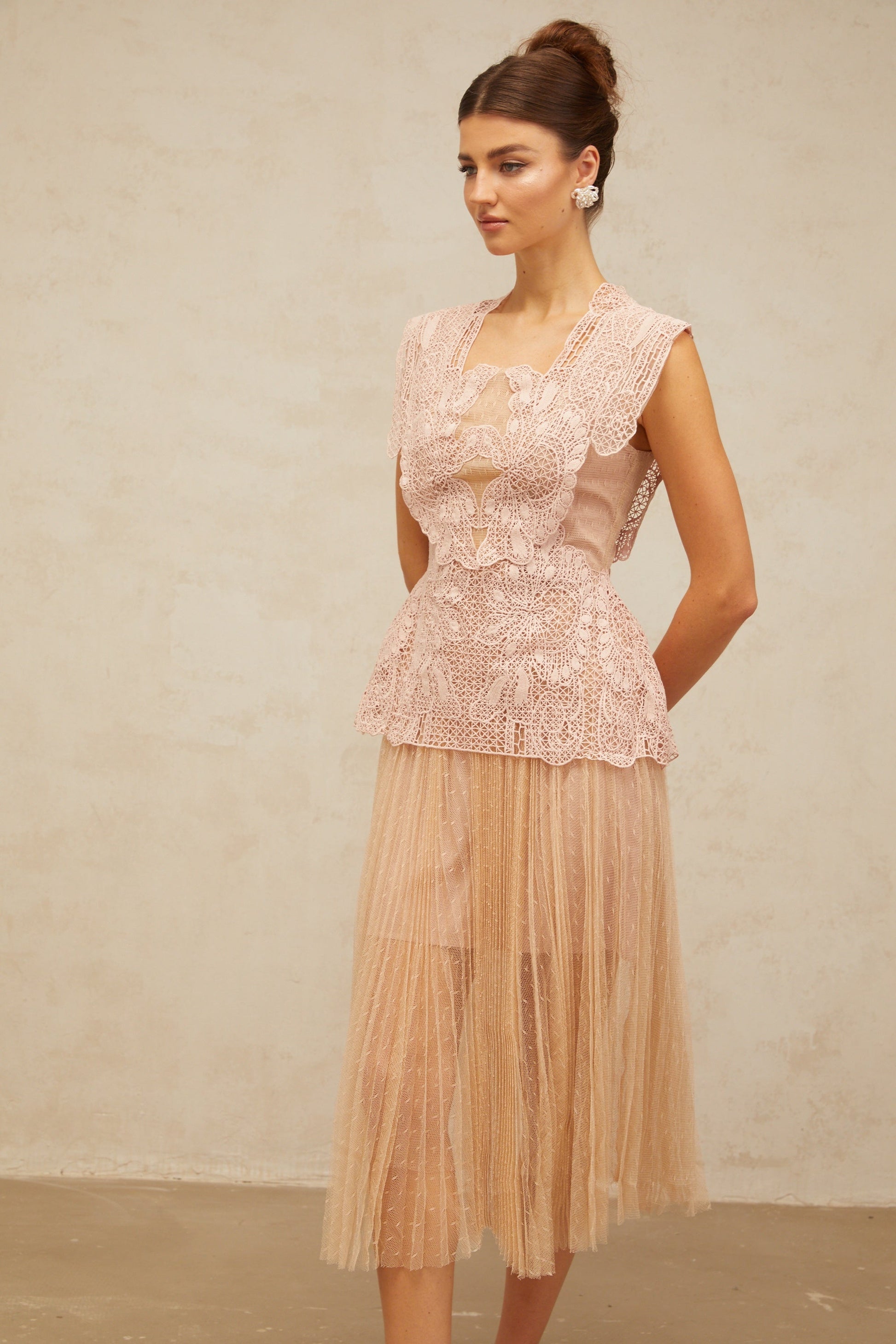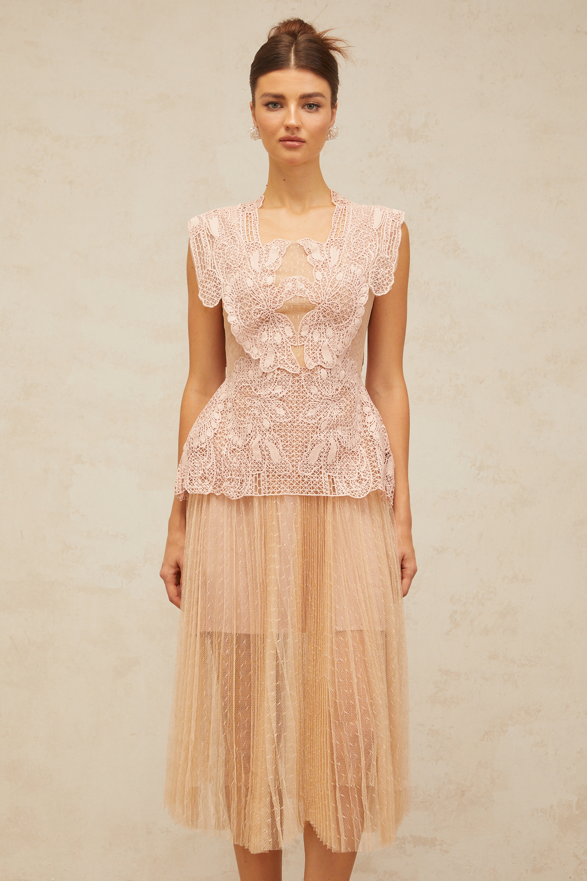 Céleste floral-lace-panelling tulle midi dress in Pink