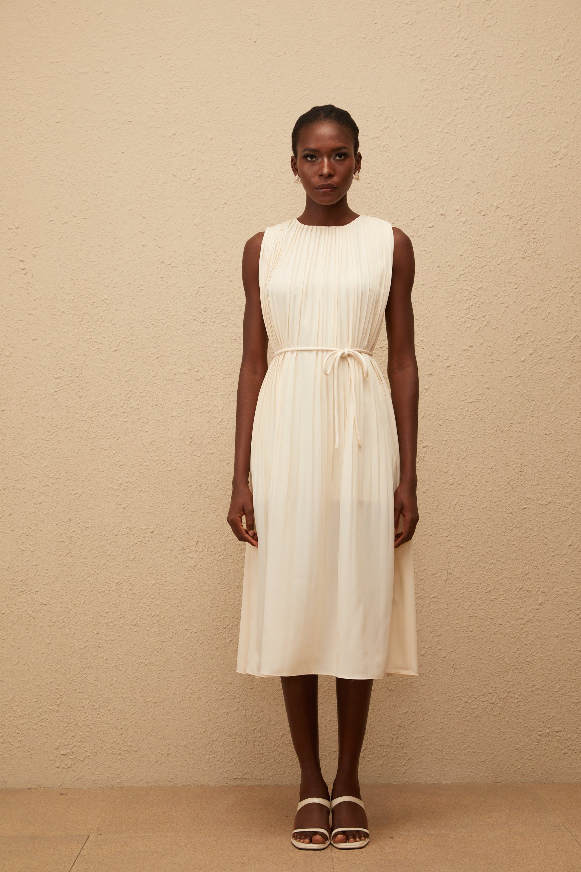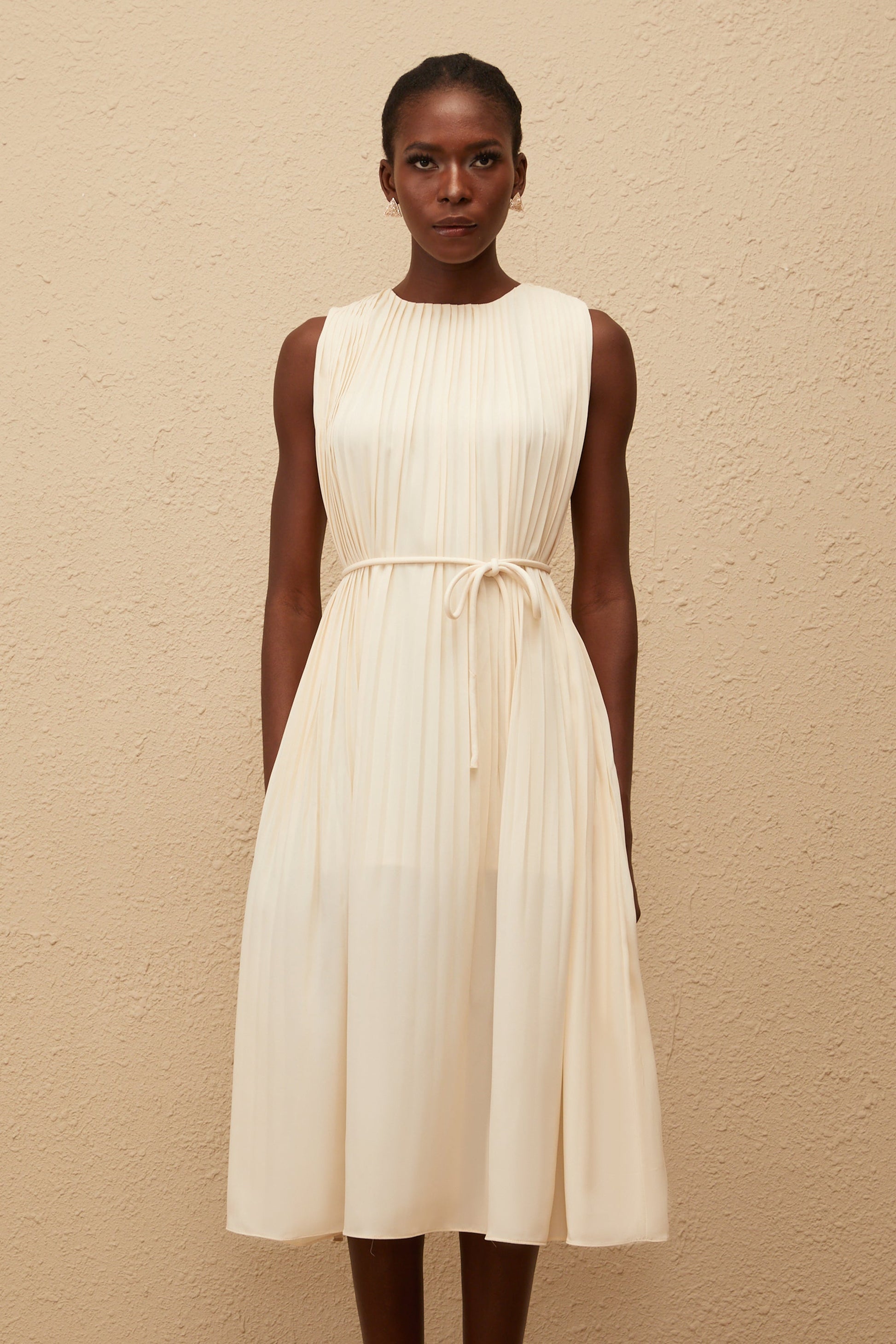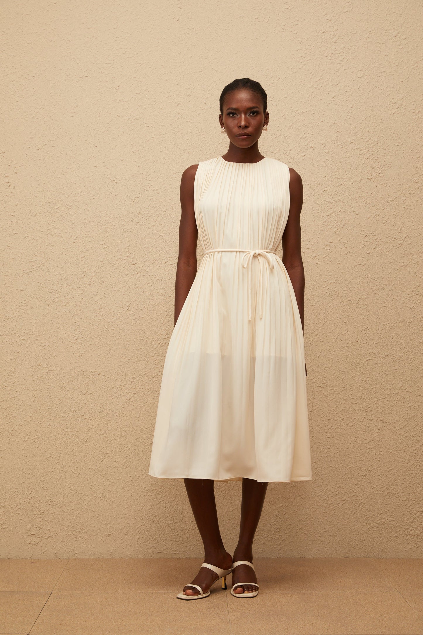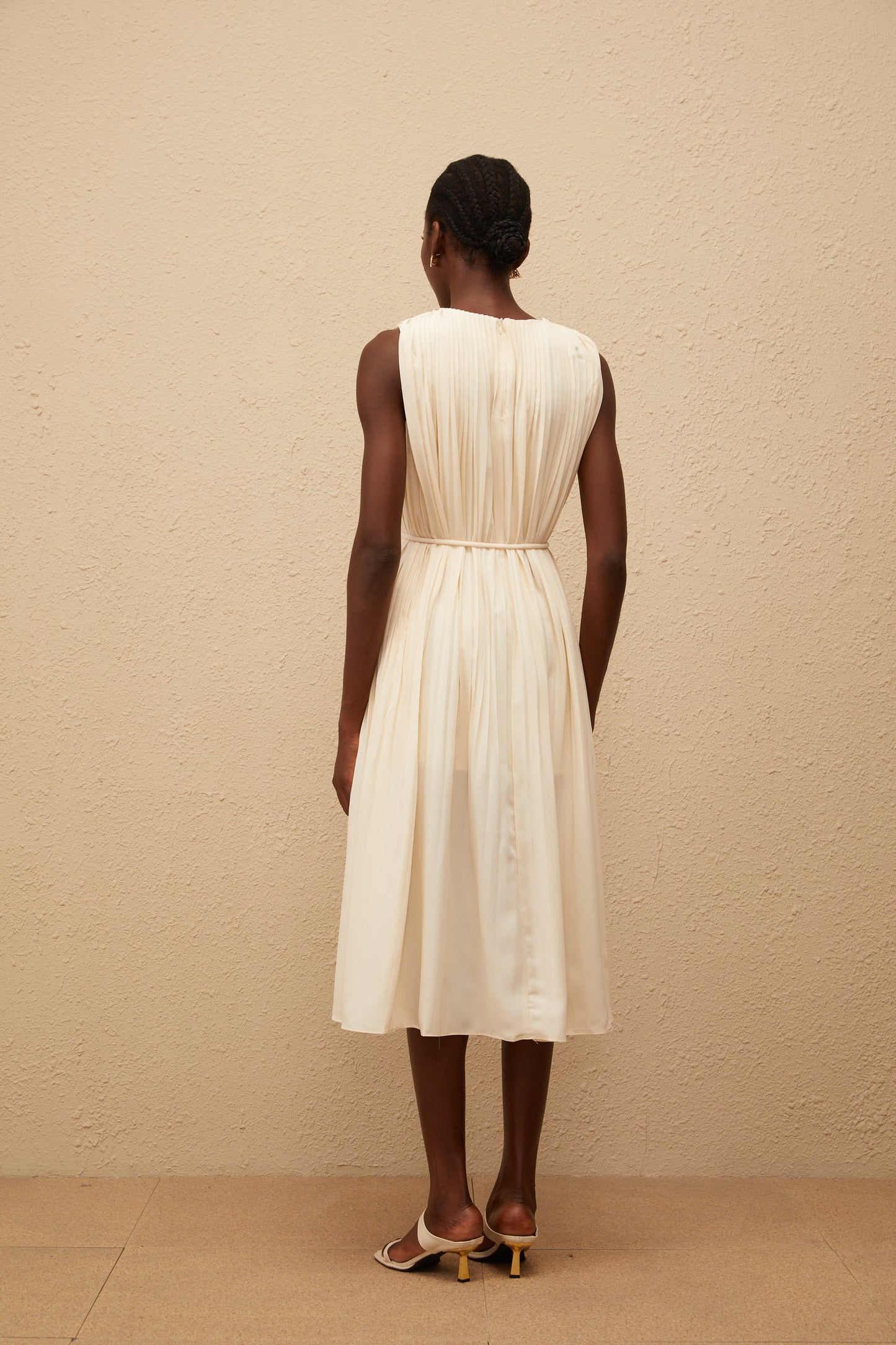 Célestine Neutral Sleeveless Pleated Midi Dress