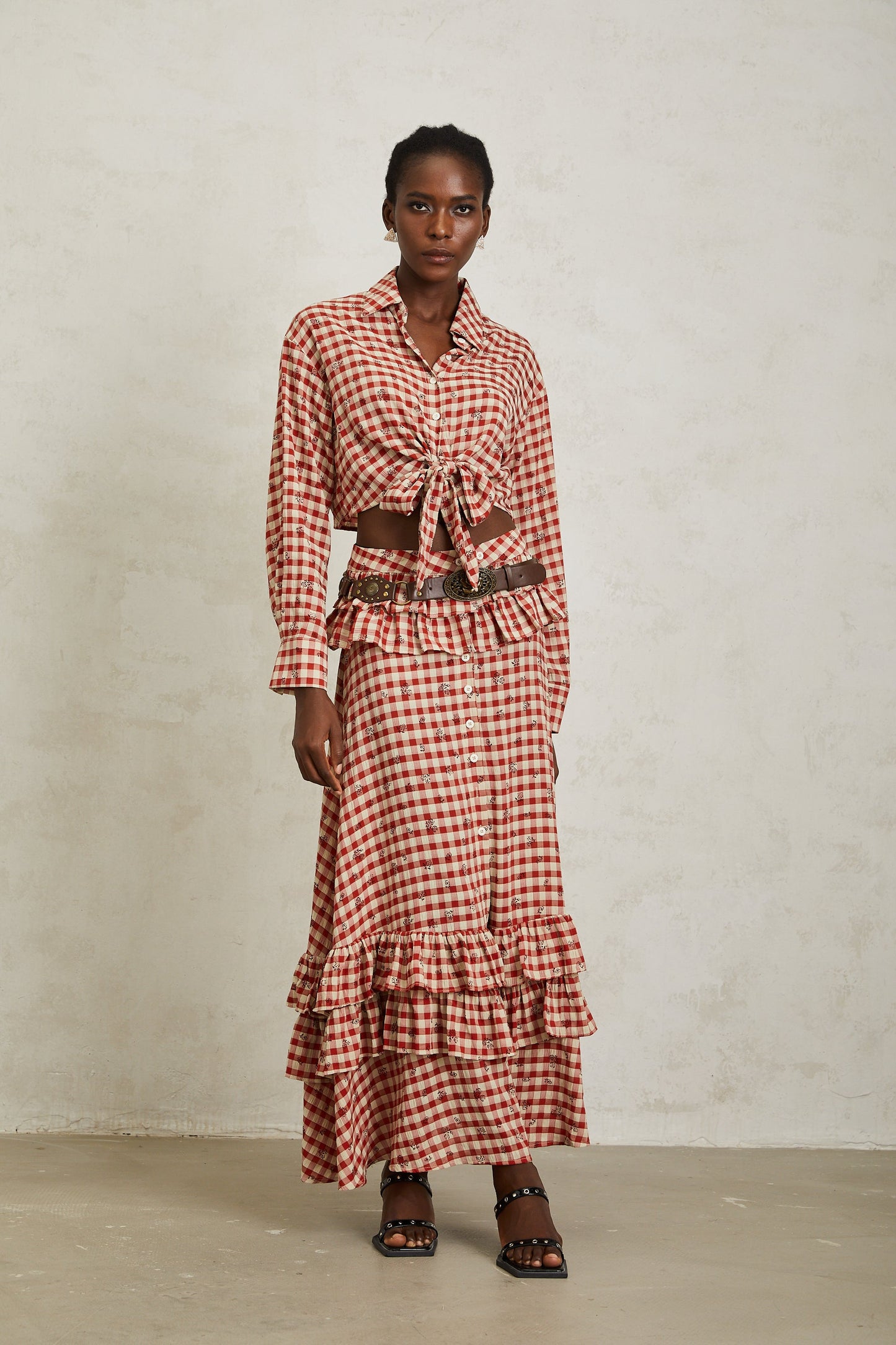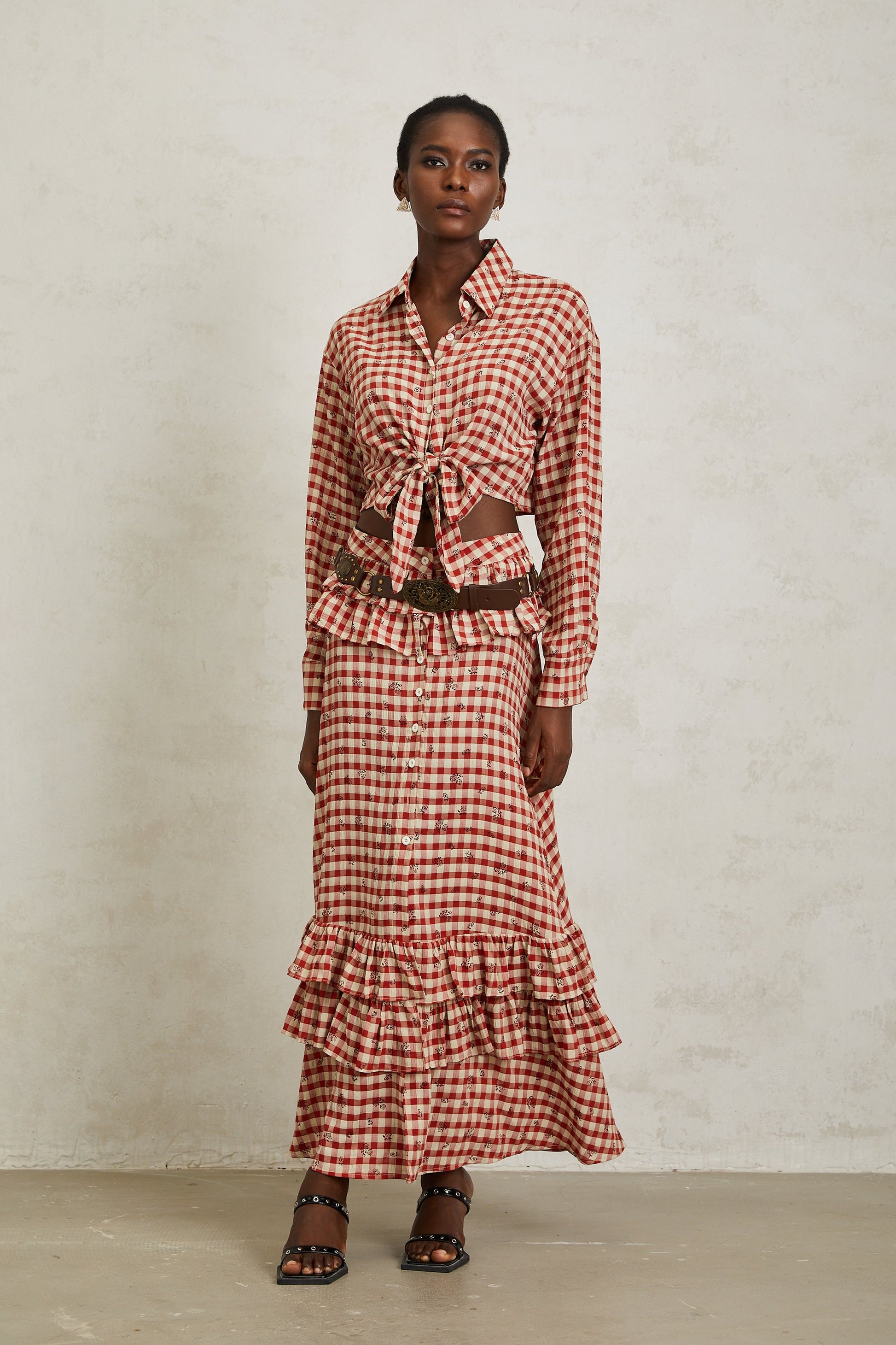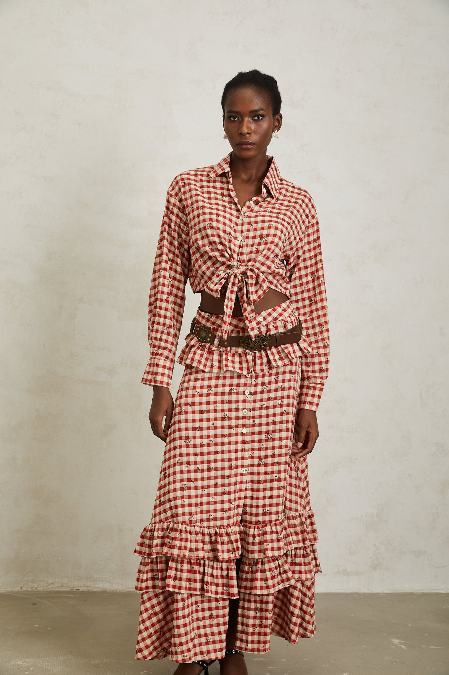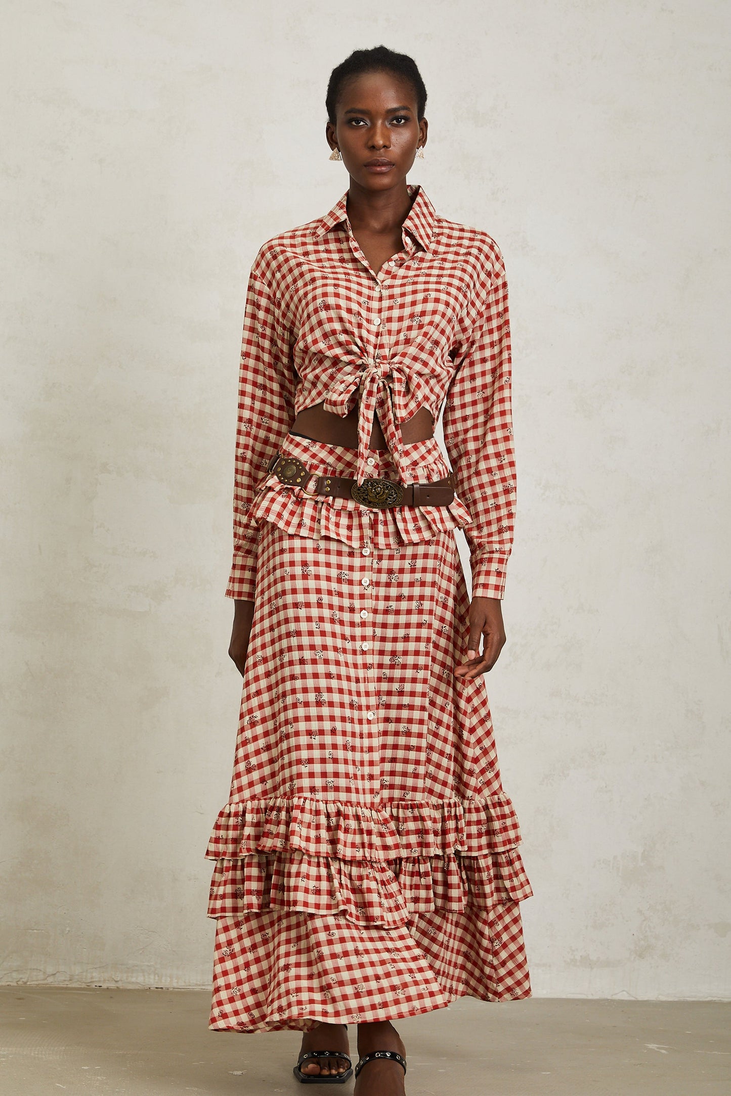 Céline Red Rose Print Plaid Shirt & Skirt Set