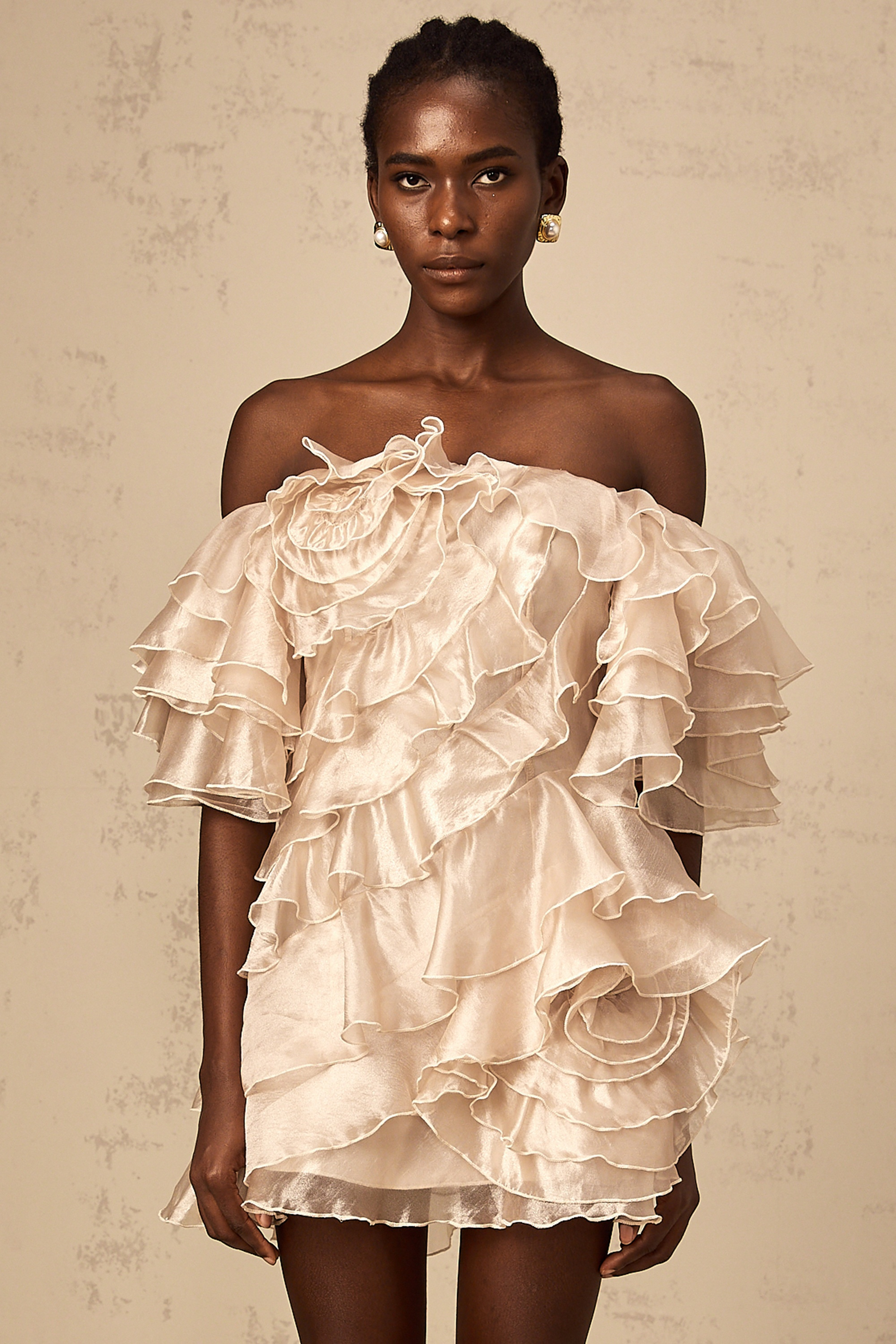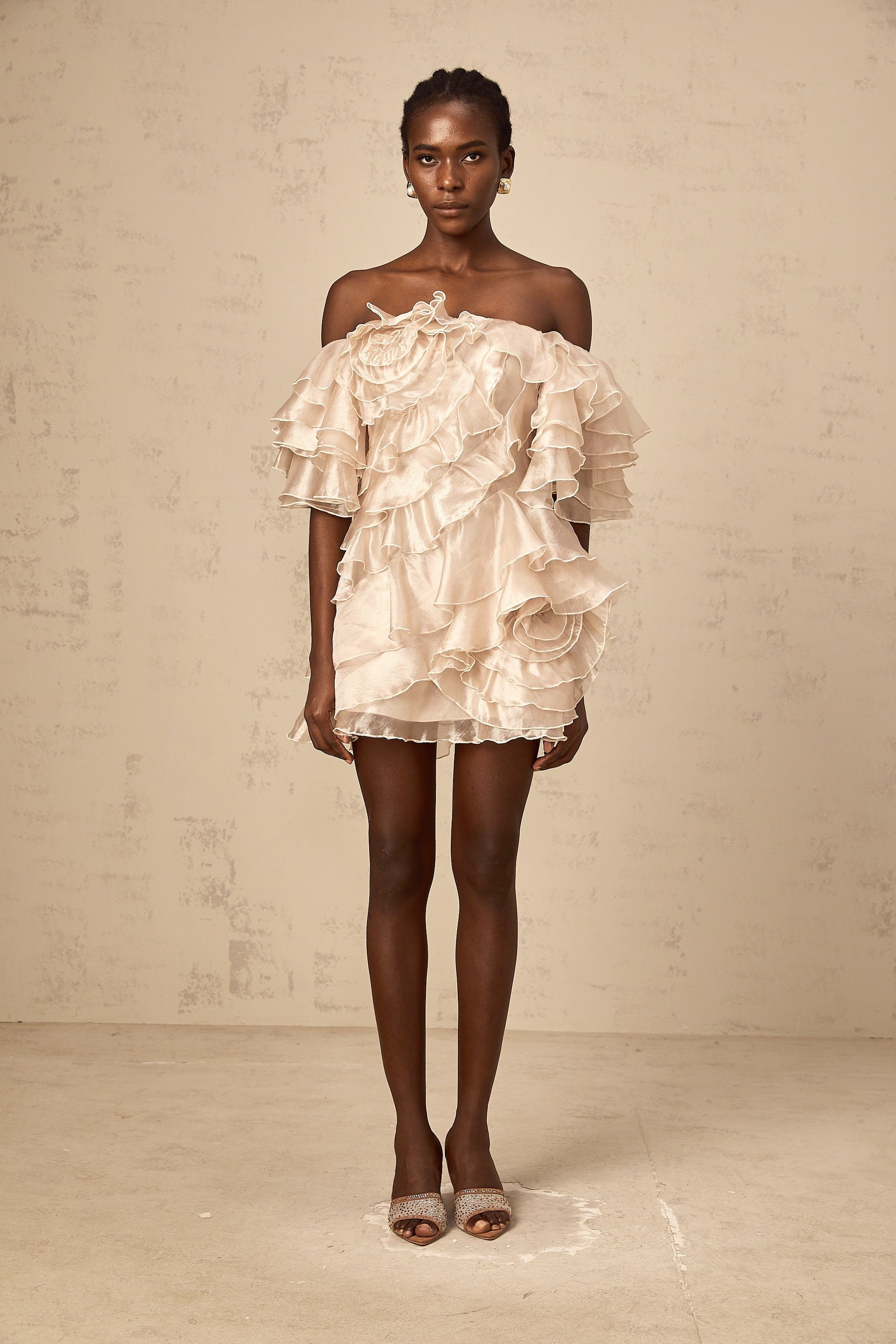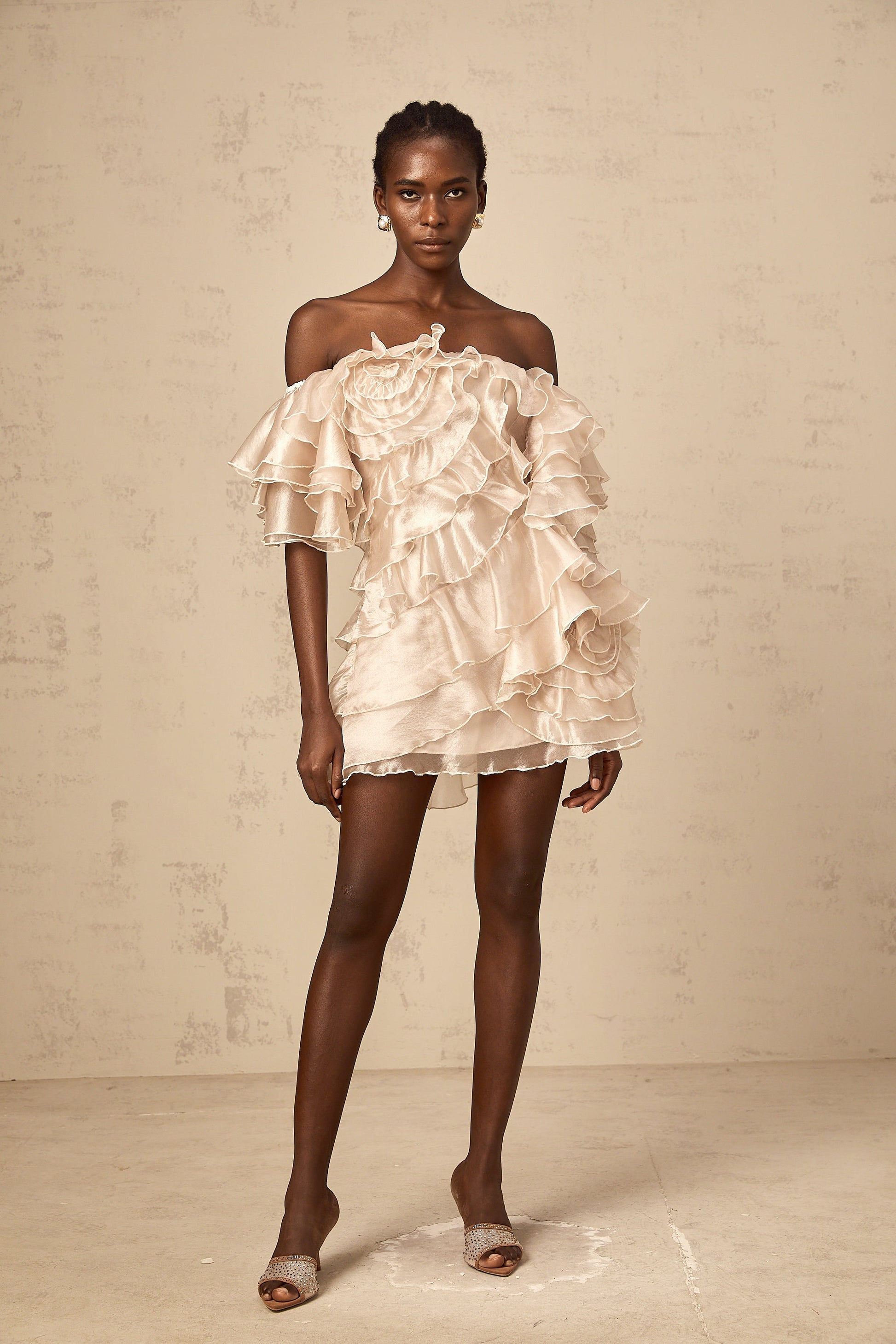 Cerise asymmetrical flounce mini dress in Neutrals
