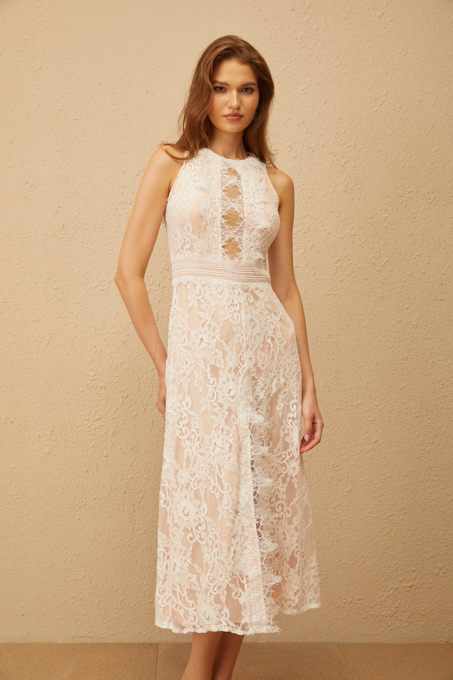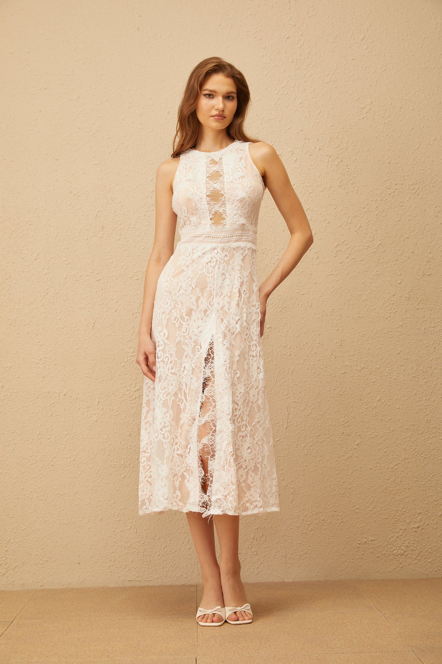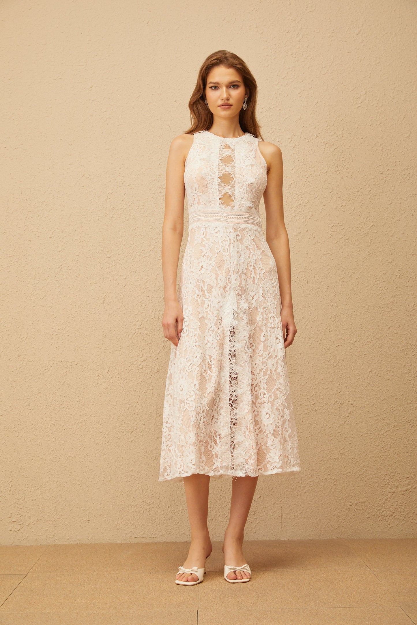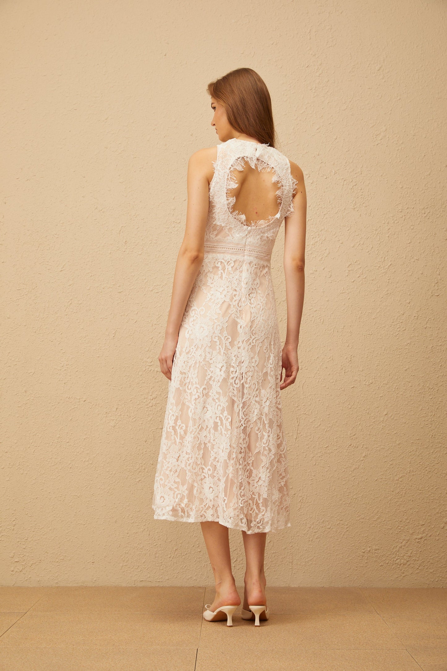 Cerise White Open Back Floral Lace Midi Dress