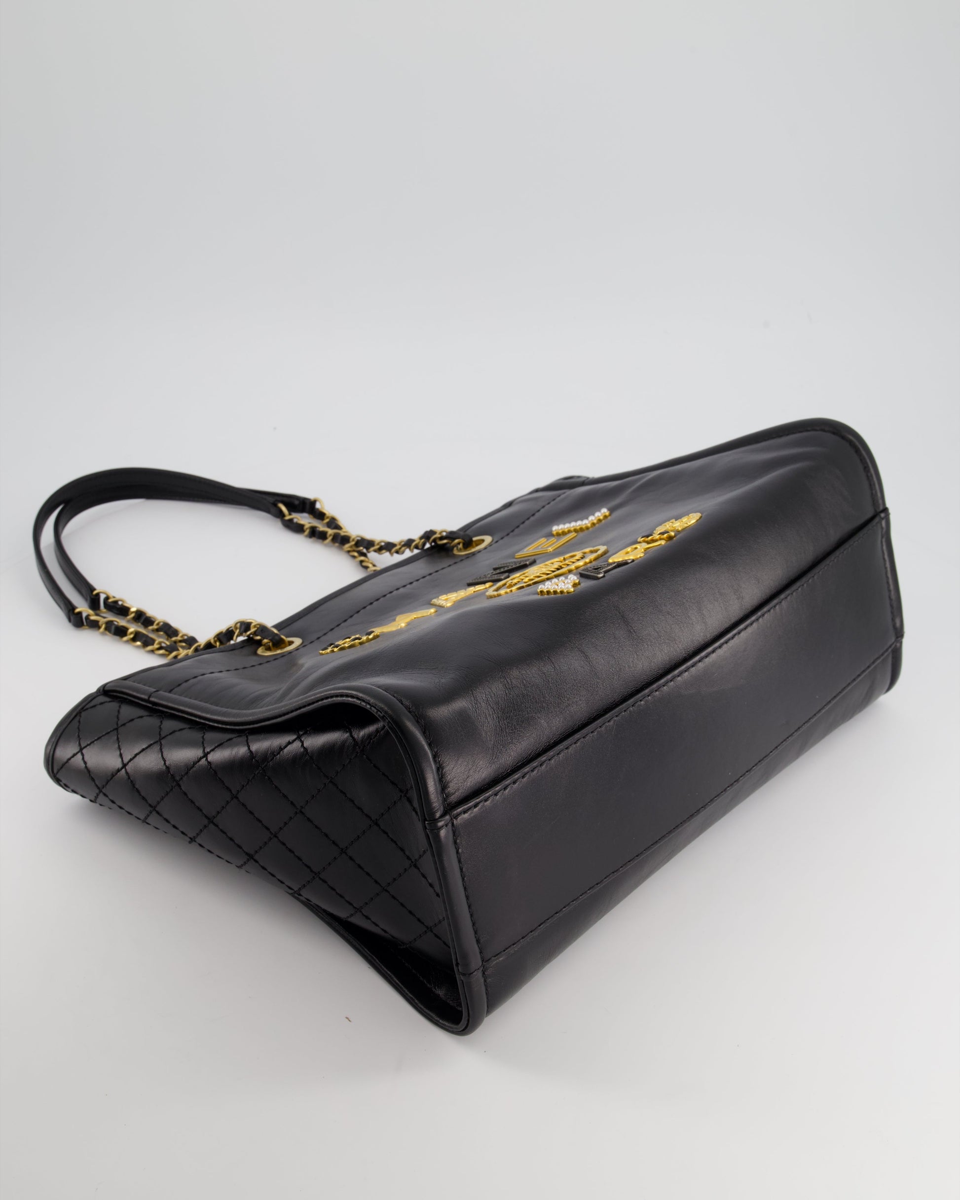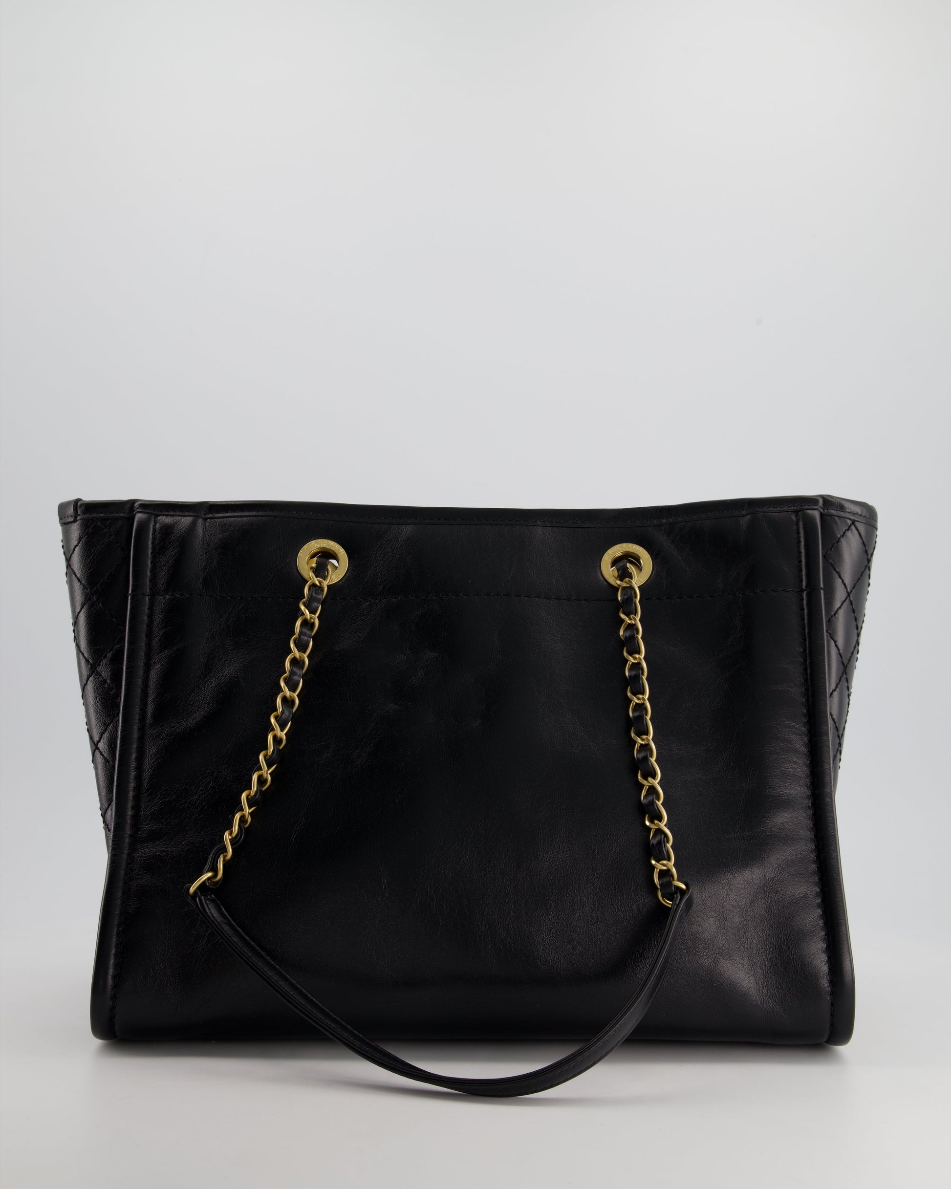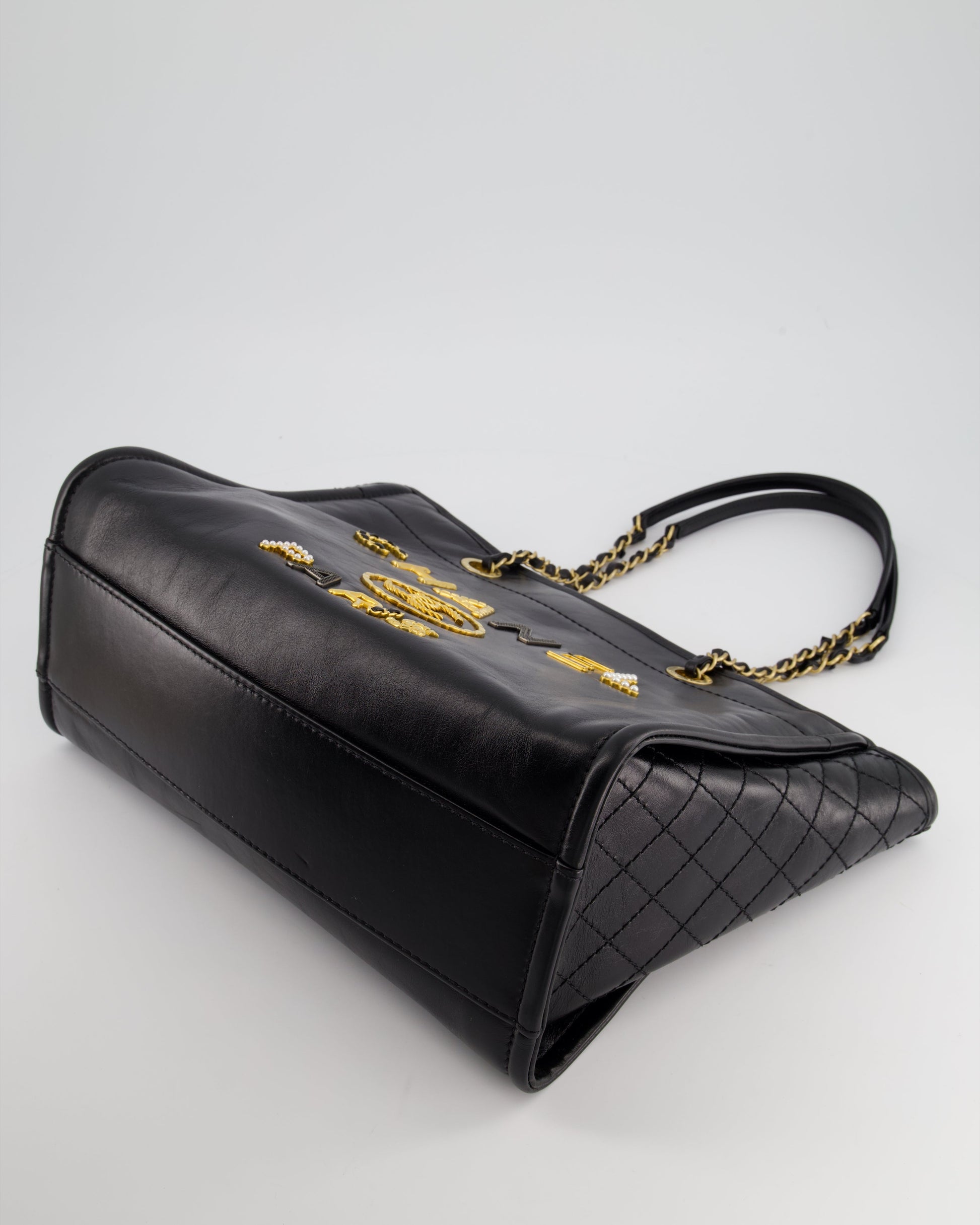 Chanel Black Small Deauville Tote Bag in Shiny Calfskin Leather with Antique Gold Hardware and Pearl, Crystal Logo Detail