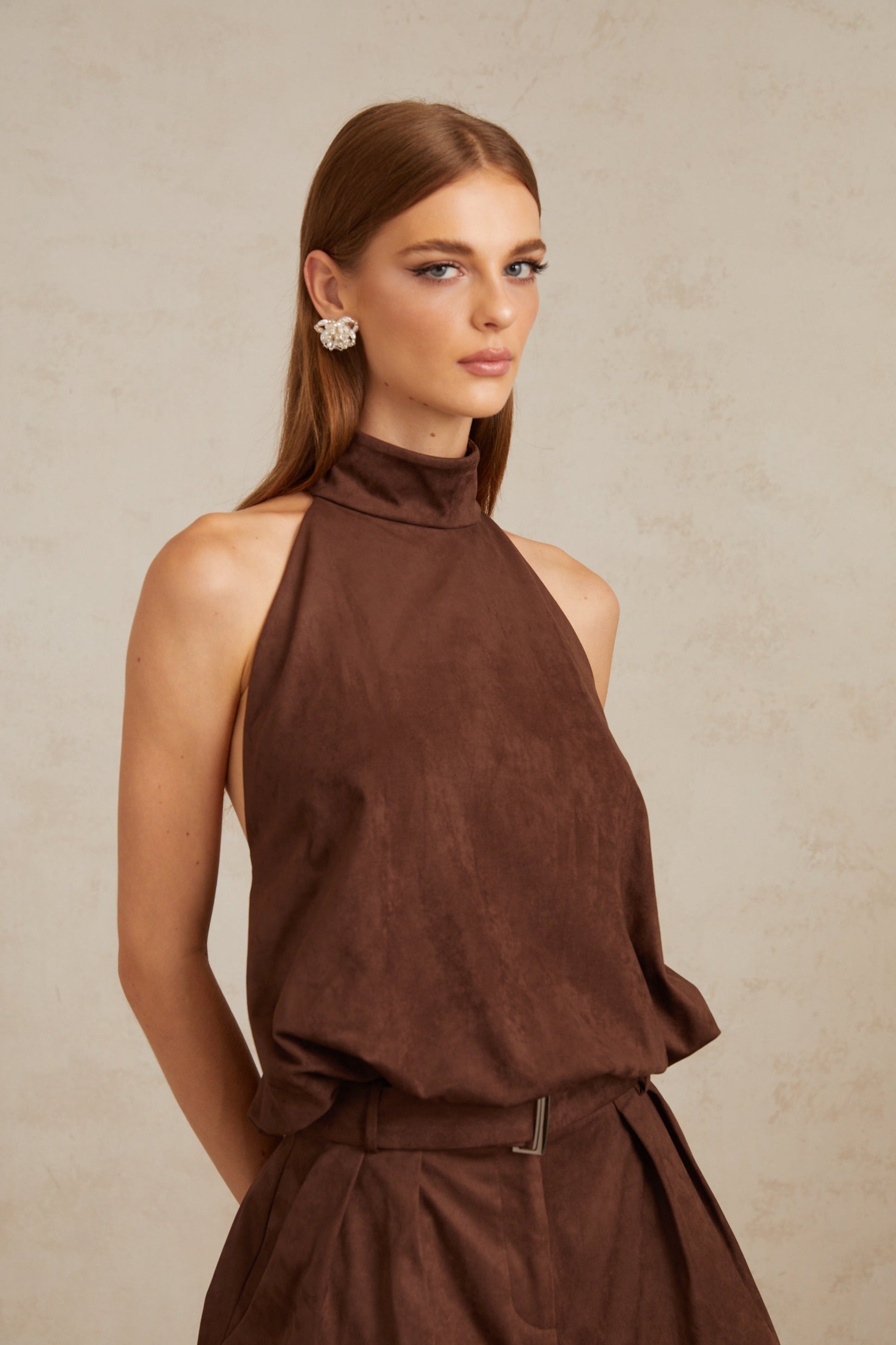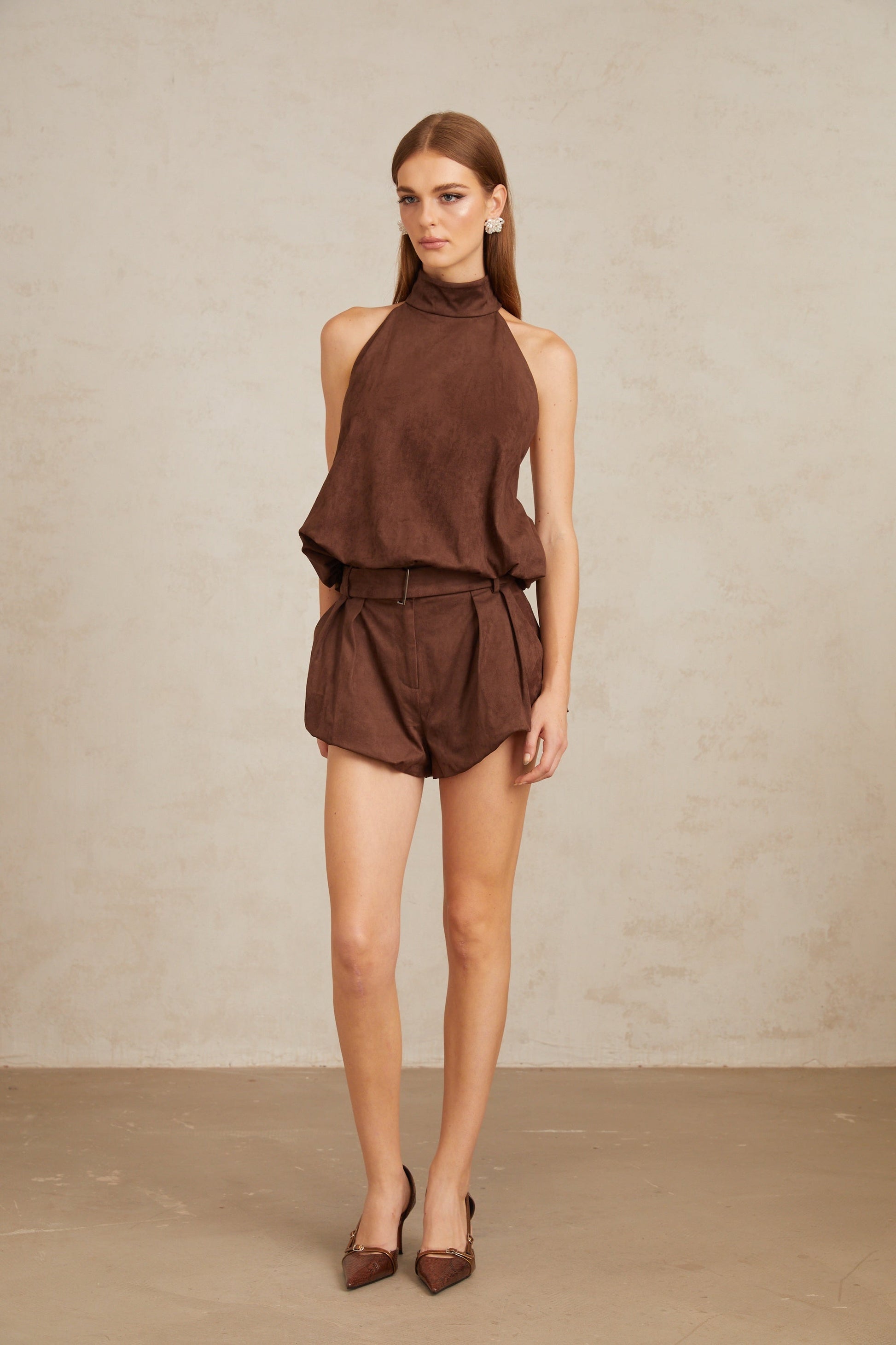 Chaney Brown Suede Bubble Hem Top & Shorts Set