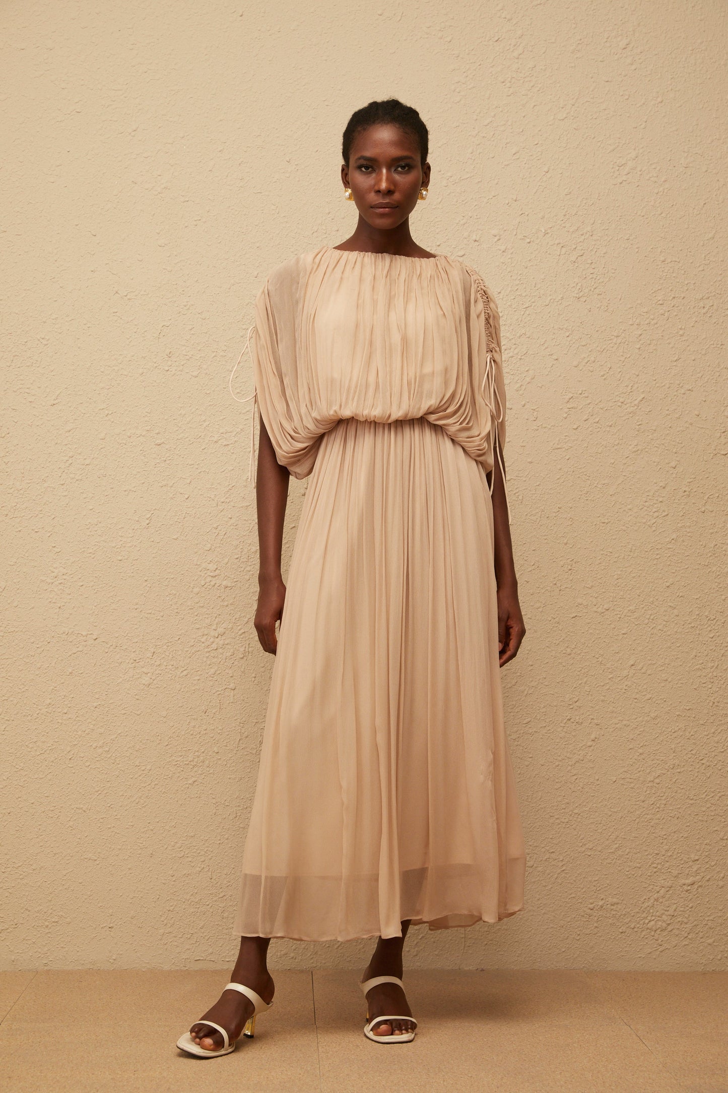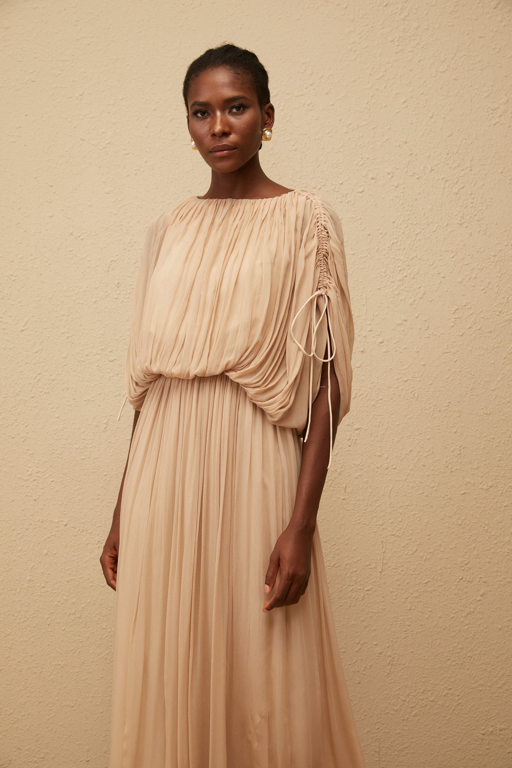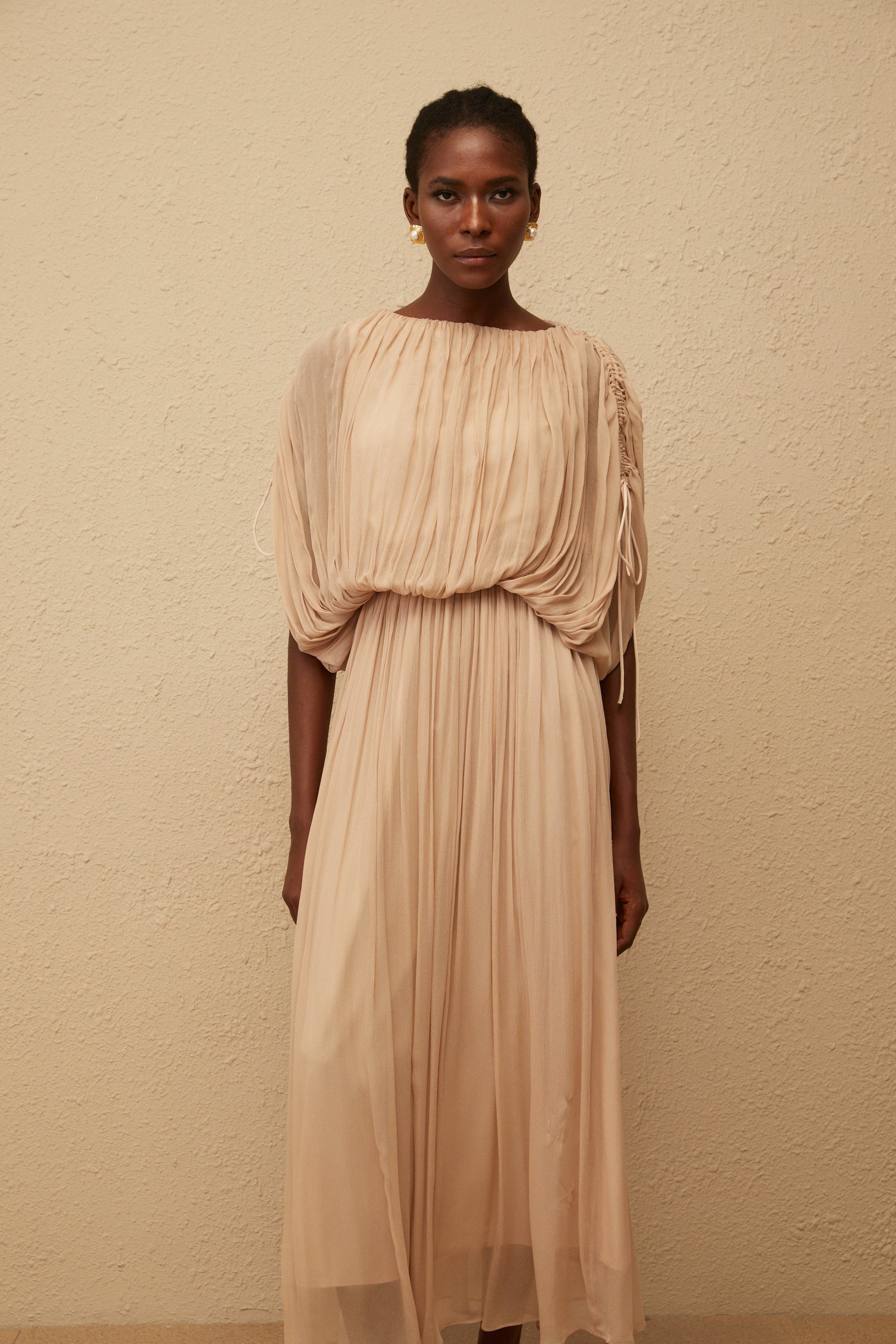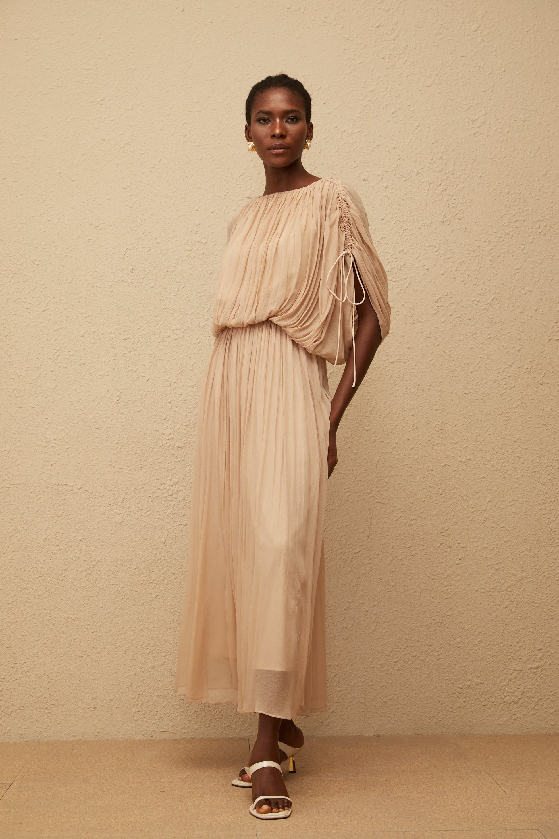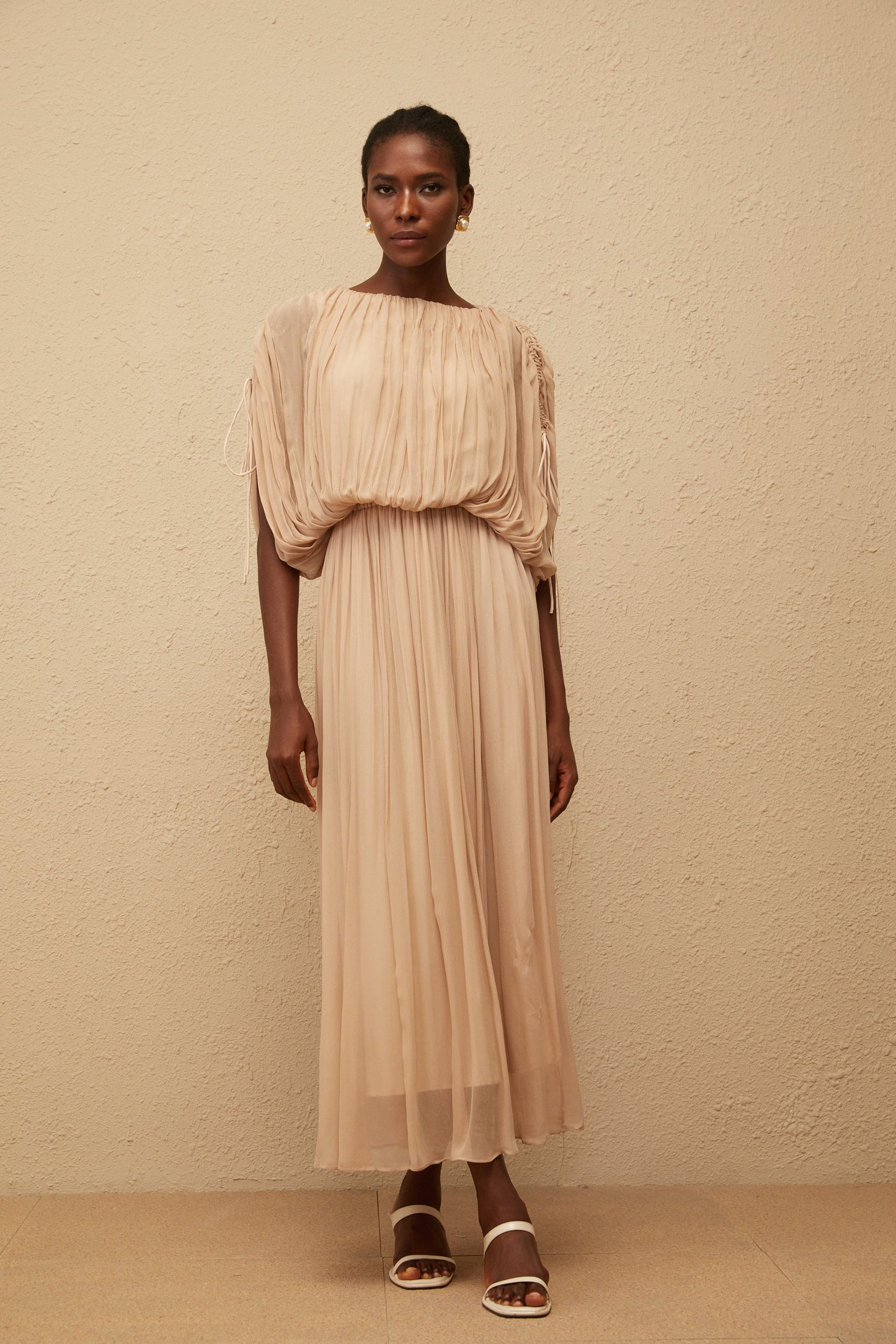 Charitina Neutral Fully Pleated Blouse & Skirt Set