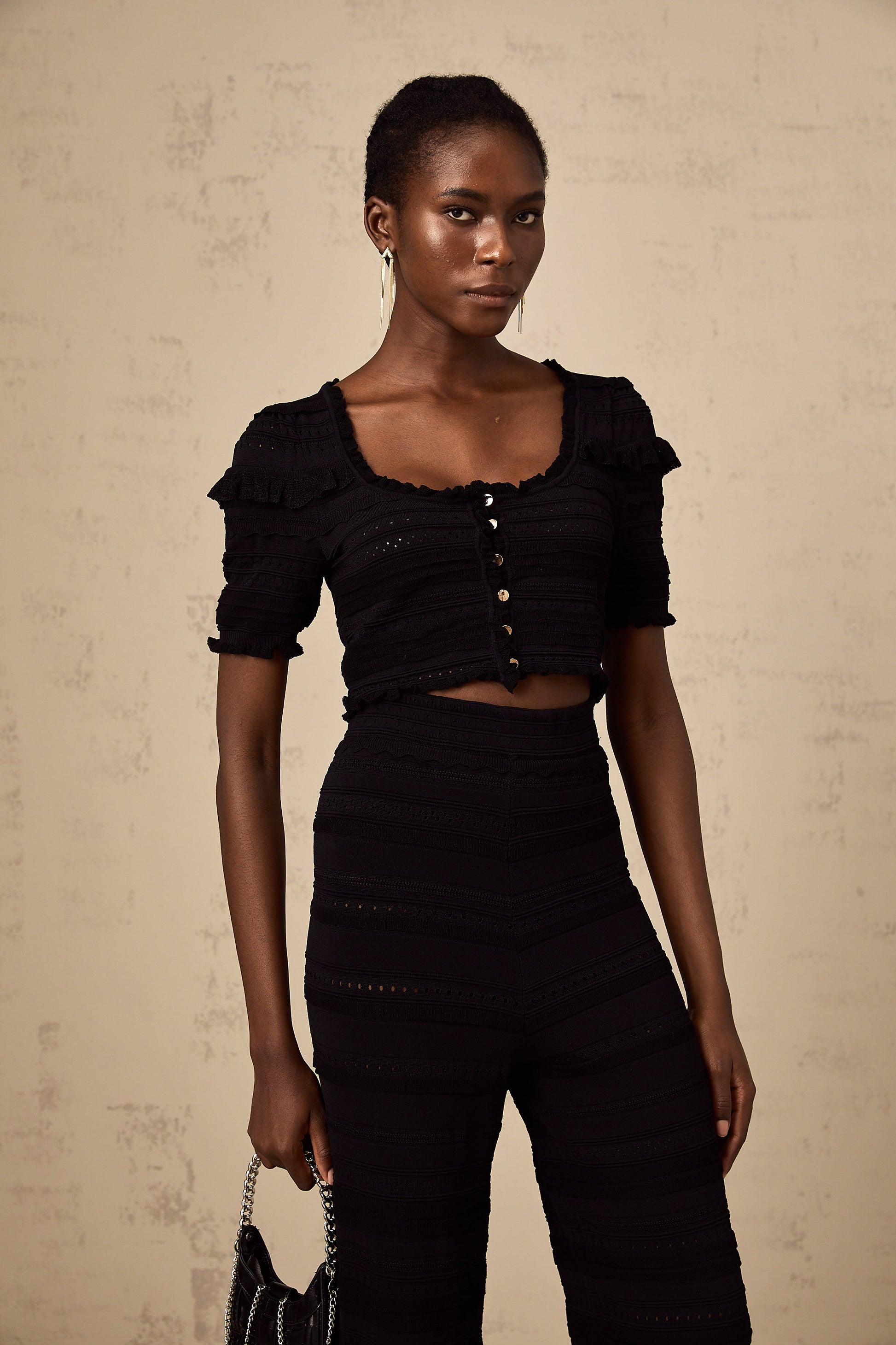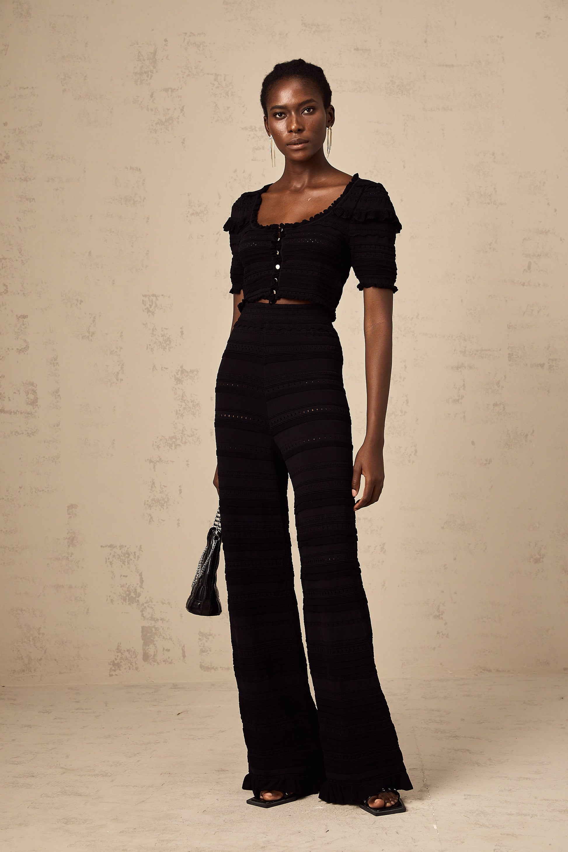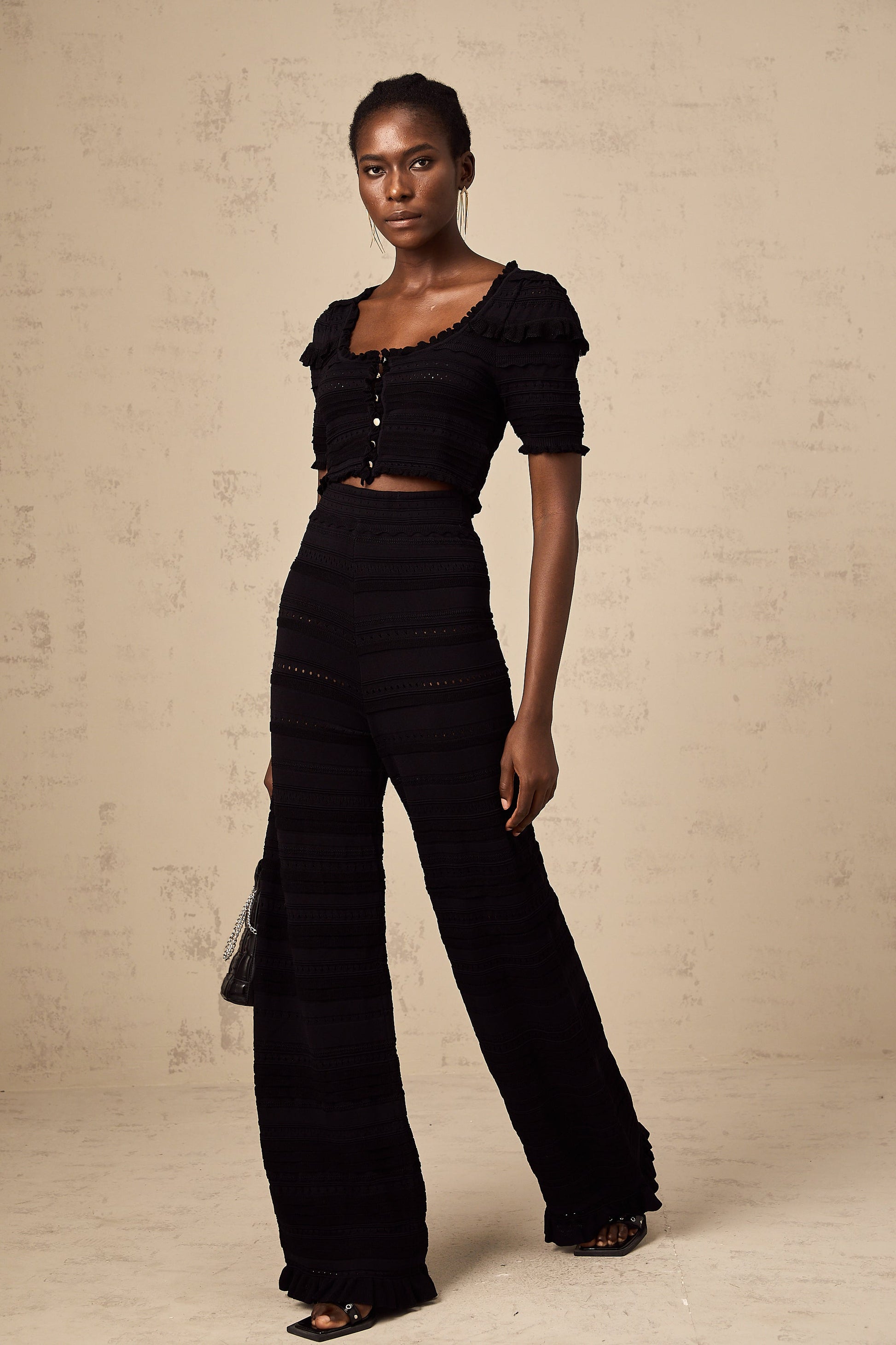 Charlotte black knitted ruffled top & trousers matching set